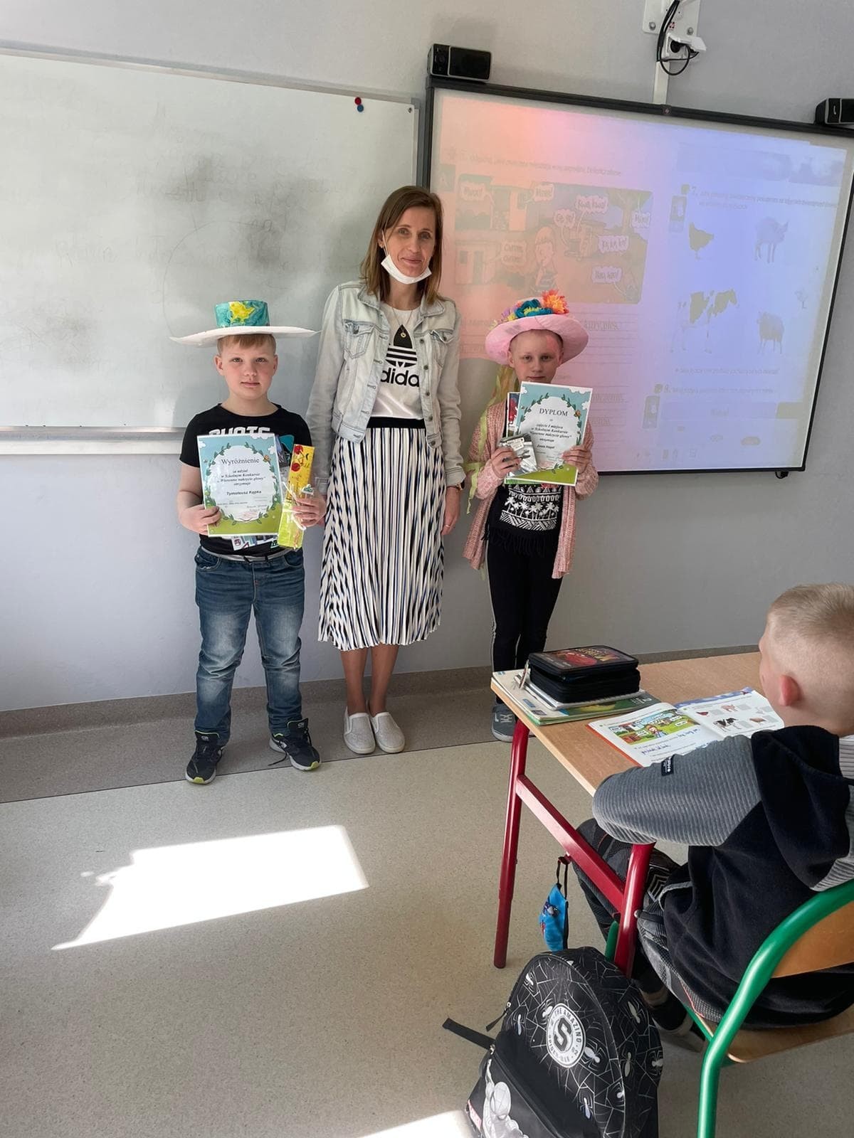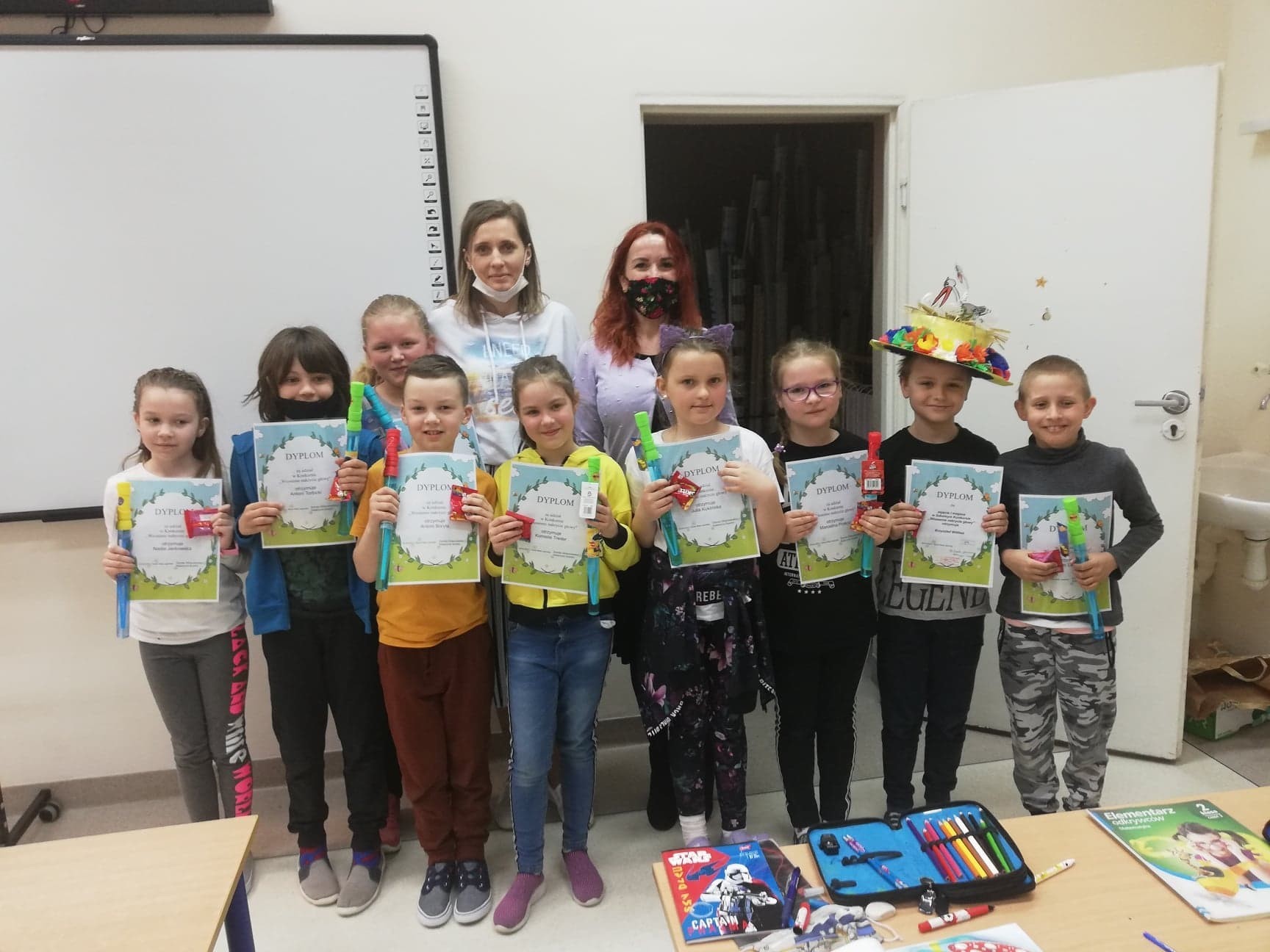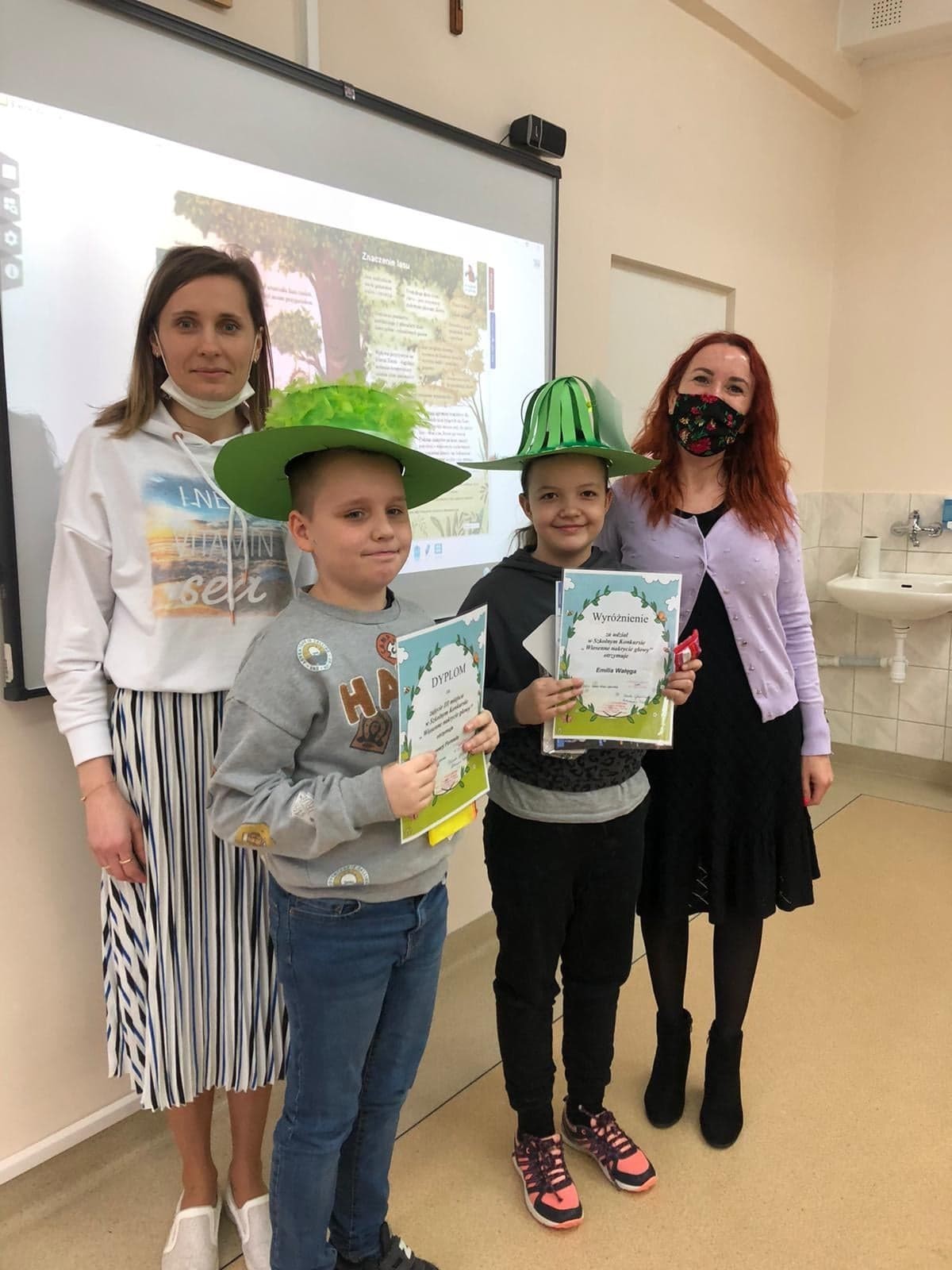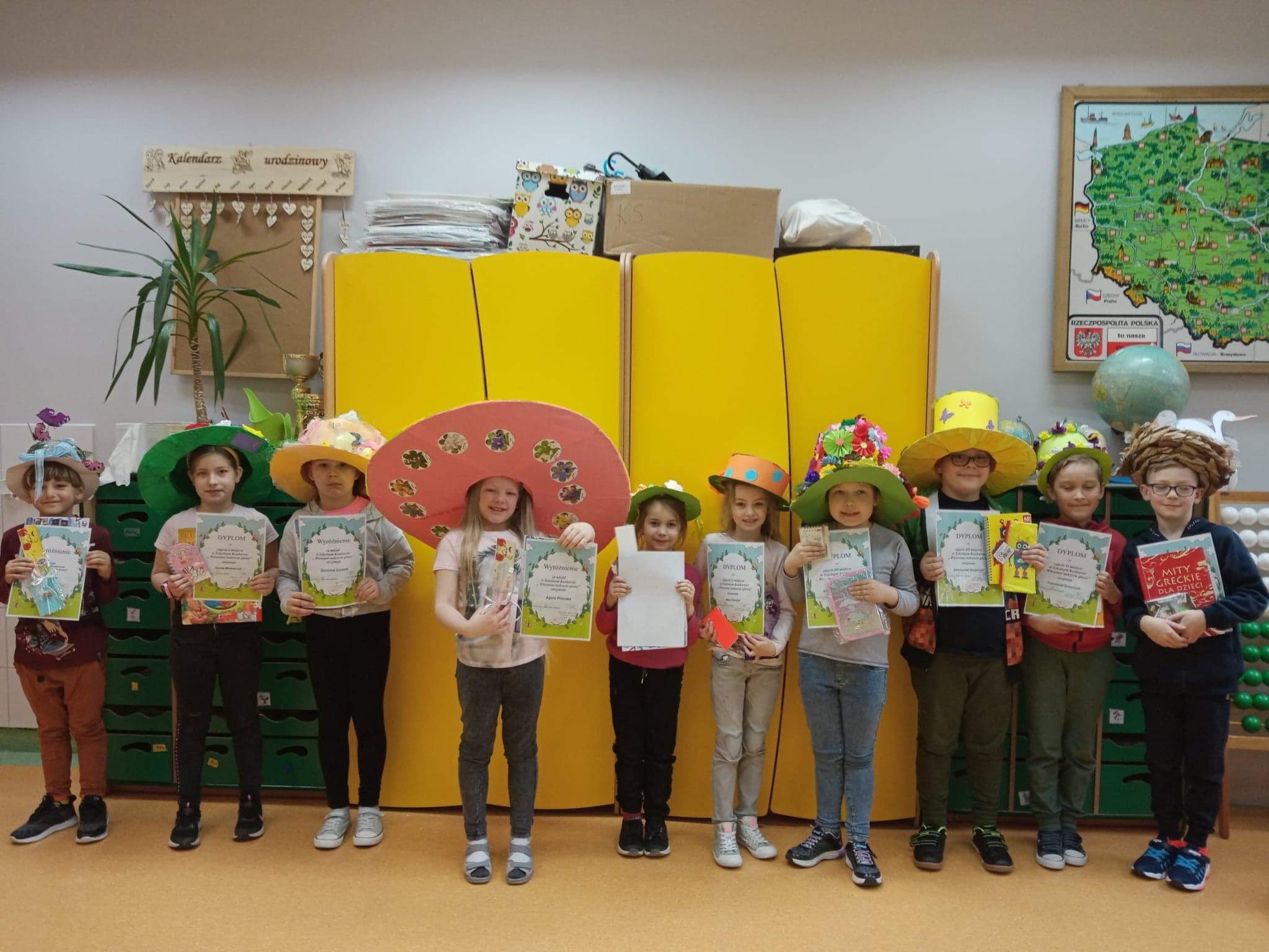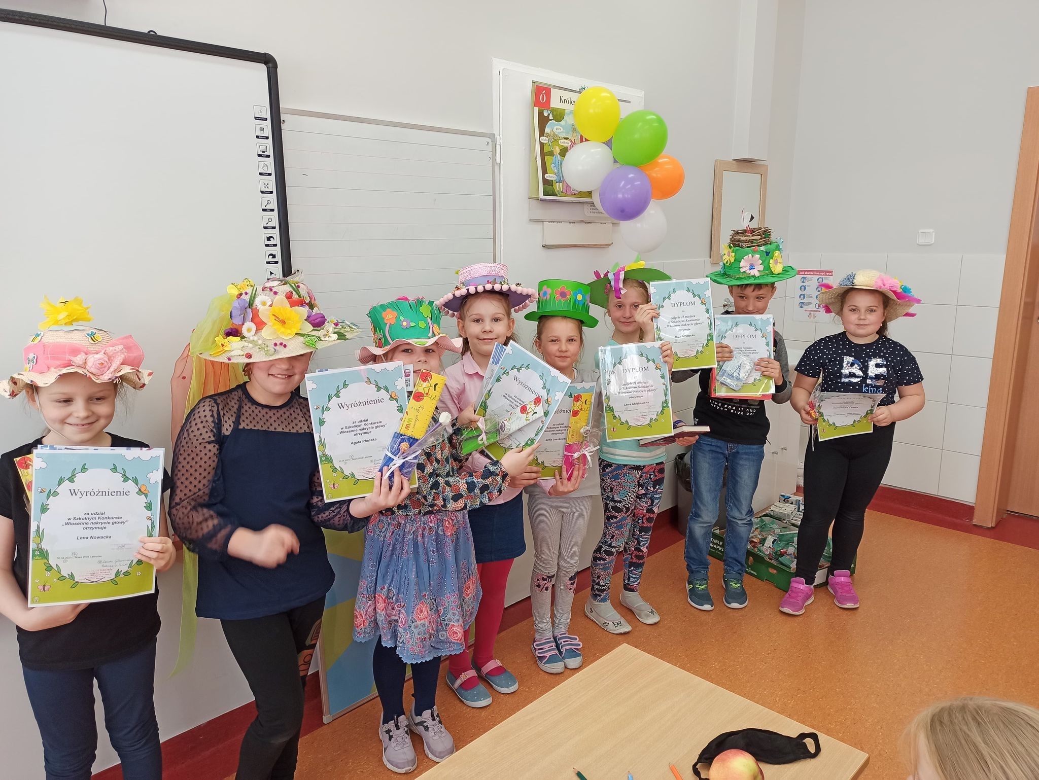 Z okazji Pierwszego Dnia Wiosny został ogłoszony konkurs na wiosenne nakrycie głowy dla uczniów klas I – III, w którym wzięło udział aż 30 dzieci. Wszyscy uczestnicy konkursu przygotowali piękne i pomysłowe nakrycia głowy, z wykorzystaniem kolorów oraz symboli wiosny. Wyniki prezentują się następująco: