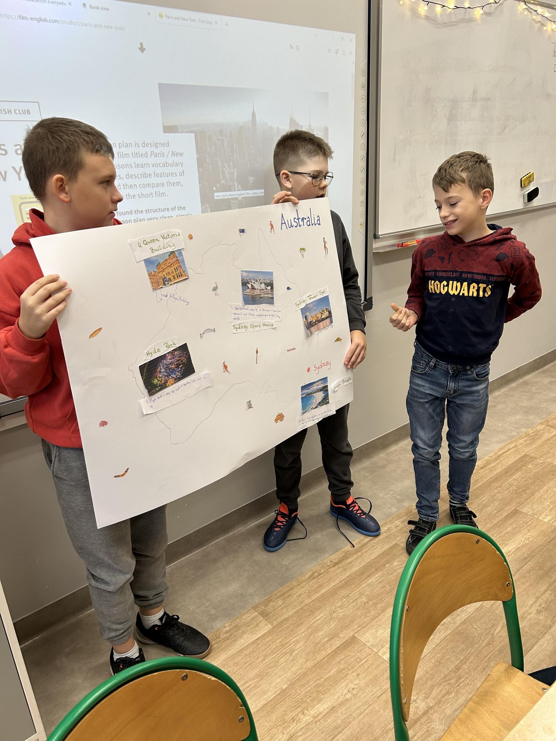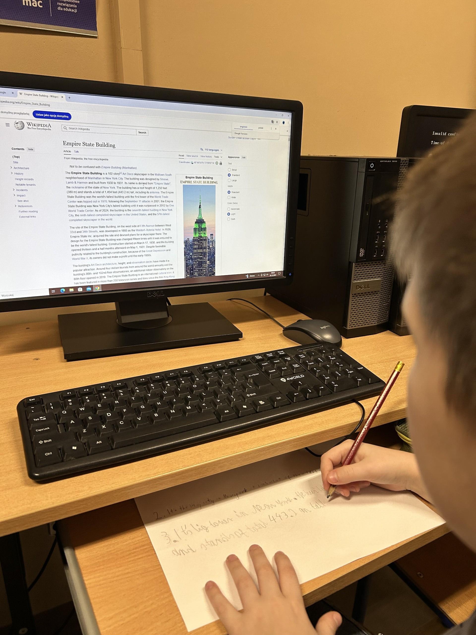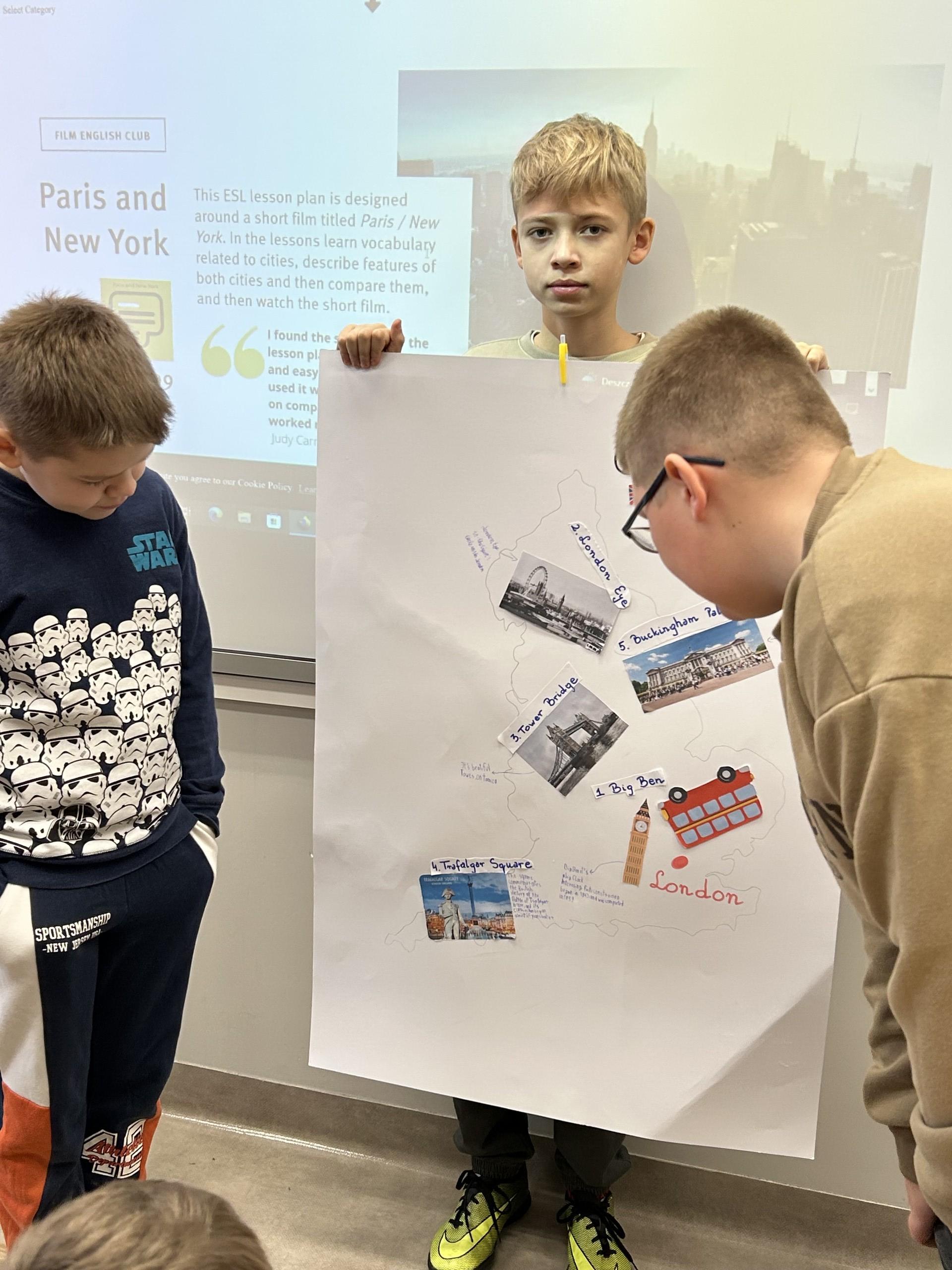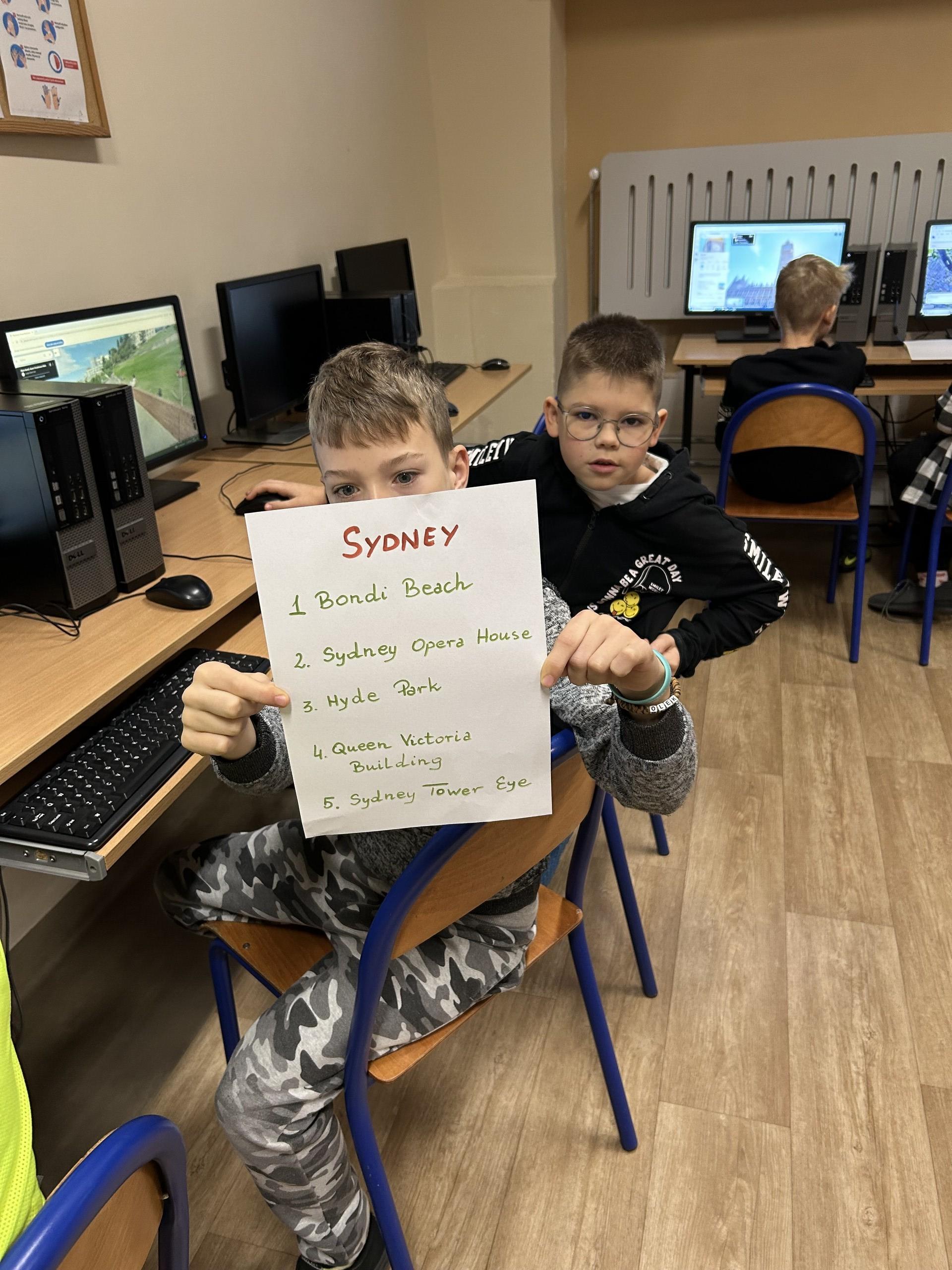 W zeszłym tygodniu uczniowie klasy 5b brali udział w projekcie między przedmiotowym z języka angielskiego i informatyki. Uczniowie w grupach losowali cztery miasta: Londyn, Sydney, Nowy Jork i Paryż, które następnie "wirtualnie zwiedzali". Mieli również okazję zobaczyć najważniejsze miejsca oraz symbole miast, których nie można pominąć , m.in. Bondi Beach, Empire State Building, London Eye, Eiffel Tower i wiele innych. Kolejnym etapem było tworzenie map danych miast i opisywanie najciekawszych miejsc.