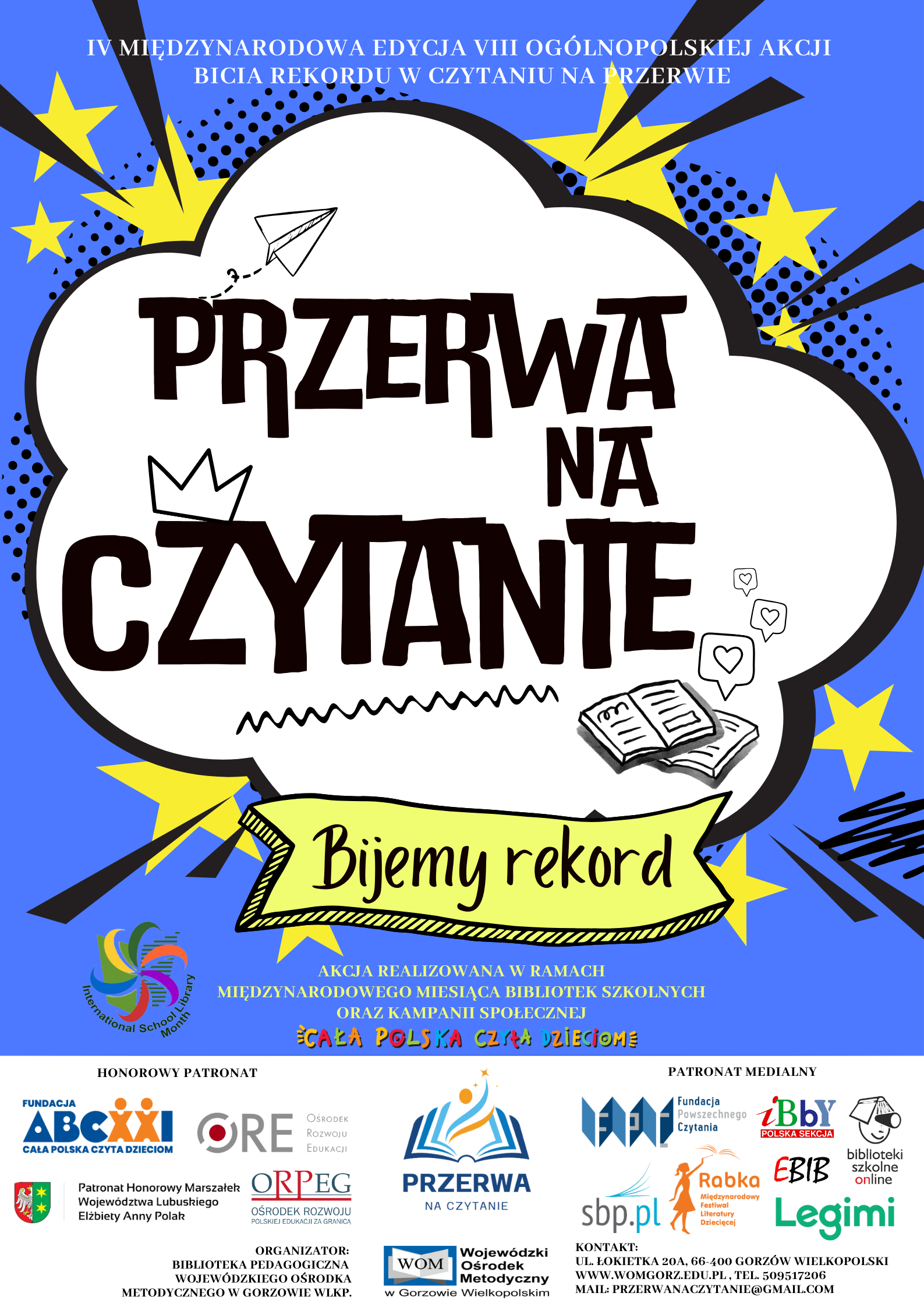 26 października nasza szkoła podjęła wyzwanie, próbując pobić rekord w CZYTANIU NA PRZERWIE w ramach VIII OGÓLNOPOLSKIEJ AKCJI „PRZERWA NA CZYTANIE” .
