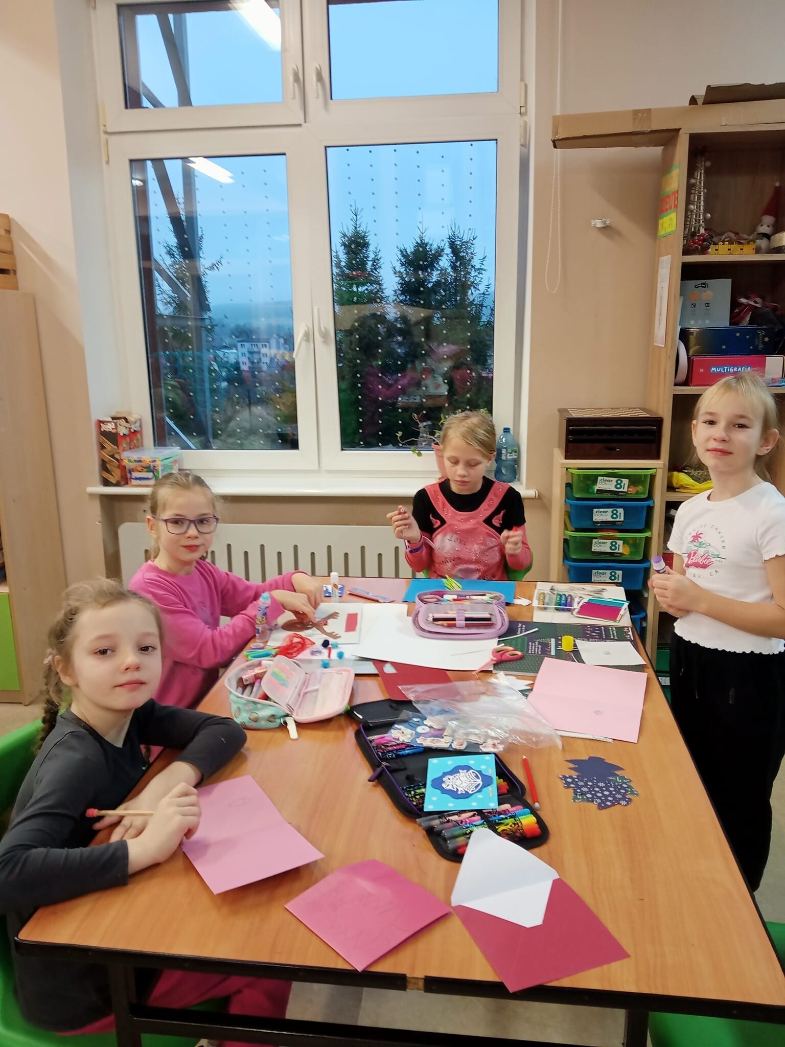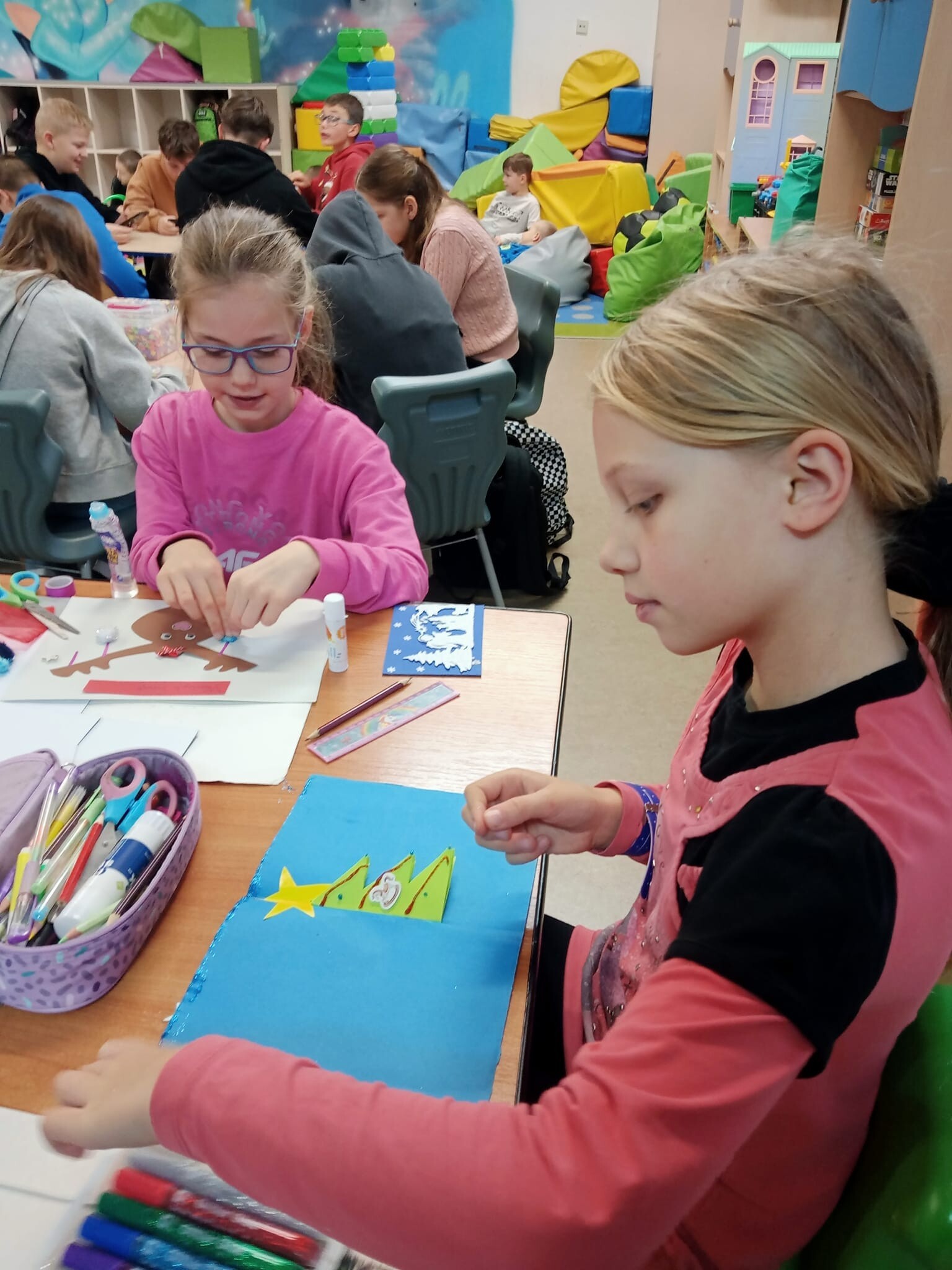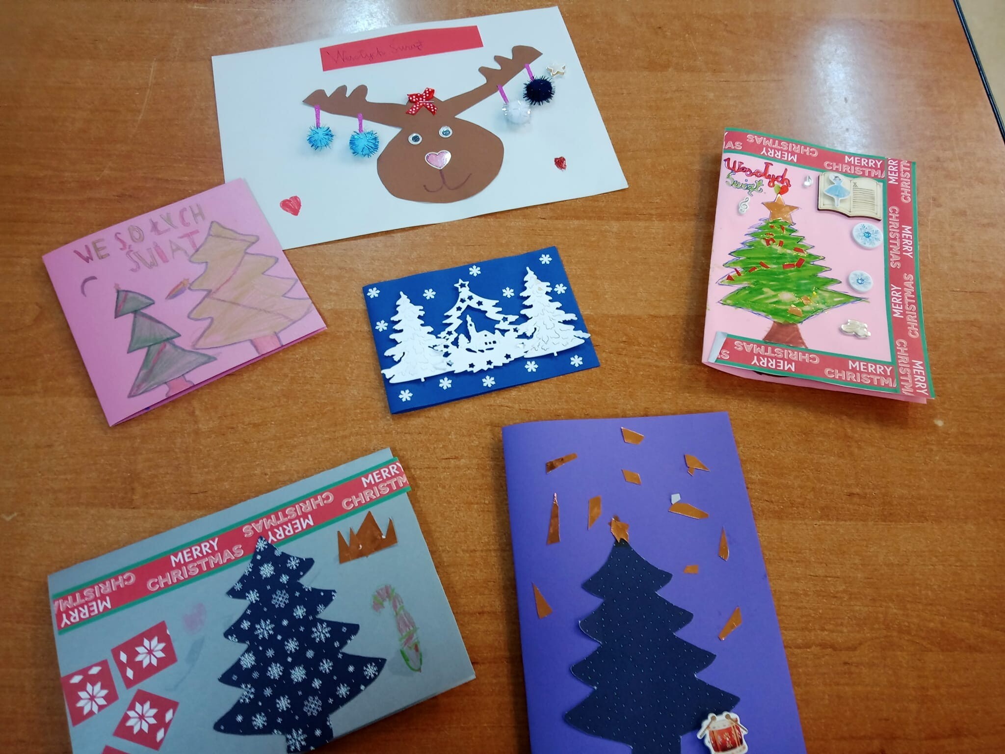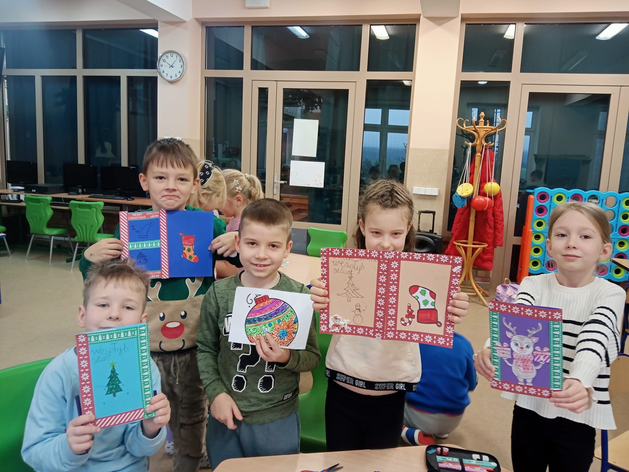 Dziś od rana w świetlicy szkolnej uczniowie podczas zajęć wykonywali własnoręcznie piękne kartki świąteczne z okazji Świąt Bożego Narodzenia, które postanowili wysłać do swoich najbliższych lub wręczyć im osobiście.