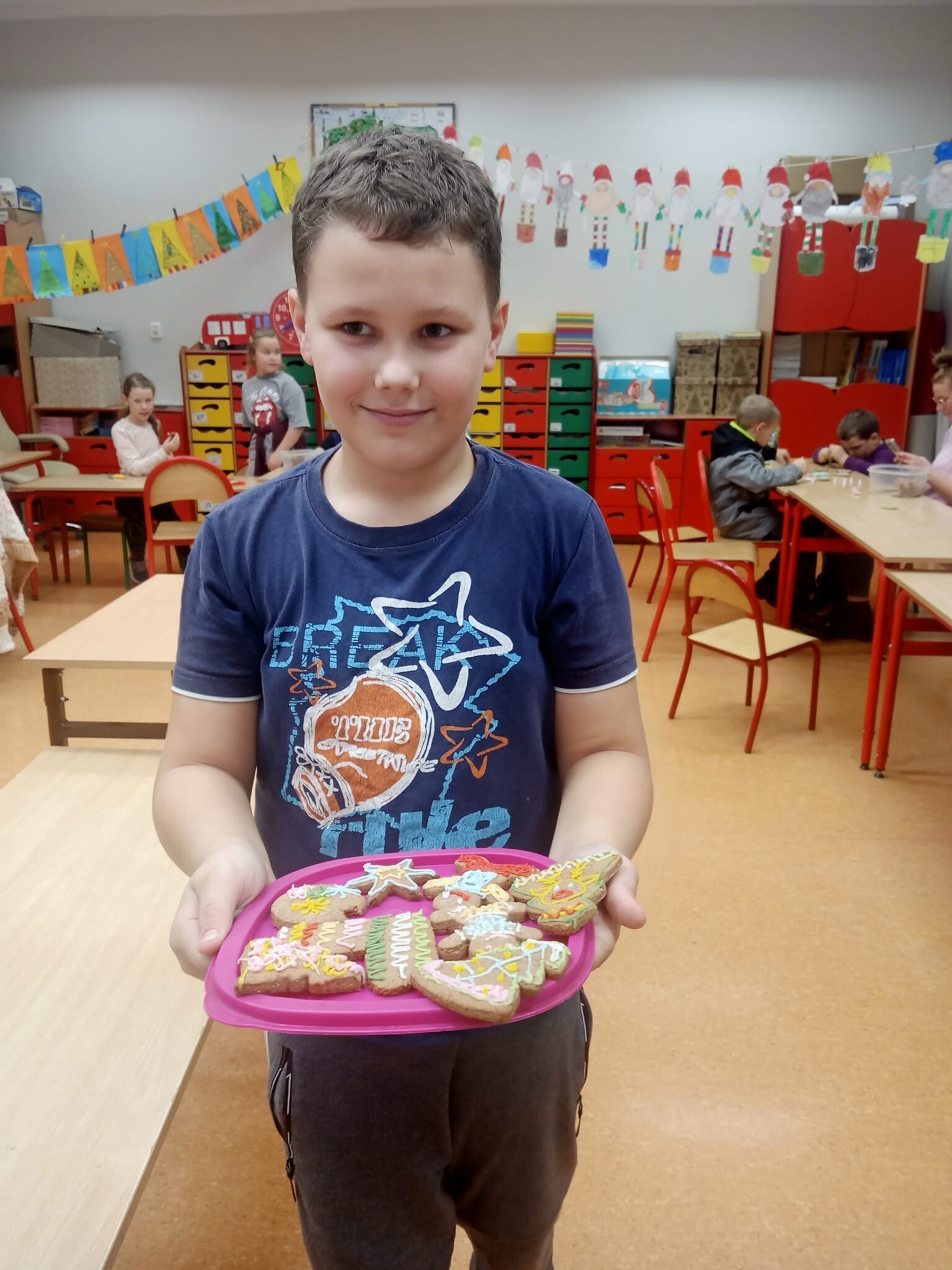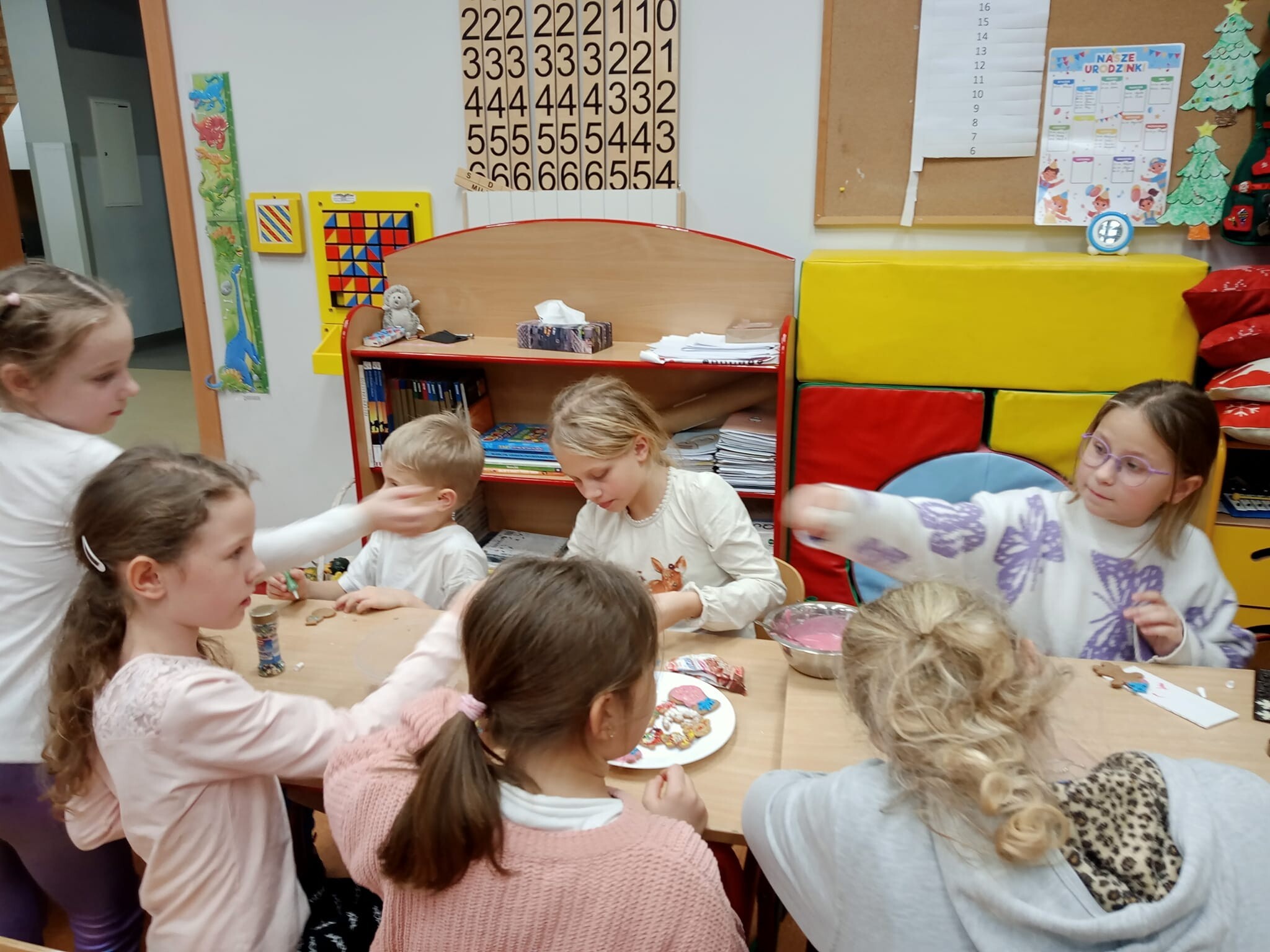 W czwartkowe popołudnie 5 grudnia, w ramach przygotowań do kiermaszu na Biały Koncert odbyło się rodzinne dekorowanie pierniczków. Uczniowie klasy 2b i ich rodzice, a nawet dziadkowie, przy dźwiękach kolęd i świątecznych piosenek, kolorową polewą i barwnymi posypkami dekorowali pierniki według własnych pomysłów. Każdy z nich dołożył wszelkich starań, by ich dzieła prezentowały się jak najpiękniej. Dzieci odwiedził również Mikołaj. Ten wieczór będzie na długo w naszej pamięci.
