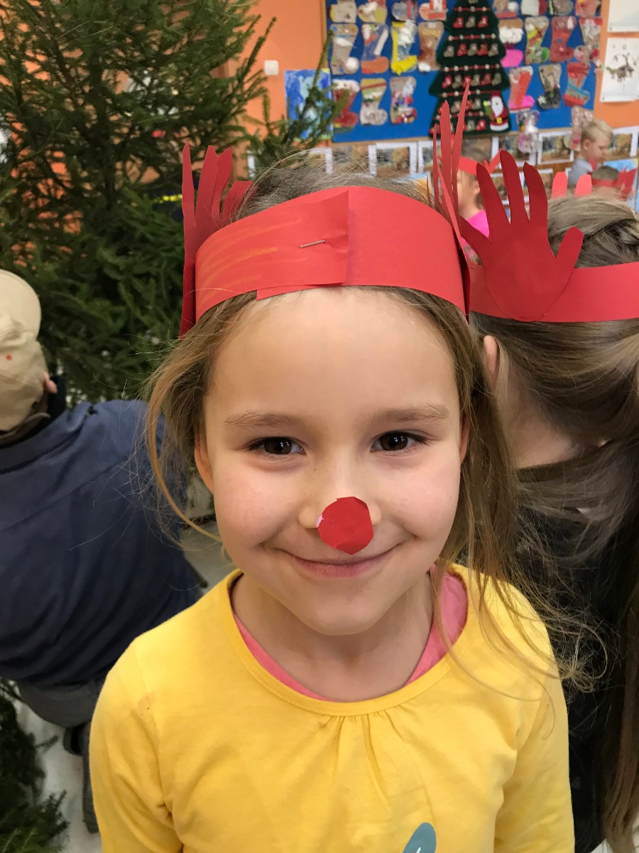 Rudolph the red nosed reindeer-czerwononosy renifer Rudolf zainspirował dzieci z grupy przedszkolnej 0b.W ramach projektu z języka angielskiego grupa 27 przedszkolaków na jeden dzień zamieniła się w pomocnika św.Mikołaja wykonując pracę plastyczną połączoną z wycinankami.