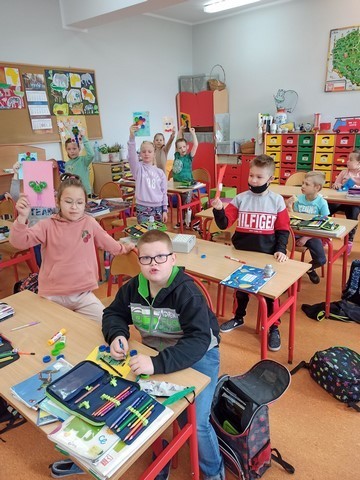 Uczniowie klas I zrealizowali kwietniowe zadanie programu Serdeczna Karteczka, przygotowując dla pracowników ochrony środowiska eko - karteczki.