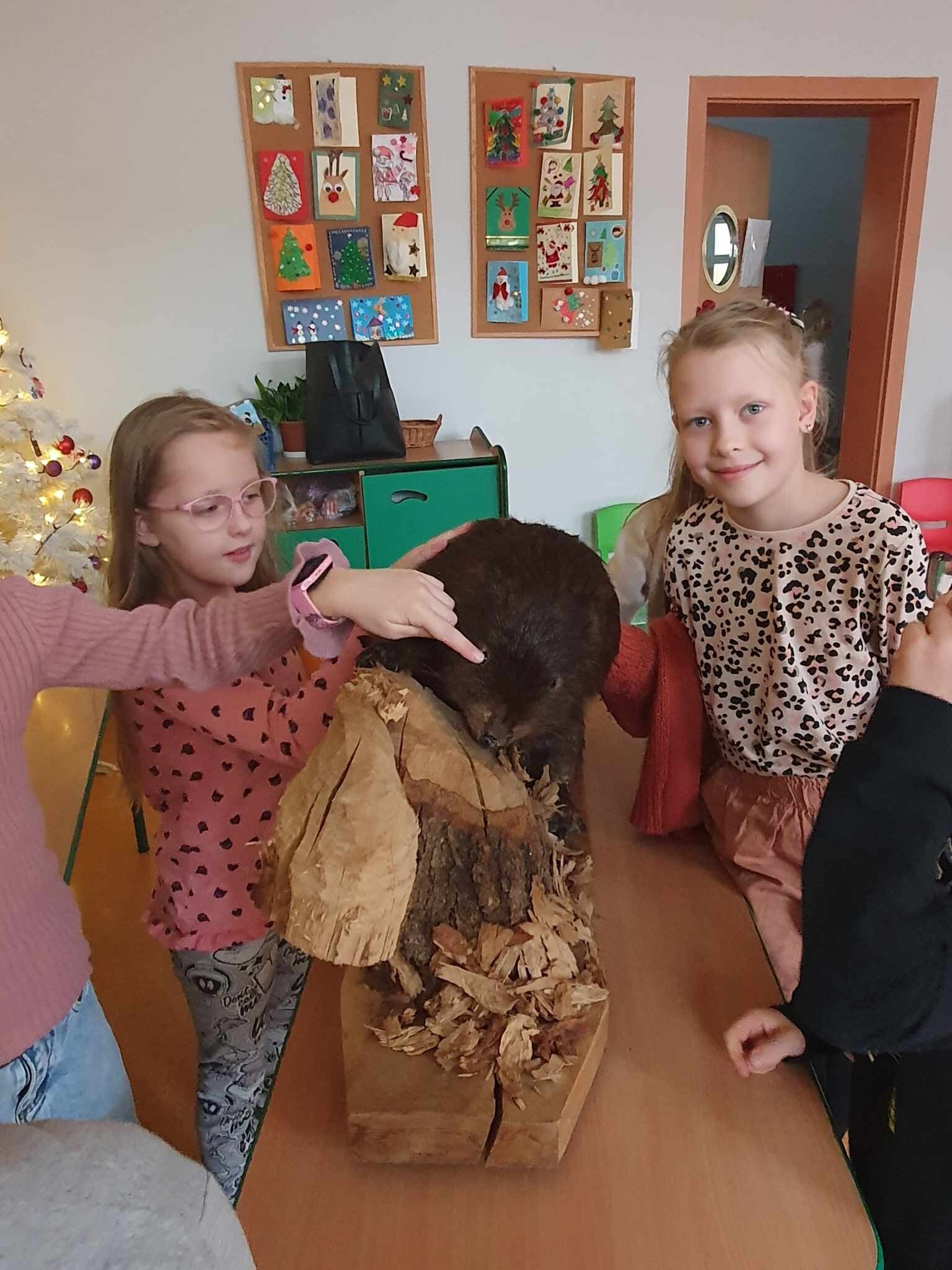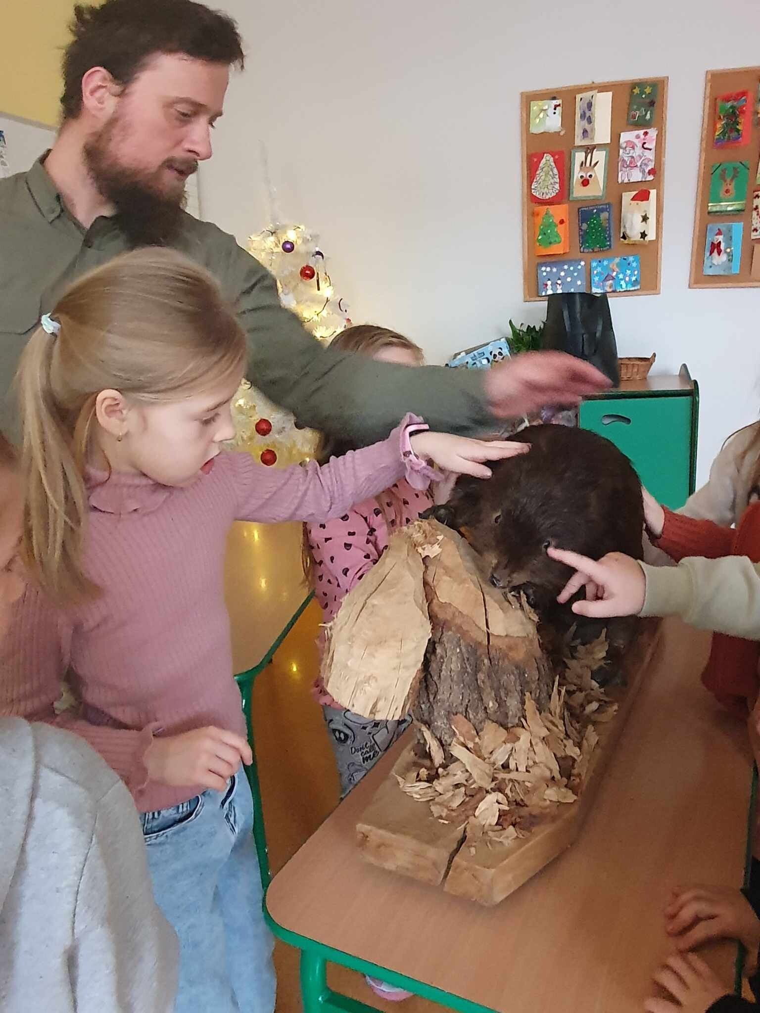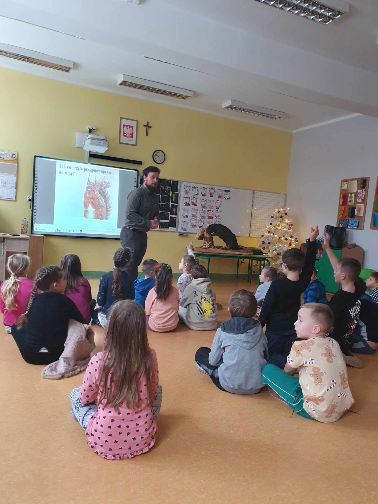 8 grudnia uczniowie klas I-III wzięli udział w ciekawych zajęciach przyrodniczych poprowadzonych przez Pana Andrzeja Kąckowskiego z Nadleśnictwa Lębork. Spotkanie miało na celu zapoznanie dzieci z pracą leśnika, który opowiedział im o sposobach zwierząt na przetrwanie zimy. Uczniowie dowiedzieli się w jaki sposób mogą wspomagać zwierzęta zimą, jak prawidłowo zachowywać się w lesie oraz jakie znaczenie ma las w życiu człowieka. Pan Andrzej odpowiadał na wszystkie pytania naszych dociekliwych uczniów. Spotkanie upłyneło w miełej aytmosferze i niewątpliwie wpłynęło na poszerzenie wiedzy przyrodniczej naszych uczniów.