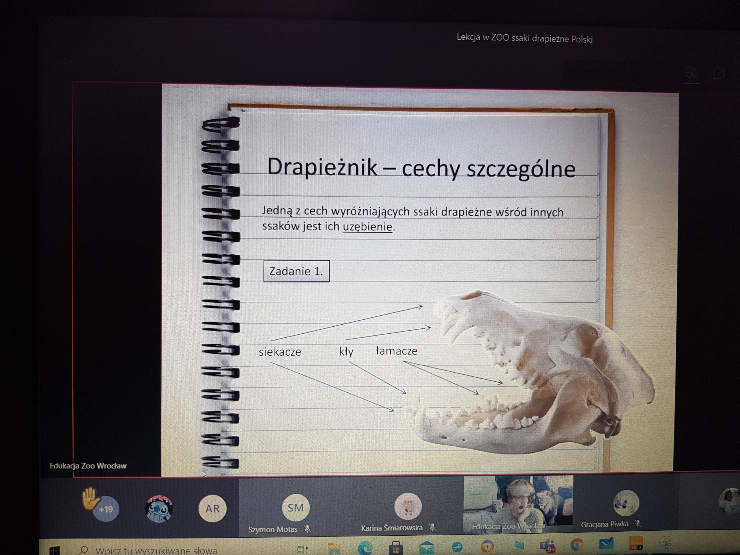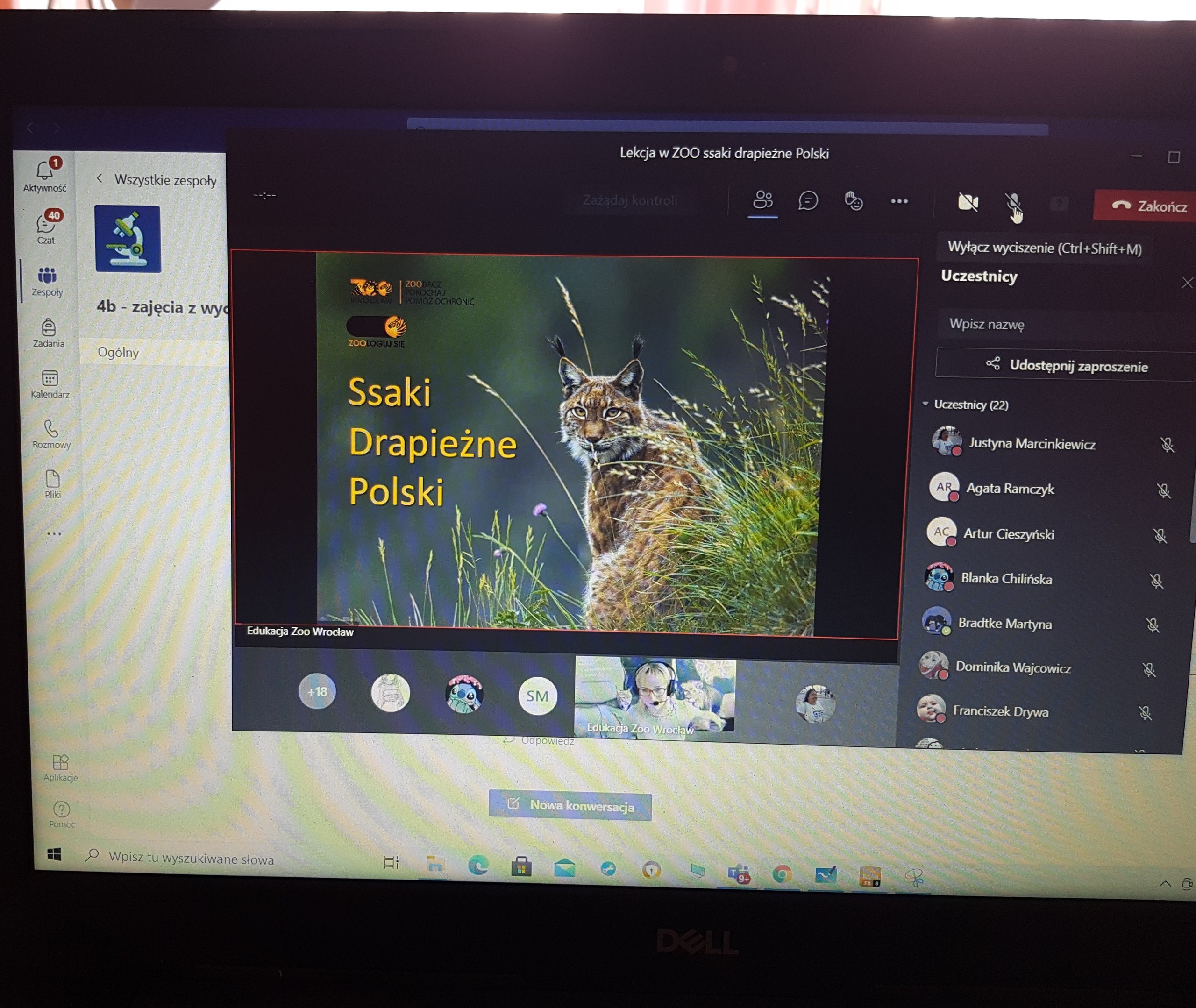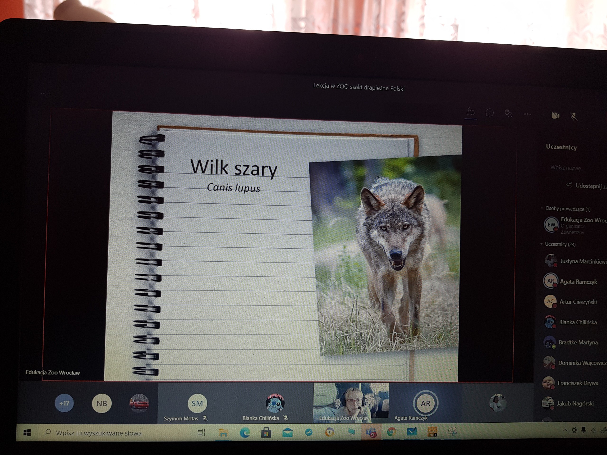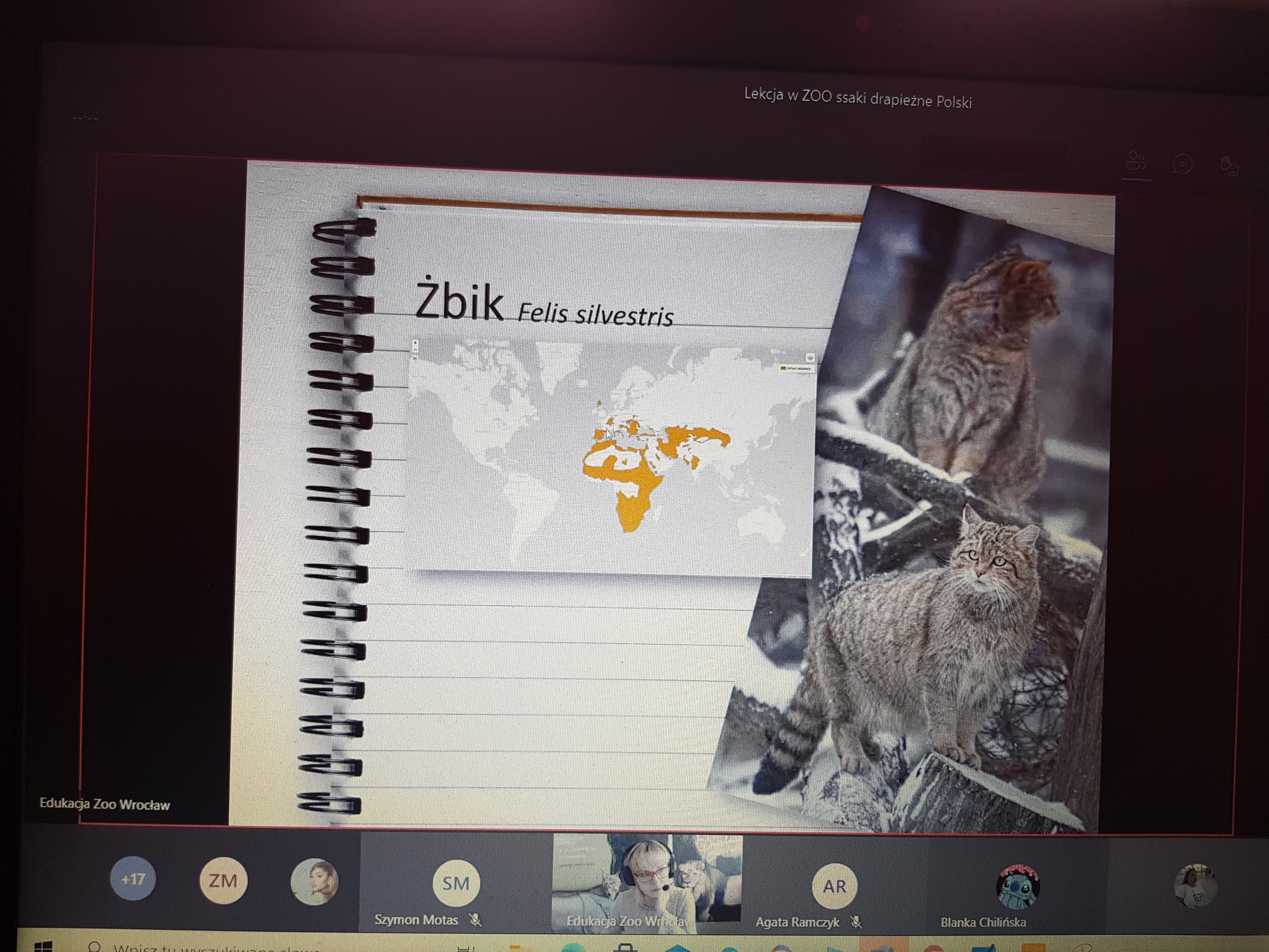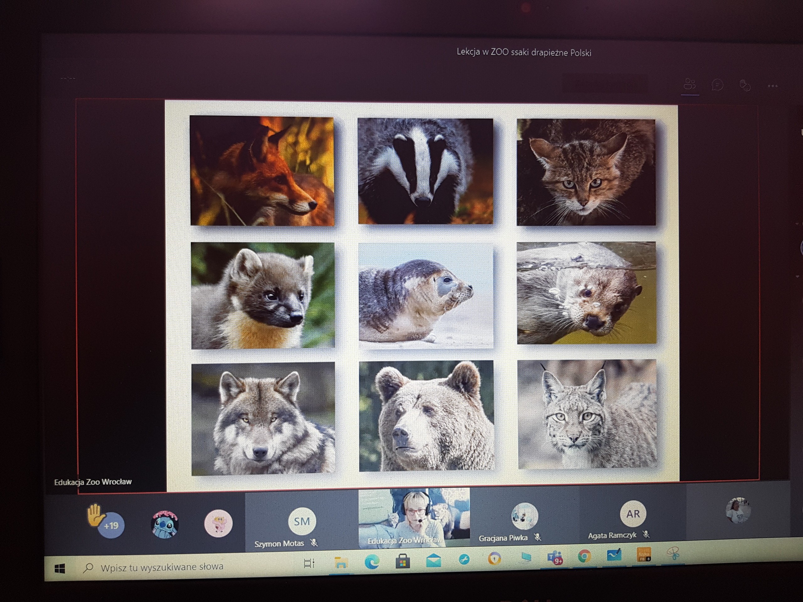 z Ogrodu Zoologicznego we Wrocławiu. Lekcja odbyła się w związku z Dniem Ziemi. Tematem były ssaki drapieżne Polski. Dzieci oglądały prezentację i wypełniały karty pracy. Brały bardzo aktywny udział w zajęciach, zadawały dużo pytań, wykazały się znajomością gatunków zwierząt żyjących