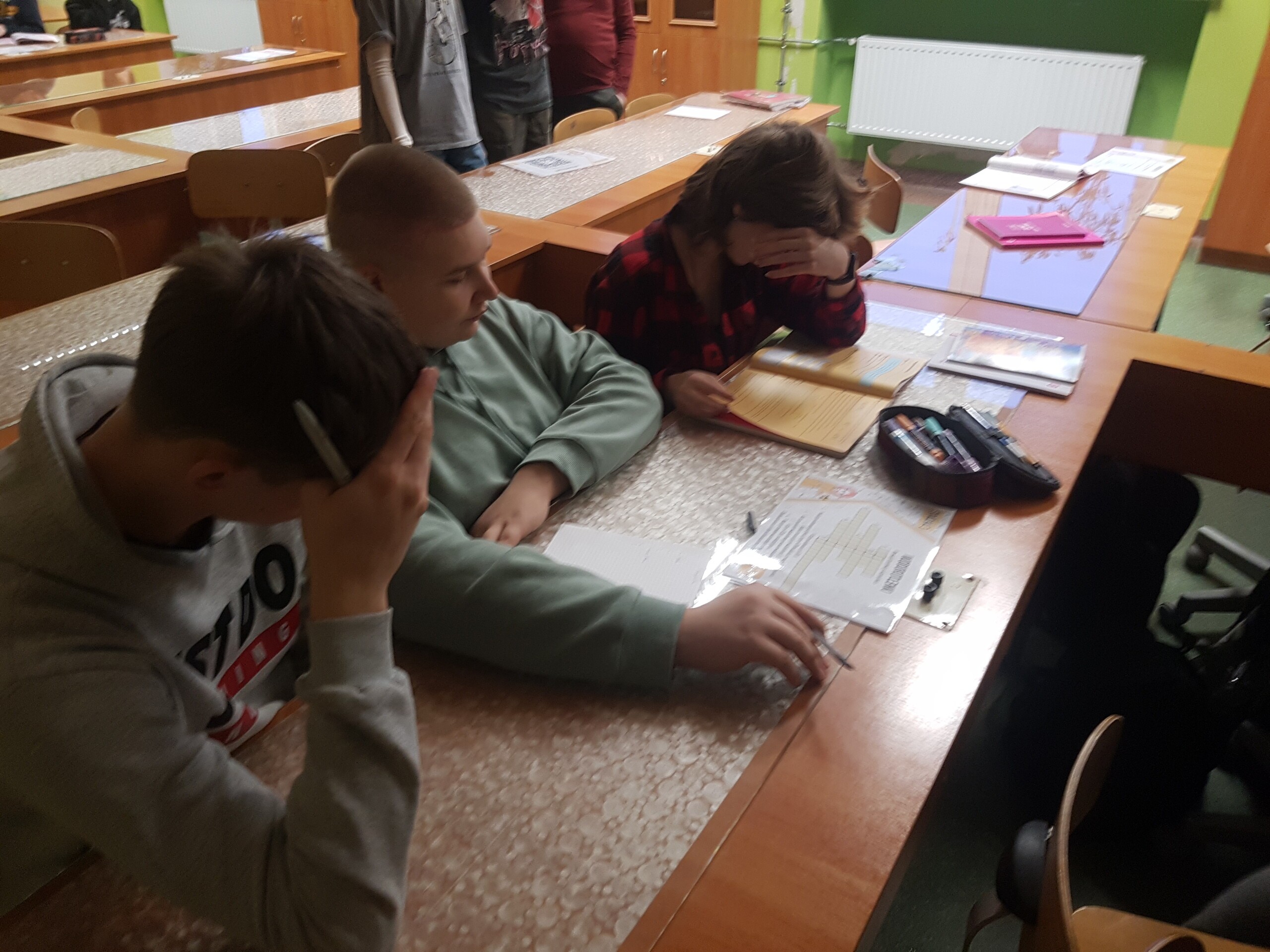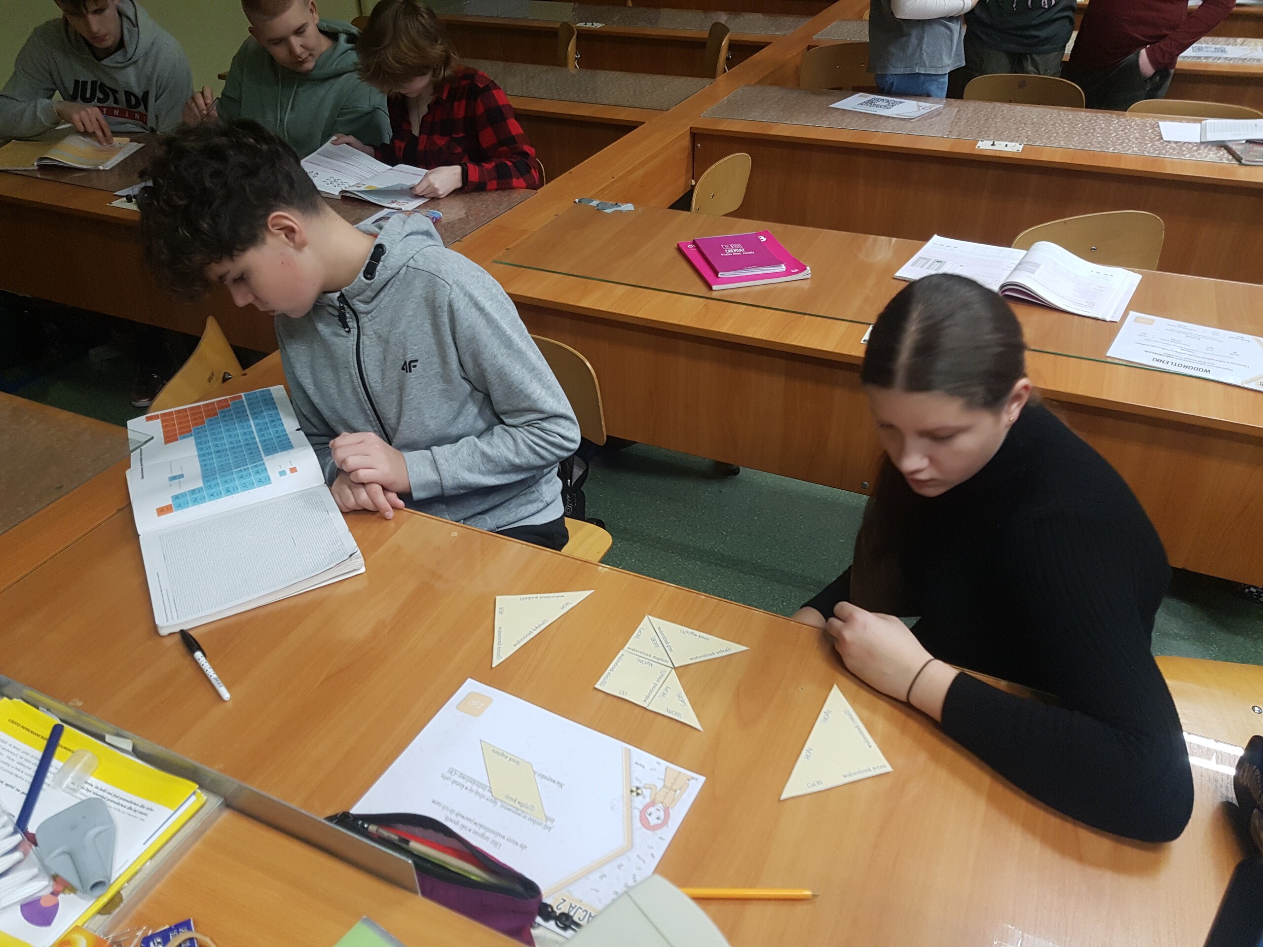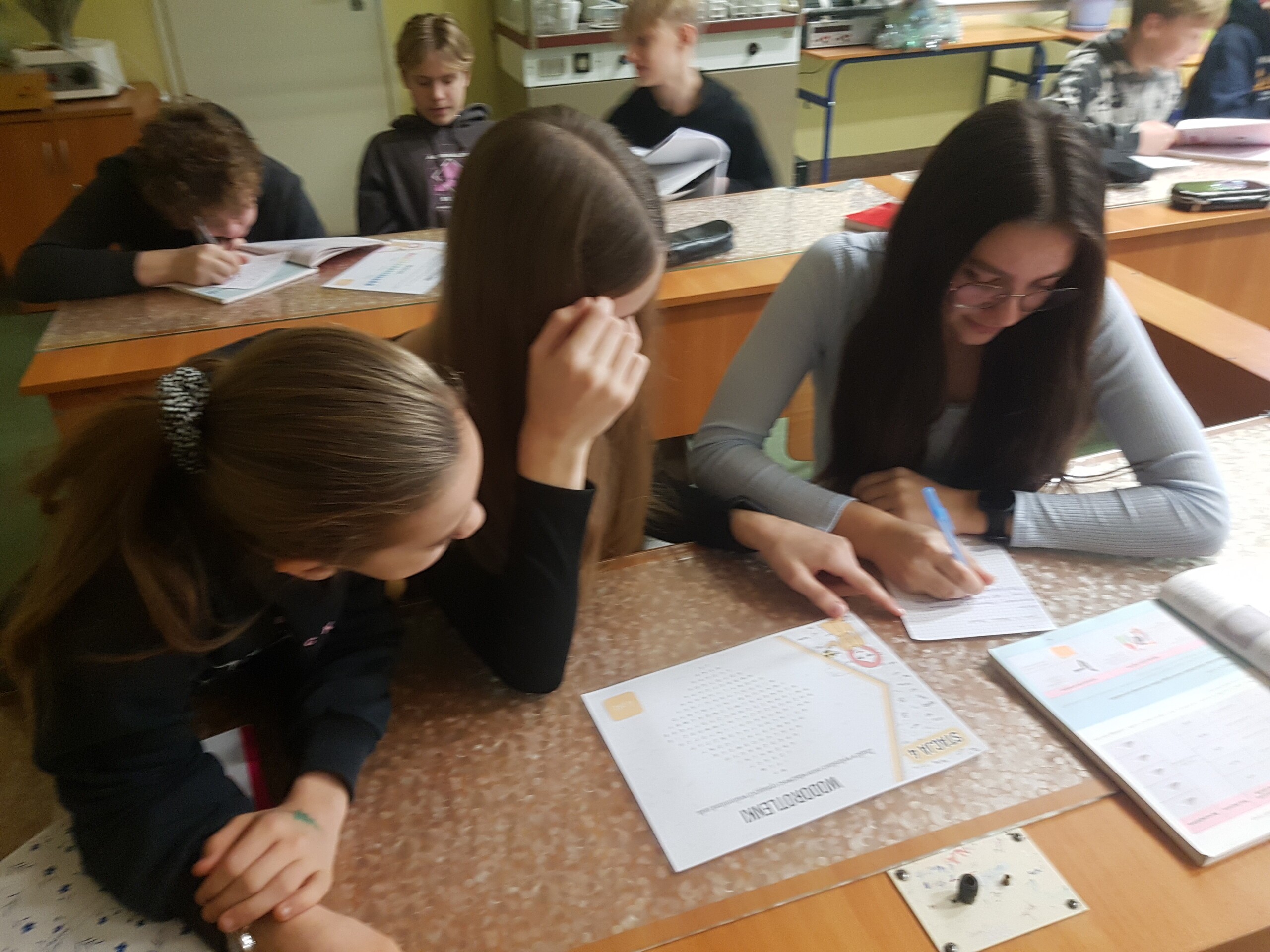 Uczniowie klasy 8 na zakończenie działu "Wodorotlenki" sprawdzali swoją wiedzę i umiejętności rozwiązując zadania znajdujące się na poszczególnych stacjach zadaniowych. Dzieci pracowały w grupach. Mogły korzystać z własnych notatek oraz podręcznika. Doskonaliły w ten sposób wyszukiwanie informacji oraz logiczne myślenie. Wszyscy pracowali z dużym zaangażowaniem.