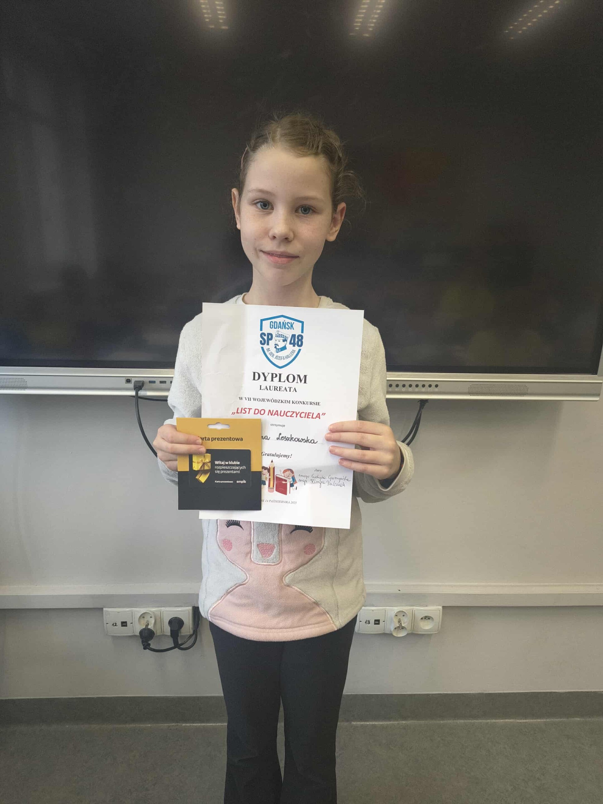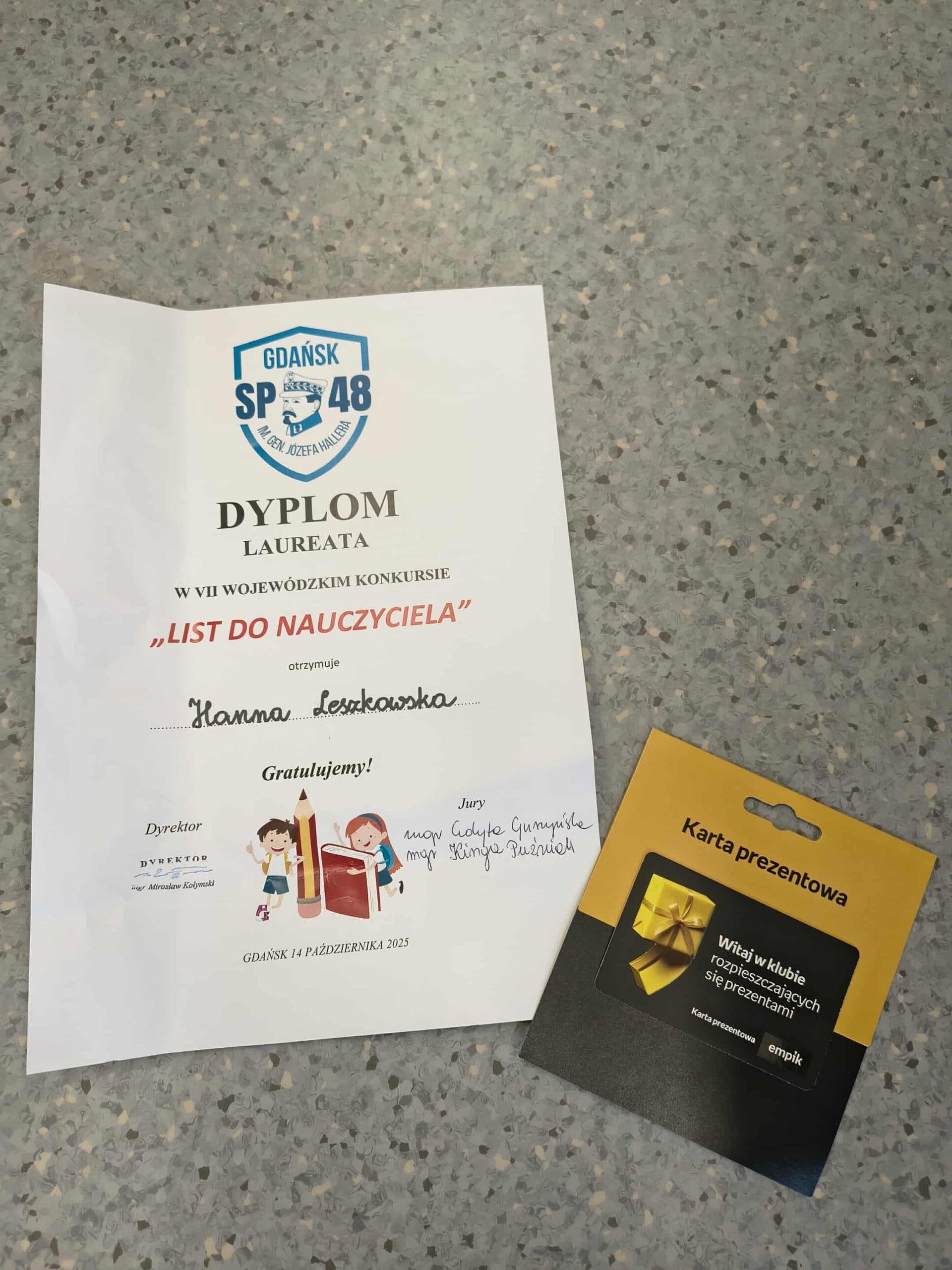 Z radością informujemy, że Hanna Leszkowska została nagrodzona w VIII Wojewódzkim Konkursie Literackim „List do nauczyciela”. Serdecznie gratulujemy Hani talentu, wrażliwości i umiejętności pięknego wyrażania myśli. Życzymy dalszych sukcesów literackich i nieustającej pasji do tworzenia!