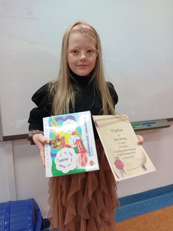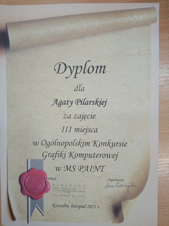 Jest nam miło poinformować, że uczennica klasy II a Agata Pilarska zajęła III miejsce w Ogólnopolskim Konkursie Grafiki Komputerowej w MS Paint . Gratulujemy serdecznie i życzymy dalszych sukcesów!