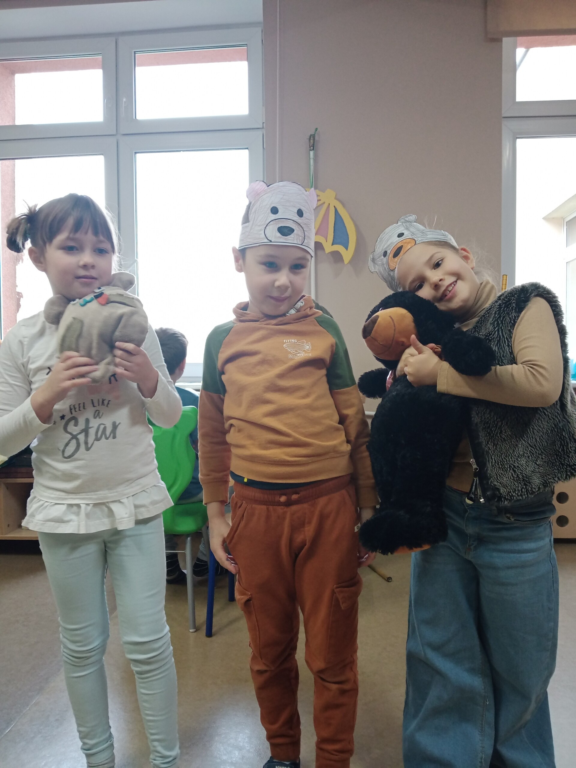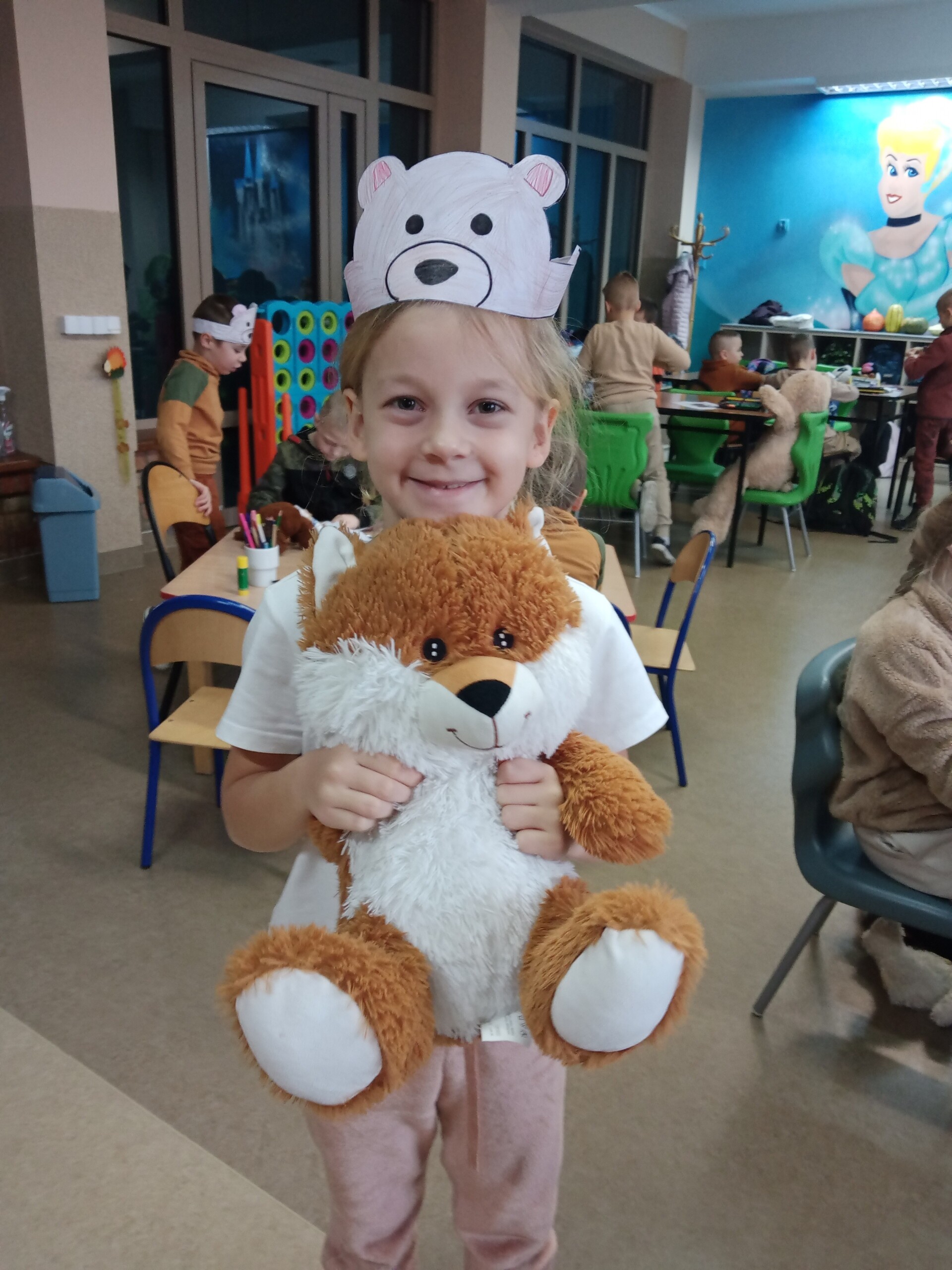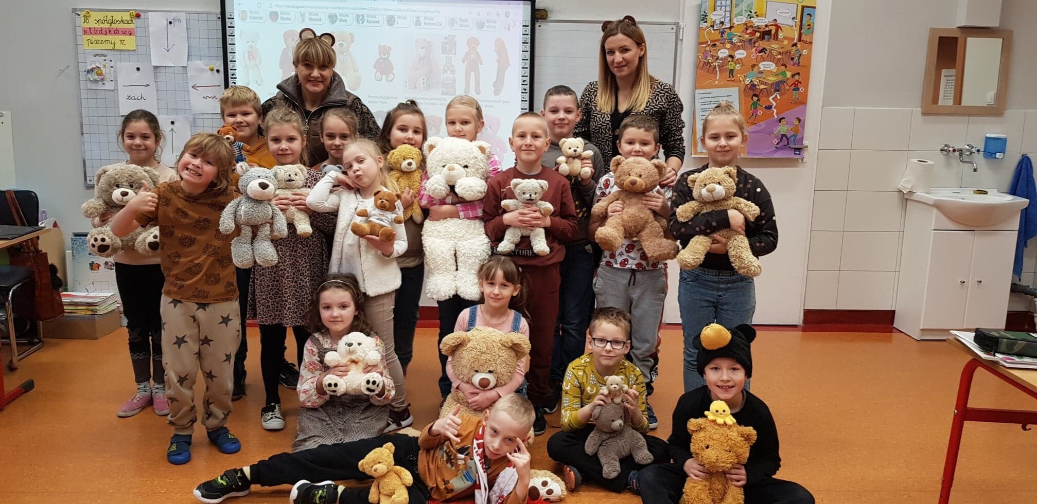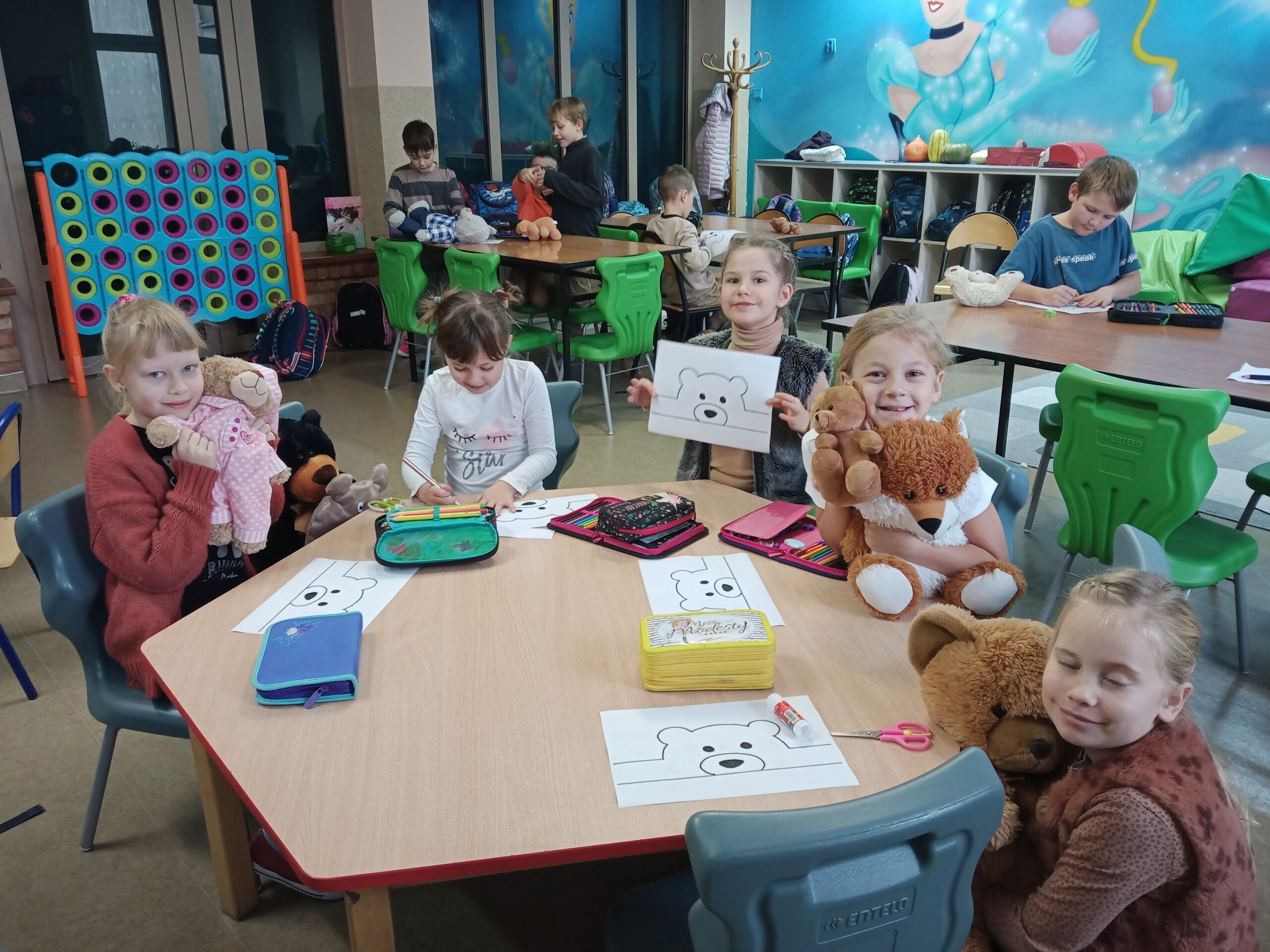 Na holu pojawiła się gazetka przedstawiająca postacie znanych, bajkowych bohaterów oraz różne gatunki niedźwiedzi występujących w przyrodzie. W ramach zajęć uczniowie mieli okazję wysłuchać opowiadań i obejrzeć bajki, których bohaterem był miś.