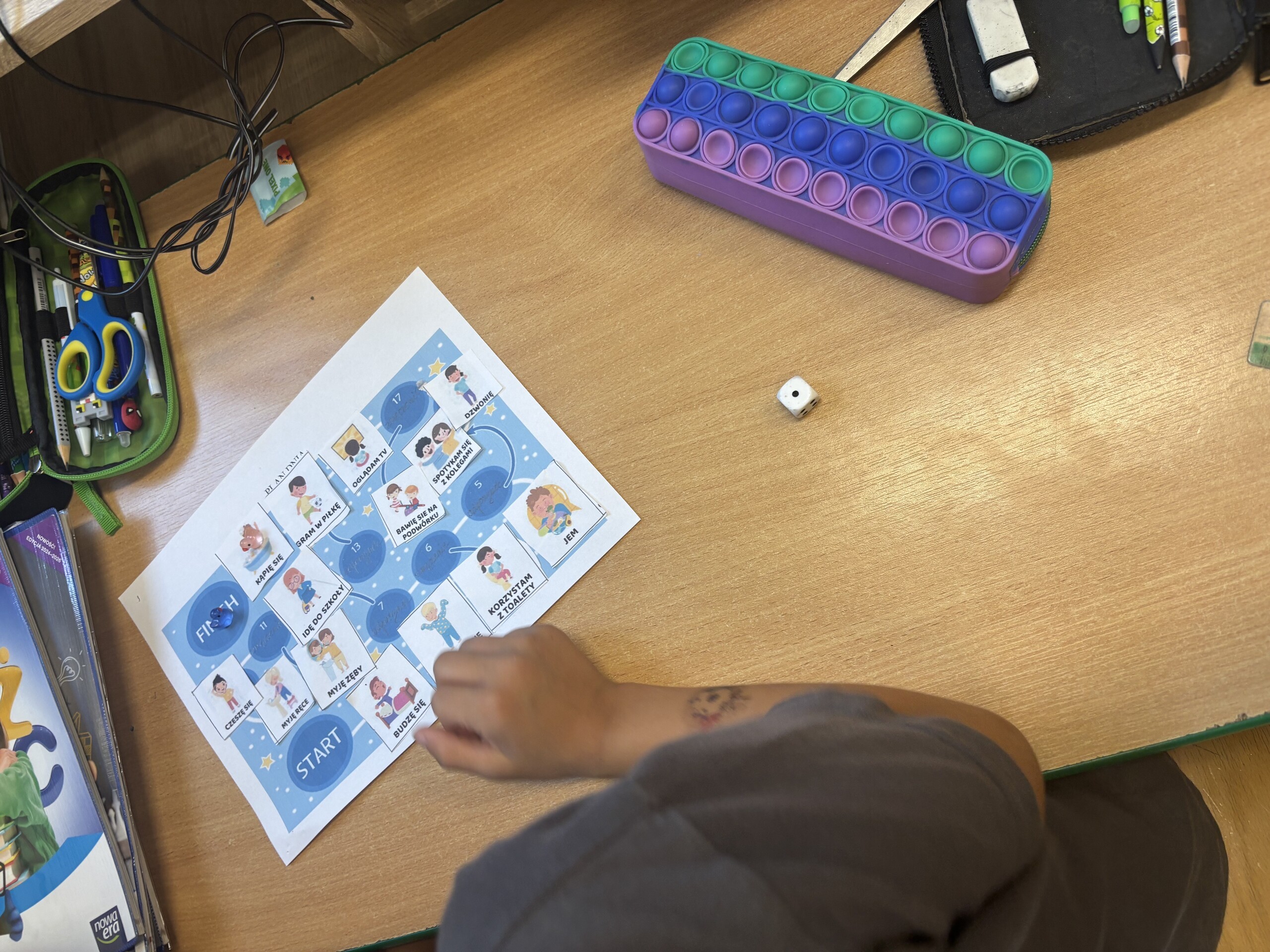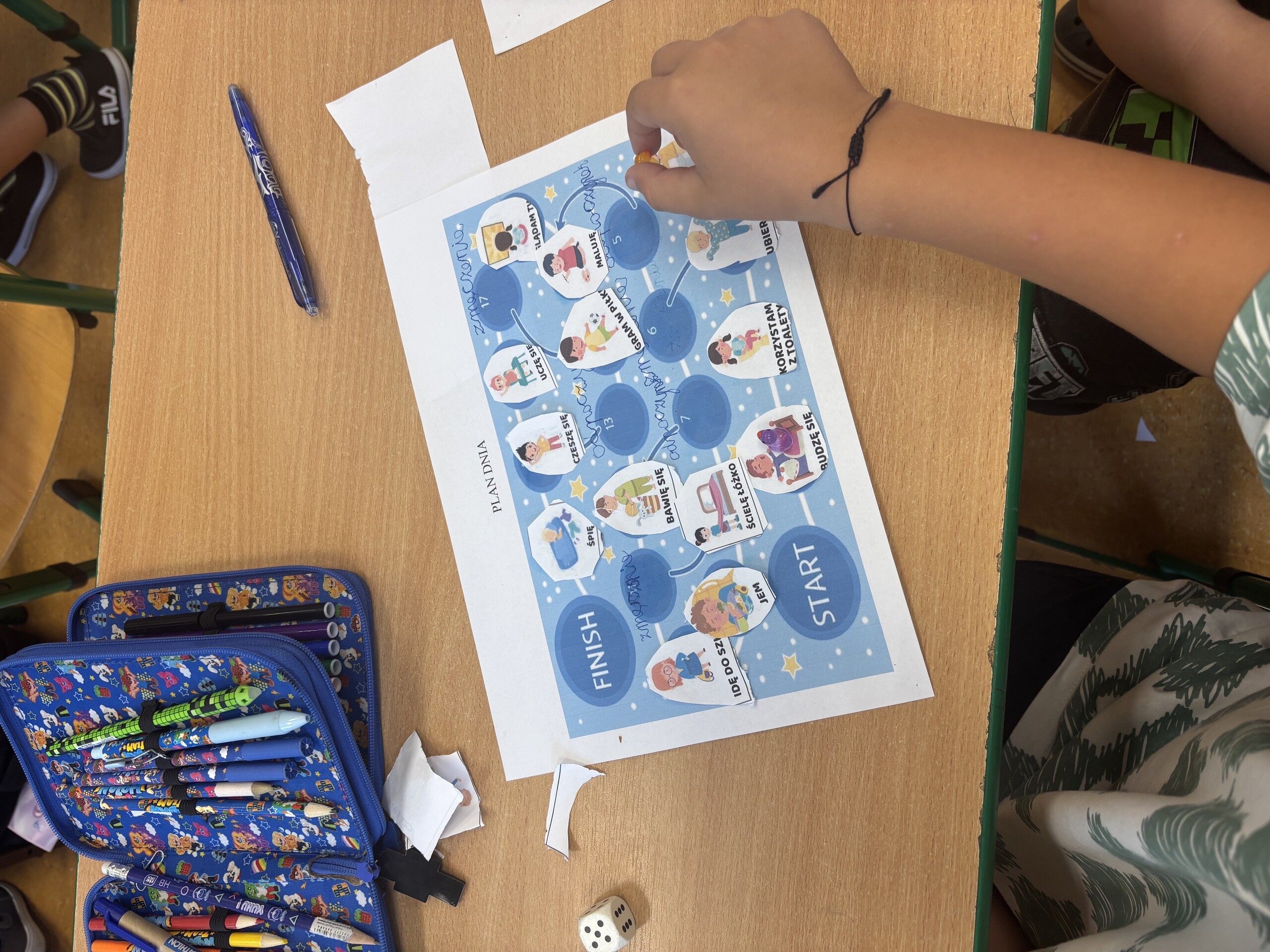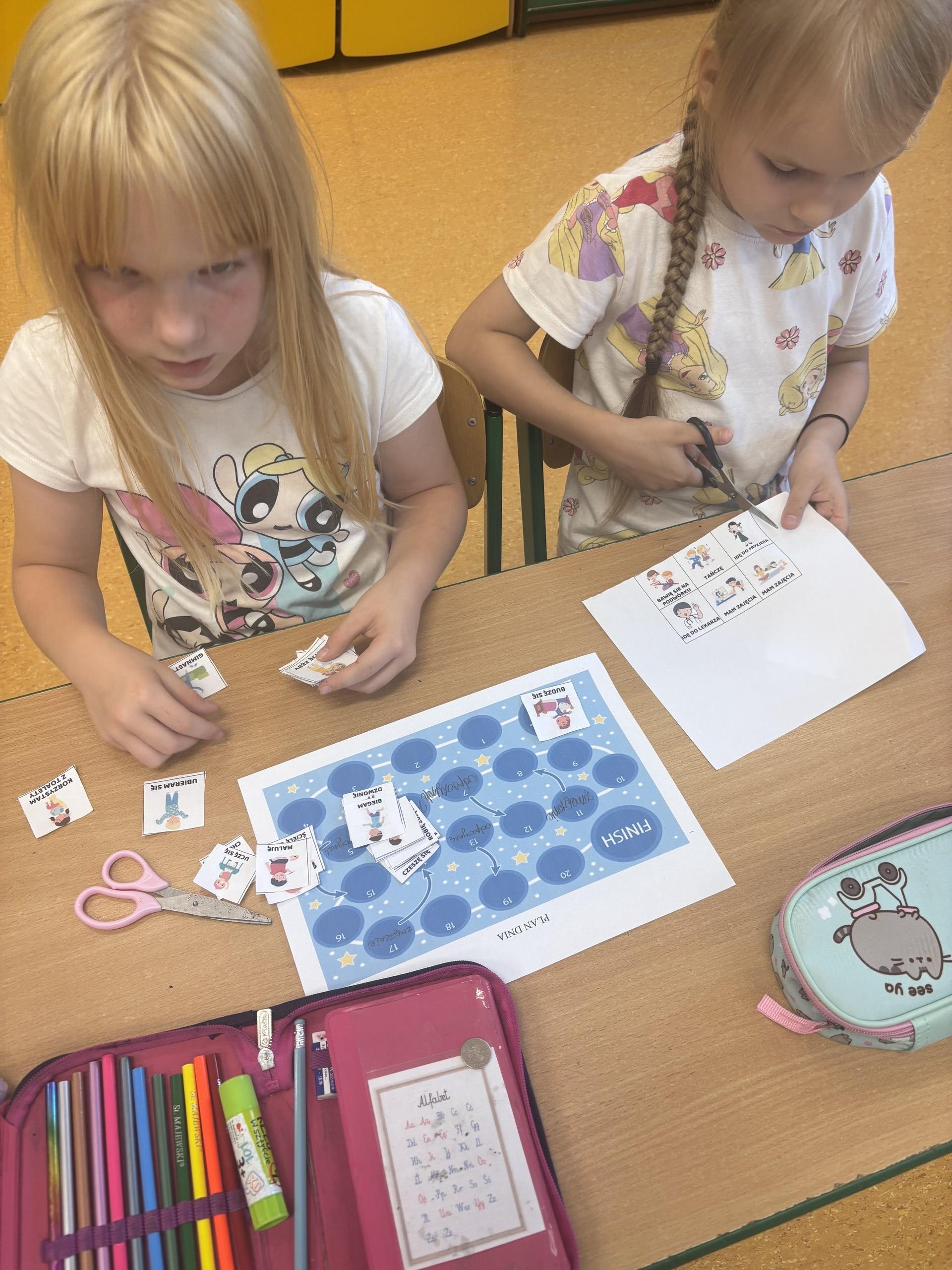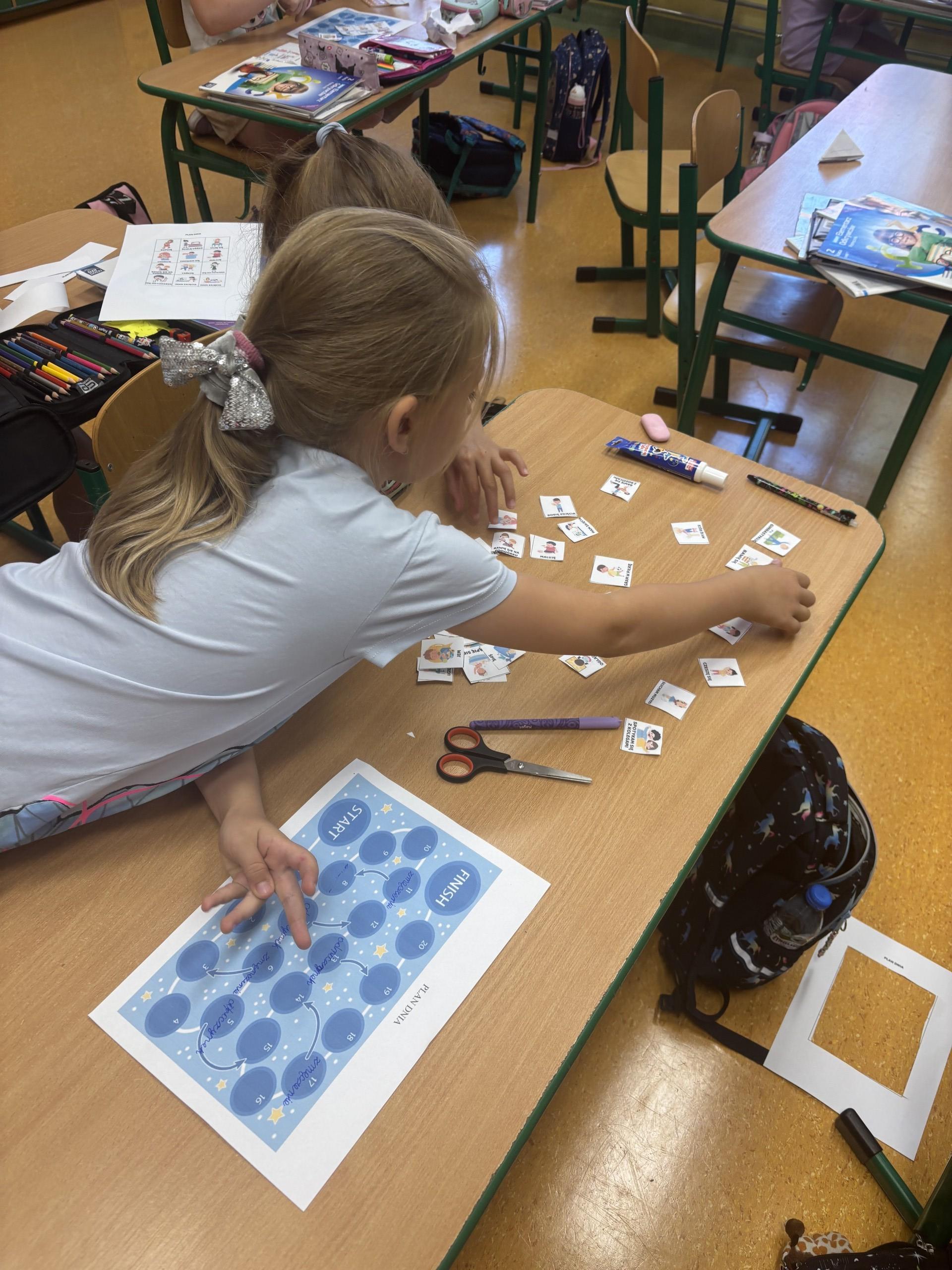Klasa 2a podjęła się zadania wykonania własnej gry planszowej, gdzie każde pole to element ich planu dnia. Następnie dzieci wymyśliły, co dzieje się na poszczególnych polach. Co jest startem? Co jest metą? Czy brakuje im miejsc, gdzie mogą się zatrzymać i zyskać siłę, aby przeskoczyć potem kilka pól do przodu szybciej?