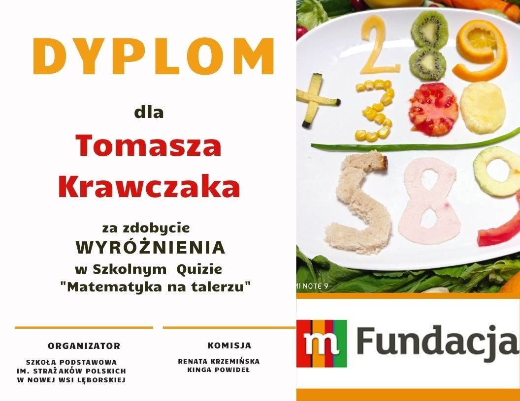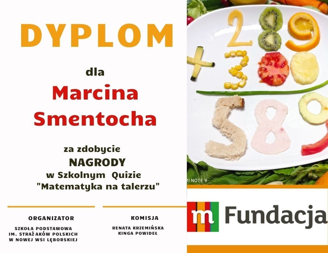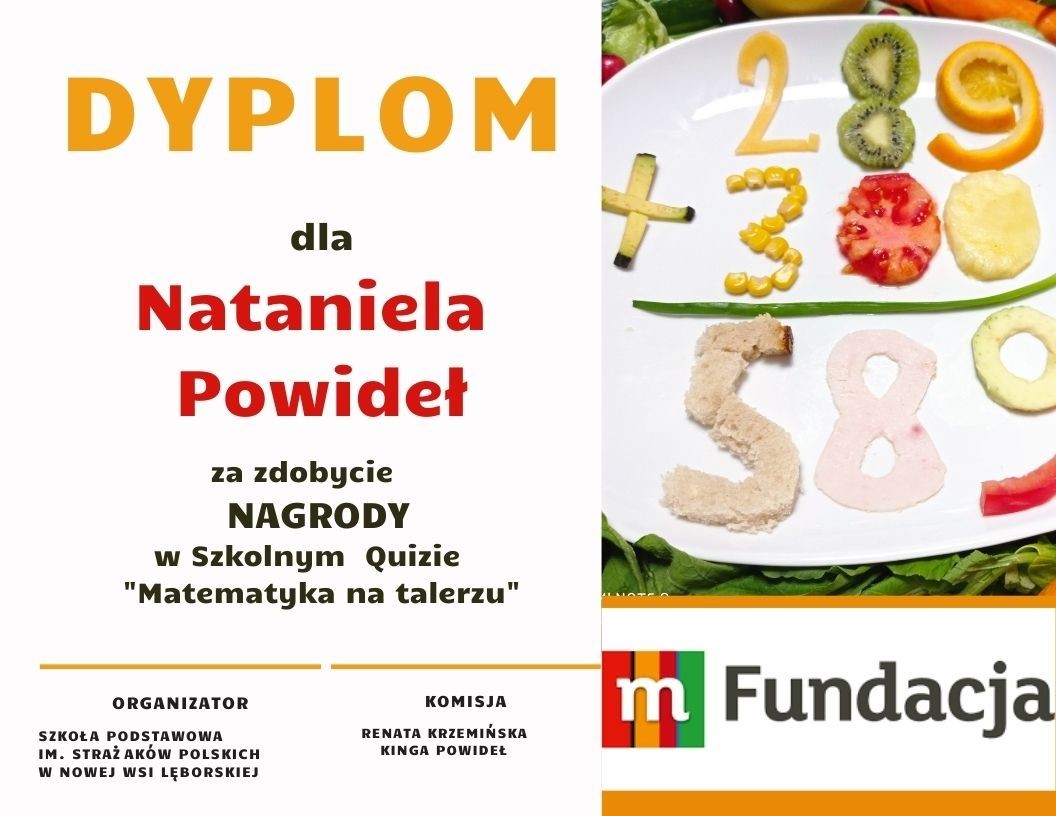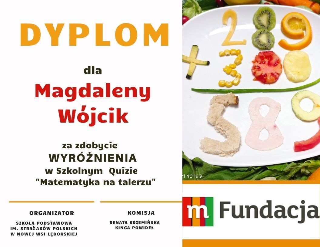 25 marca odbył się szkolny konkurs matematyczny dla klas IV-VI, zorganizowany w ramach realizacji projektu "Matematyka na talerzu", który jest częścią programu grantowego mPotęga. W quizie wzięły udział 34 osoby. Uczniowie rozwiązywali różnorodne zadania o zróżnicowanym poziomie trudności, oparte na żywieniu. W zadaniach pojawiły się proporcje, ułamki, obliczenia związane z kalorycznością produktów oraz ich ceną.