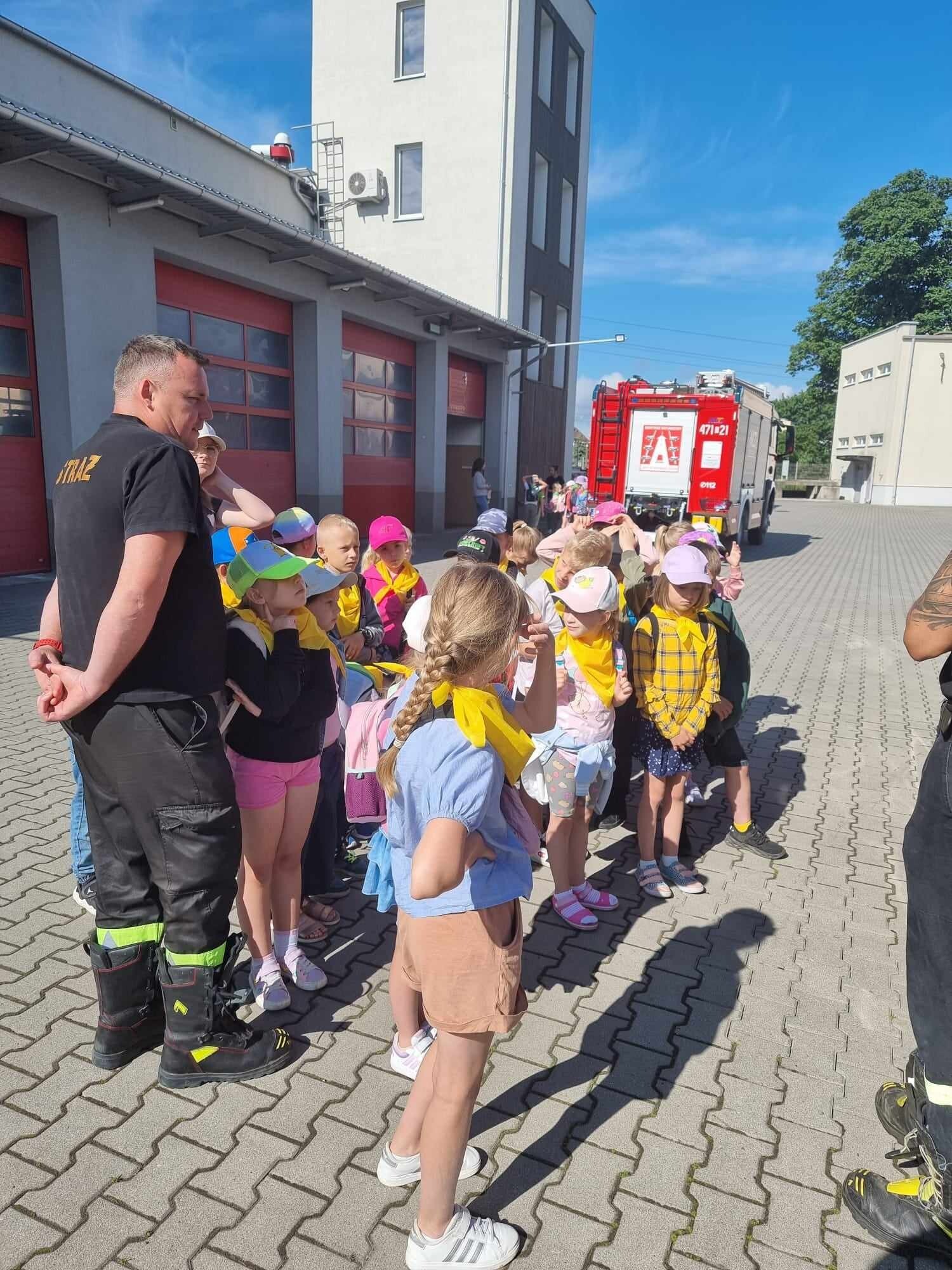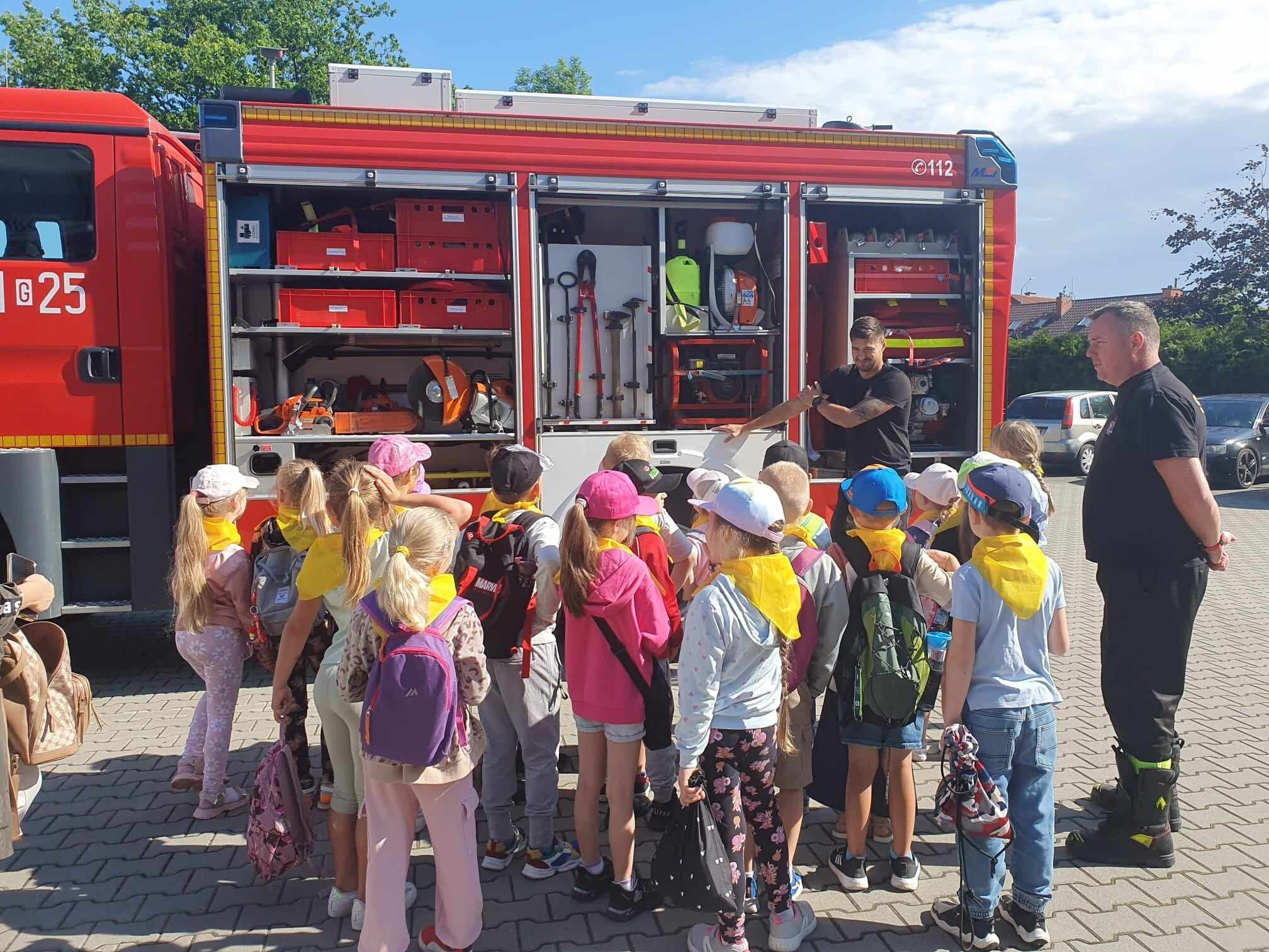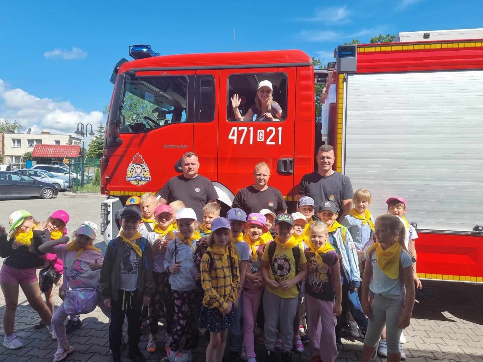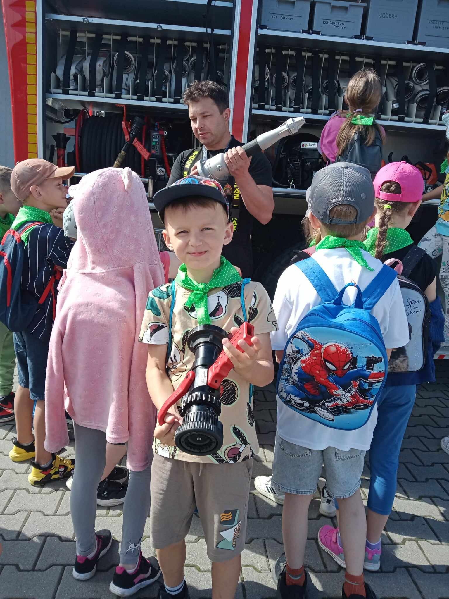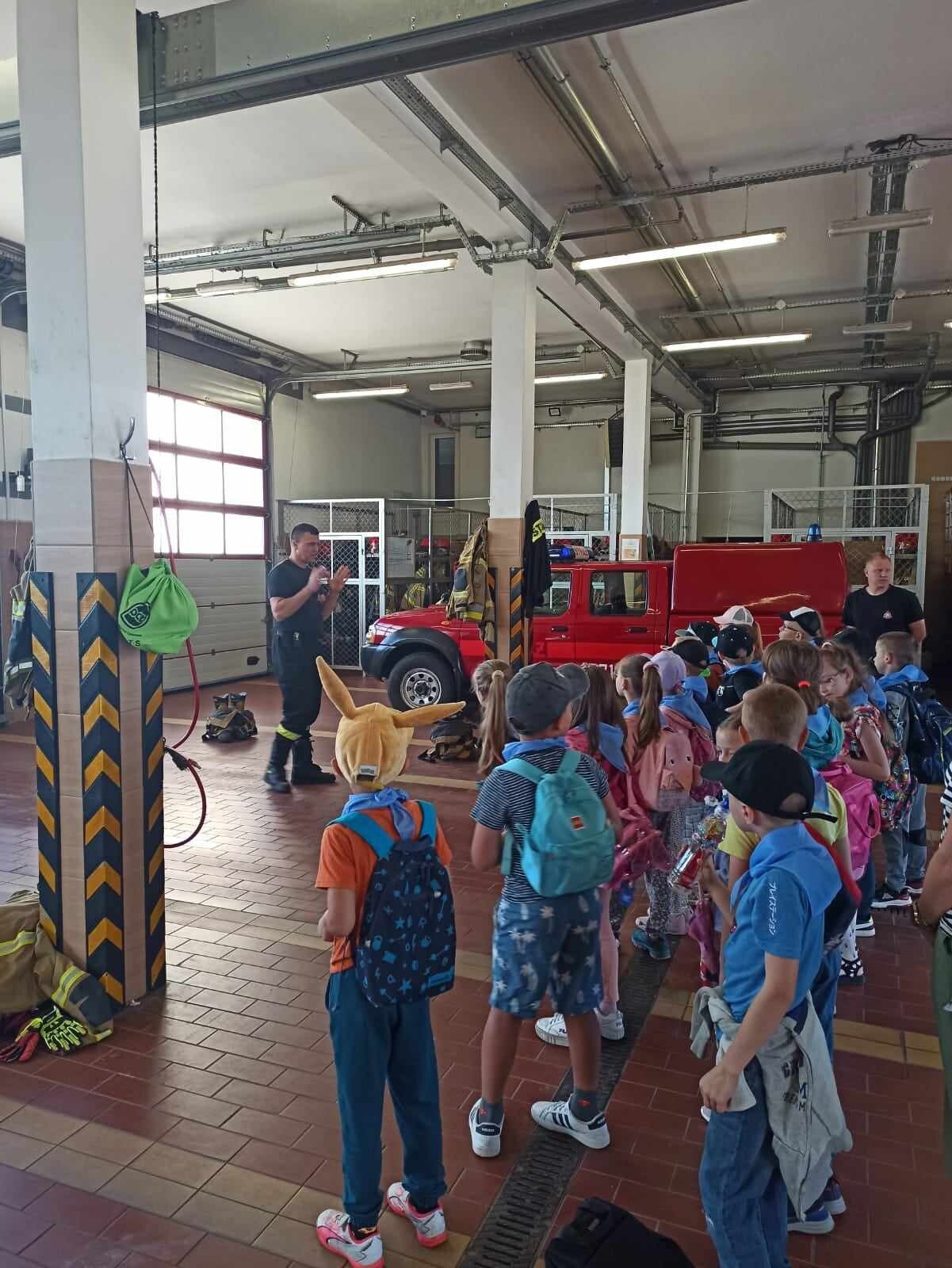 29 maja 2024 r. uczniowie klas pierwszych odwiedzili strażaków z Komendy Powiatowej Państwowej Straży Pożarnej w Lęborku. Celem wycieczki było zapoznanie uczniów ze sprzętem strażackim, udzielaniem pierwszej pomocy poszkodowanym oraz pracą Strażaka. W siedzibie Straży Pożarnej uczniowie zwiedzili wszystkie pomieszczenia. W czasie spotkania mogli zapoznać się ze sprzętem, któr.ego strażacy używają w różnych, trudnych warunkach oraz metodami używanymi w czasie gaszenia pożarów i ratowania ludzi z wypadków. Strażacy zademonstrowali zjazd po ześlizgu, a także sygnał dźwiękowy i świetlny wozów strażackich. Dzieciom przedstawiono również zasady bezpiecznego zachowania podczas zauważenia pożaru, możliwości bezpiecznej ewakuacji z zagrożonego budynku oraz jak prawidłowo wykonać zgłoszenie na numer alarmowy. Byliśmy również świadkami wezwania Strażaków do akcji!