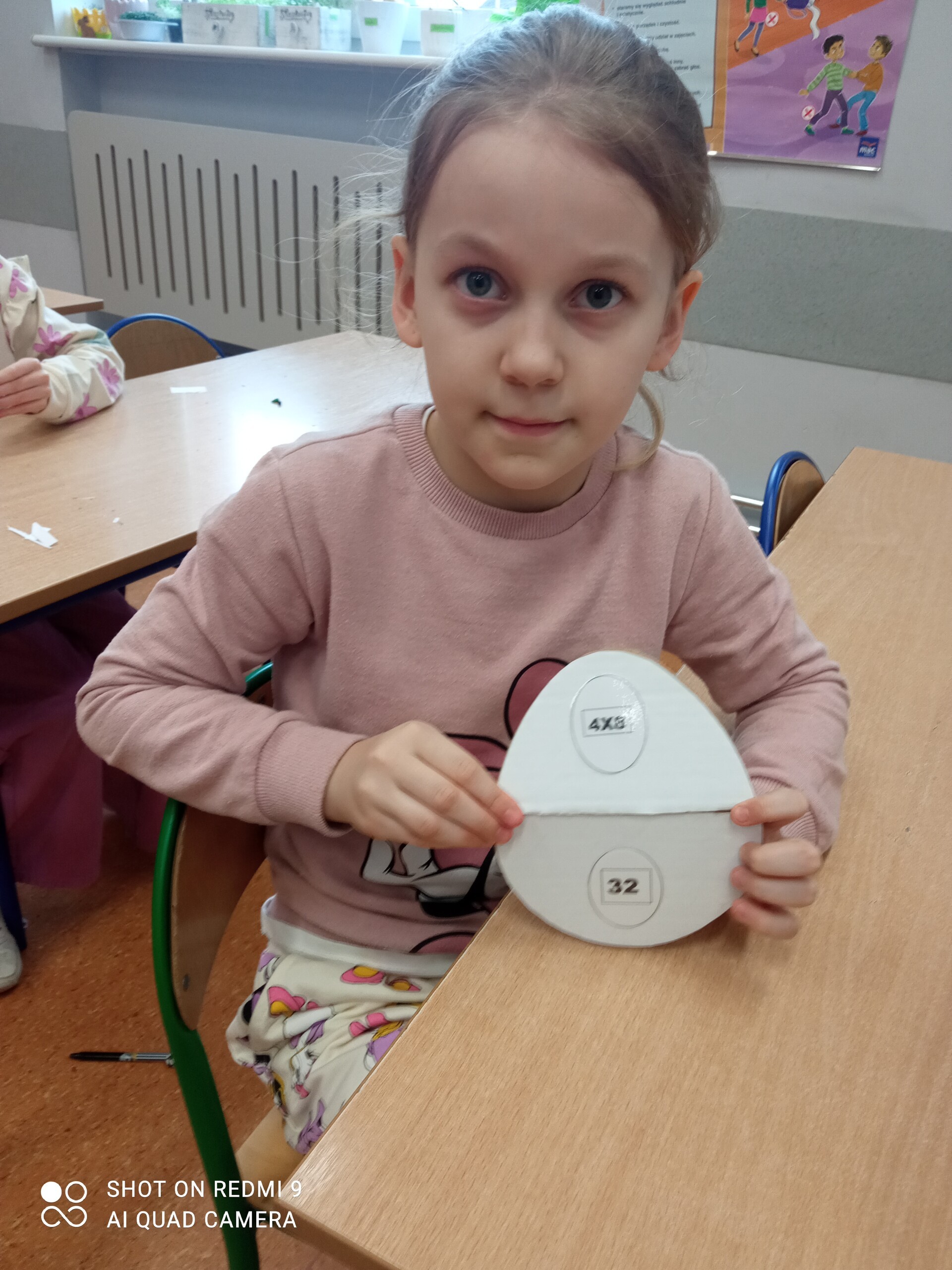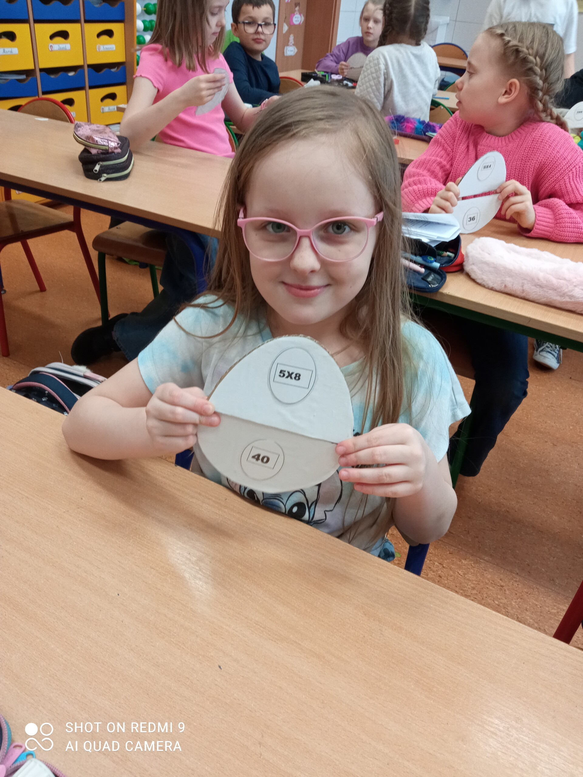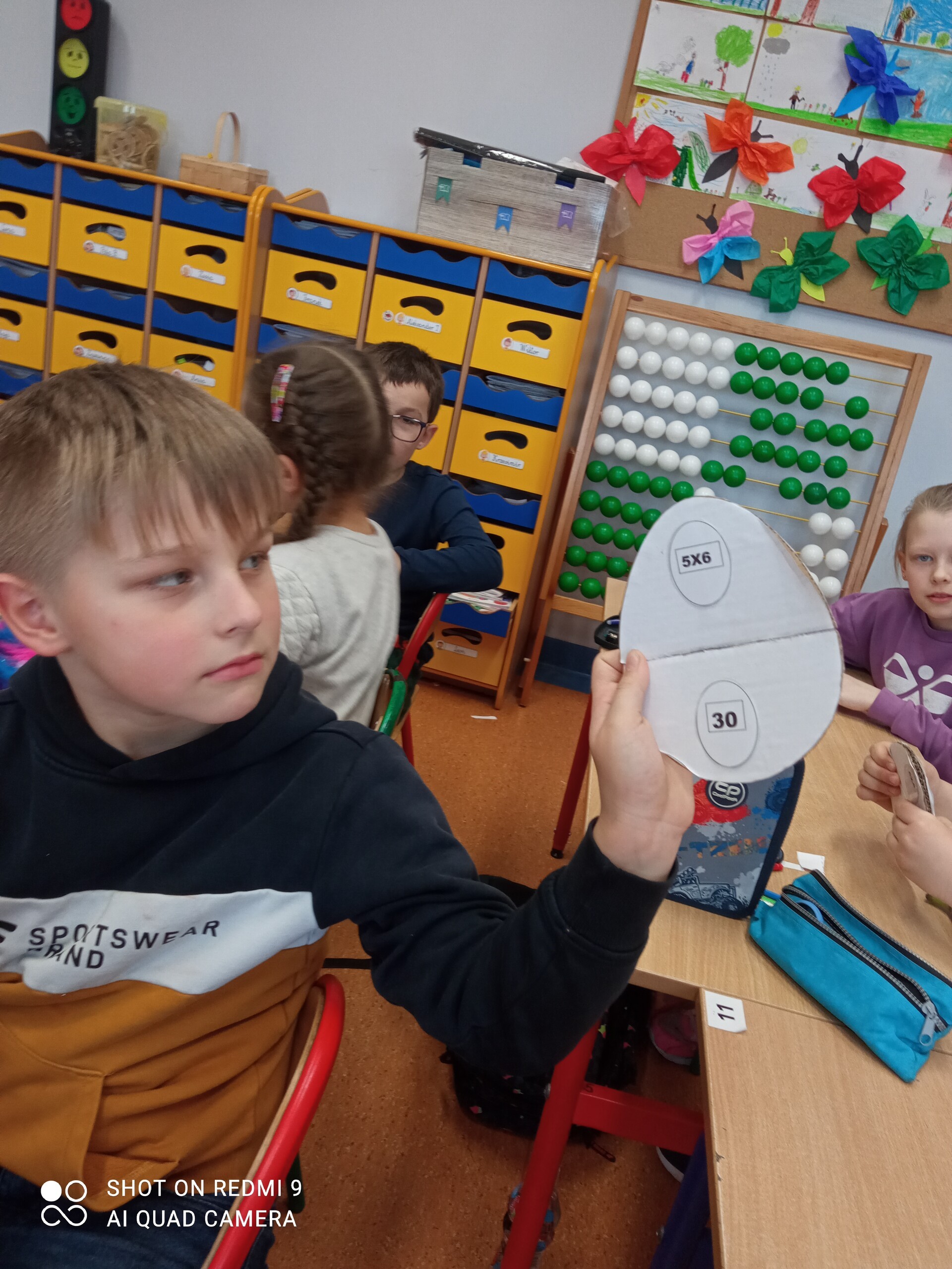 Zadaniem dzieci było wykonanie matematycznych pisanek. W ramach zajęć, uczniowie otrzymali połowę pisanki, na której znajdowało się działanie matematyczne (mnożenie). Zadaniem dzieci było odnalezienie drugiej połówki pisanki z właściwym wynikiem, która była ukryta w klasie. Gdy dzieci odnalazły już właściwe połówki, mogły ozdobić swoją pisankę według własnego pomysłu. Często były to działania matematyczne. Pisanki wykorzystywaliśmy jeszcze podczas zajęć do utrwalania tabliczki mnożenia.
