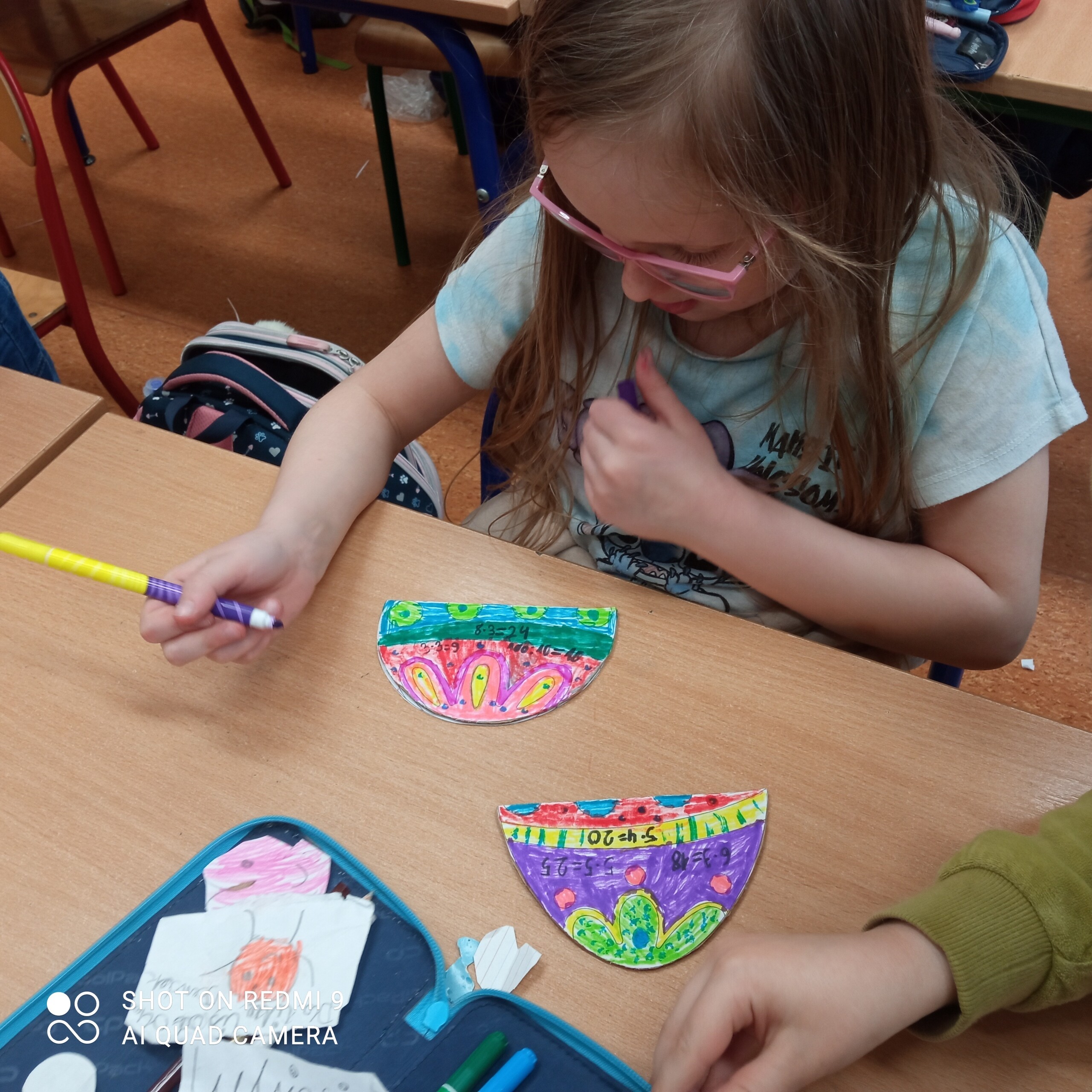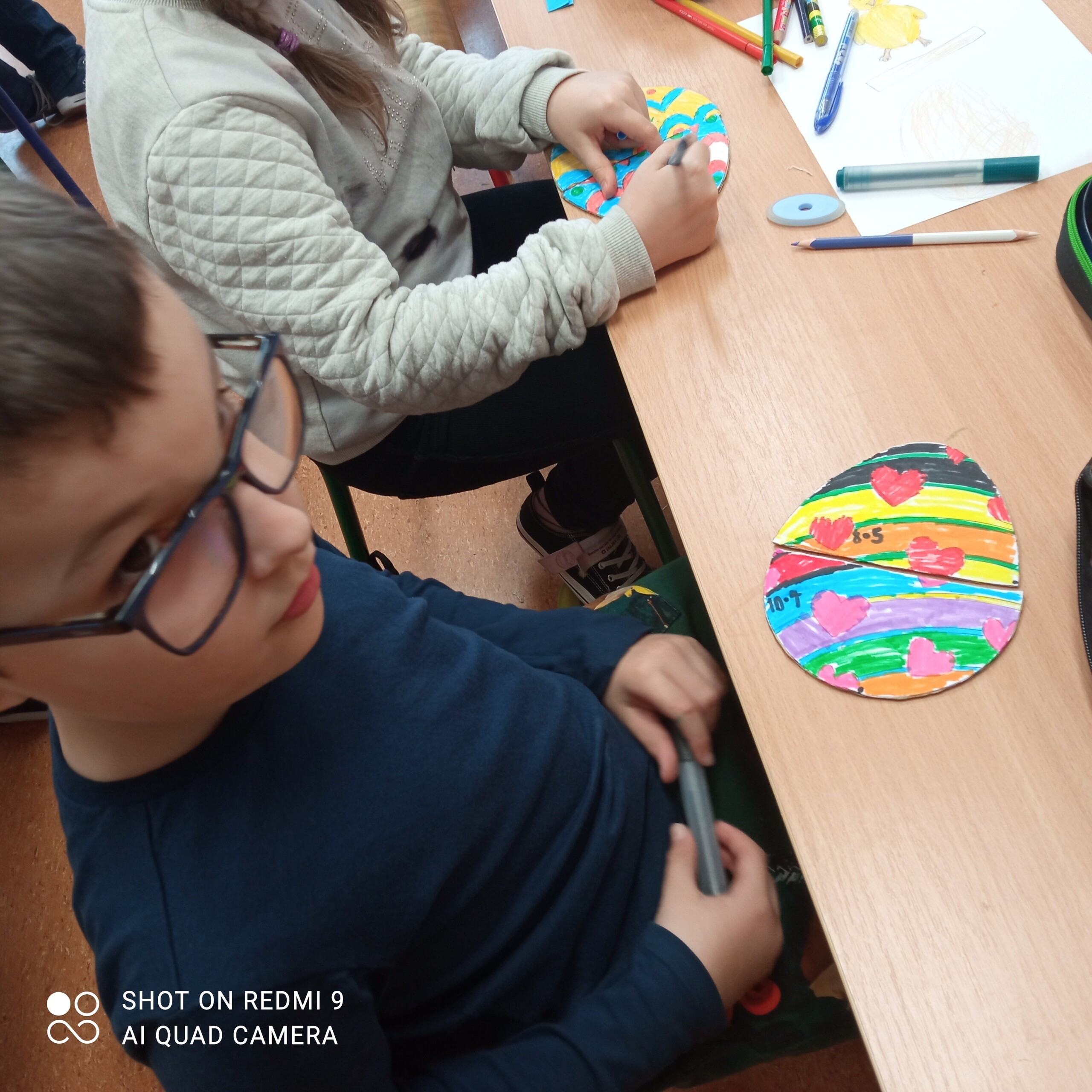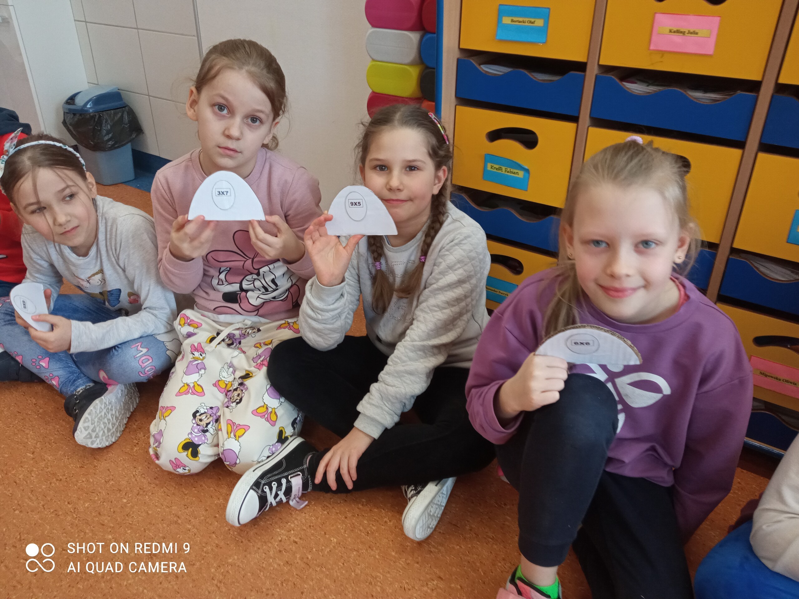 Zadaniem dzieci było wykonanie matematycznych pisanek. W ramach zajęć, uczniowie otrzymali połowę pisanki, na której znajdowało się działanie matematyczne (mnożenie). Zadaniem dzieci było odnalezienie drugiej połówki pisanki z właściwym wynikiem, która była ukryta w klasie. Gdy dzieci odnalazły już właściwe połówki, mogły ozdobić swoją pisankę według własnego pomysłu. Często były to działania matematyczne. Pisanki wykorzystywaliśmy jeszcze podczas zajęć do utrwalania tabliczki mnożenia.