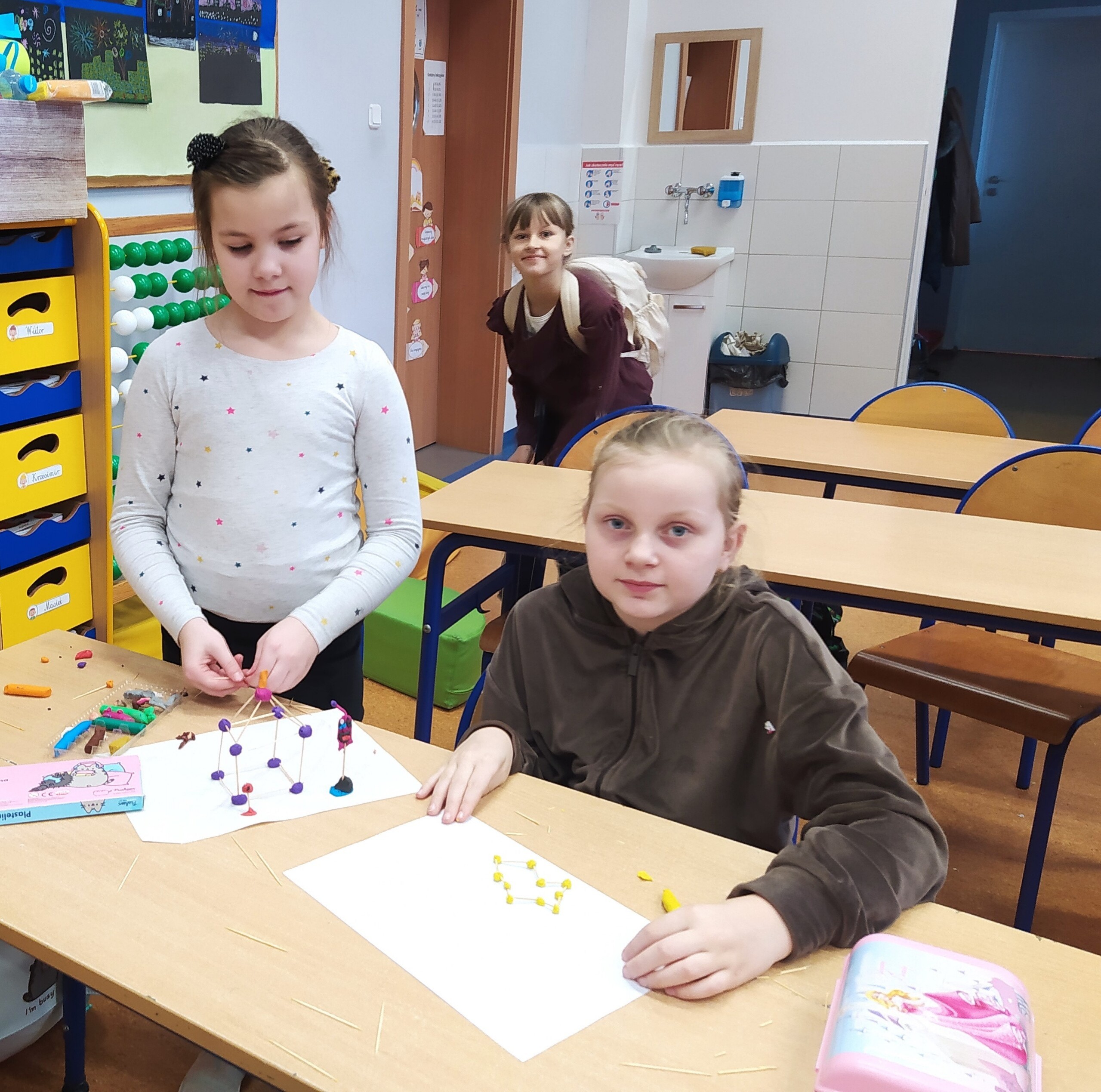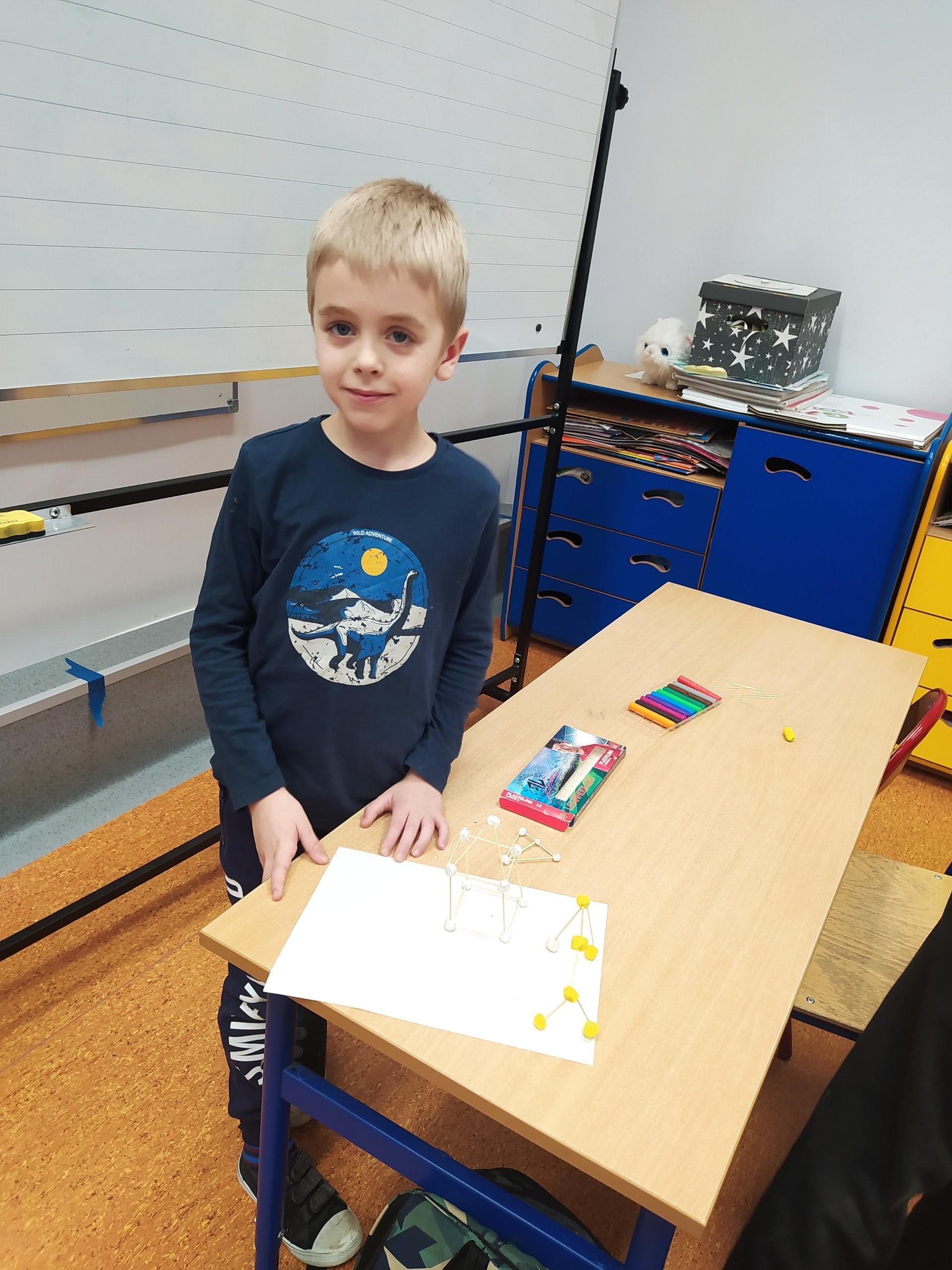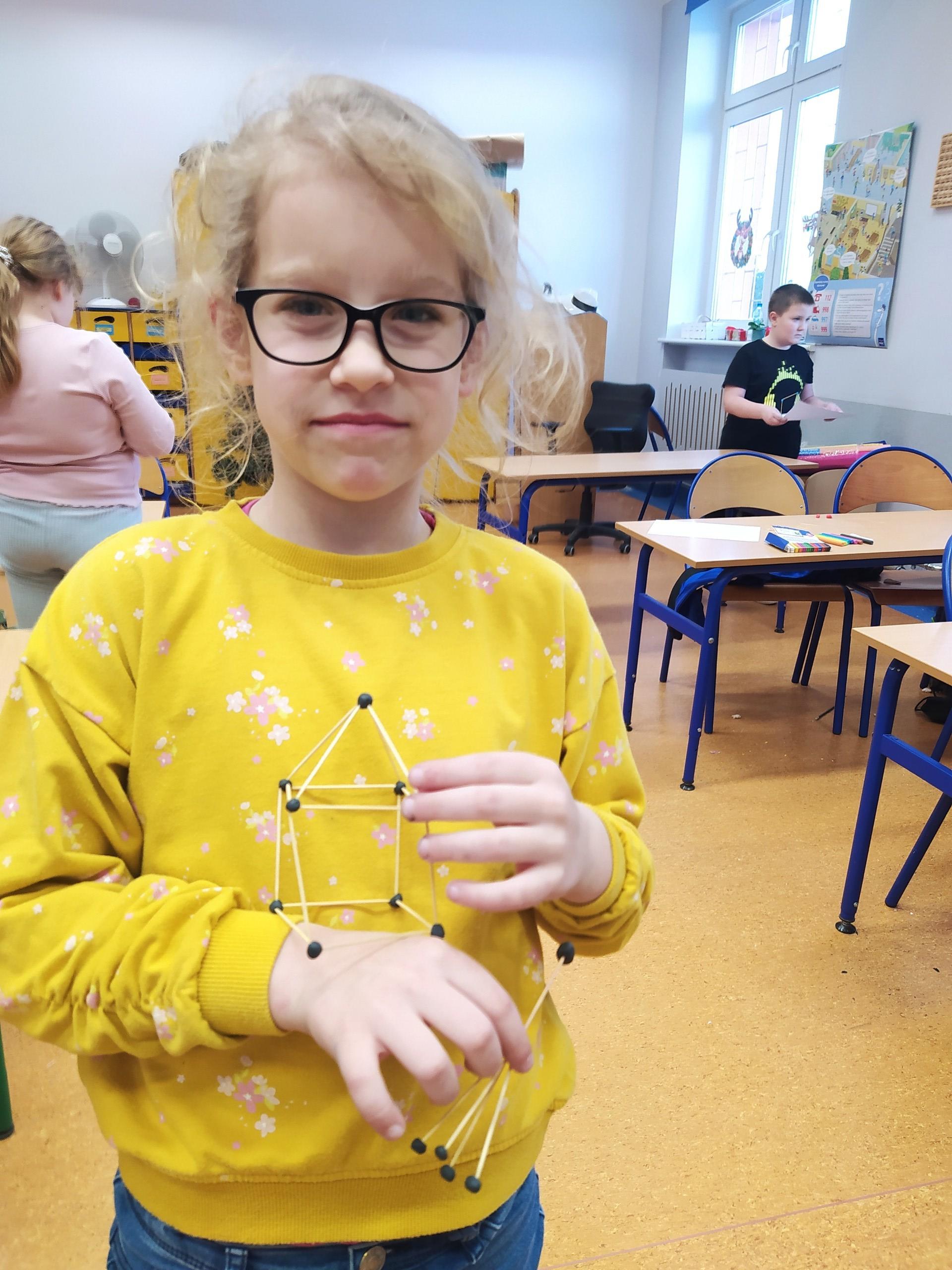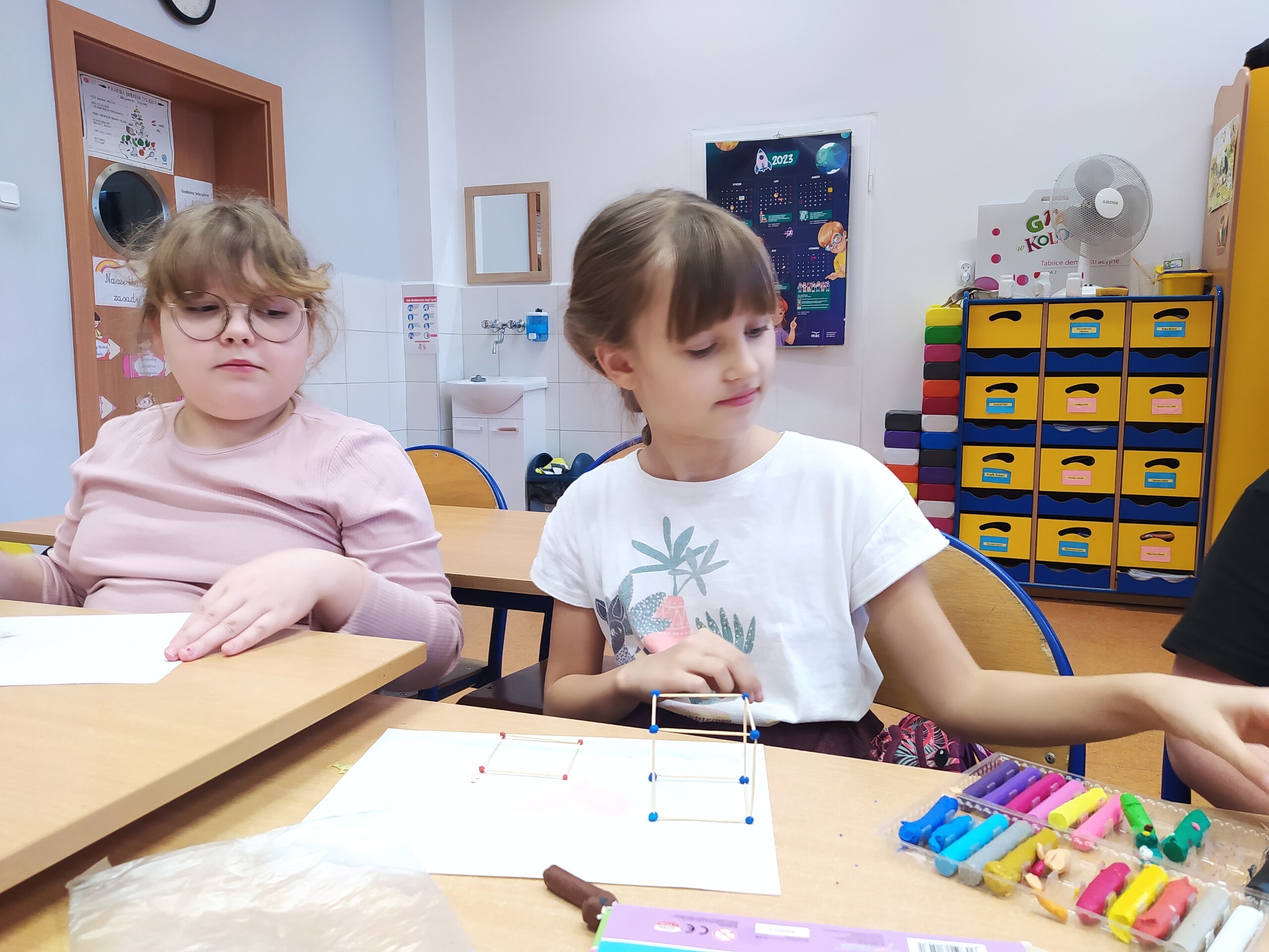 Zadaniem uczniów było budowanie szkieletów brył z patyczków i plasteliny. Do realizacji zadania uczniowie przystąpili z wielkim zapałem. Każdy miał okazję wykazać się własną inwencją i pomysłowością.