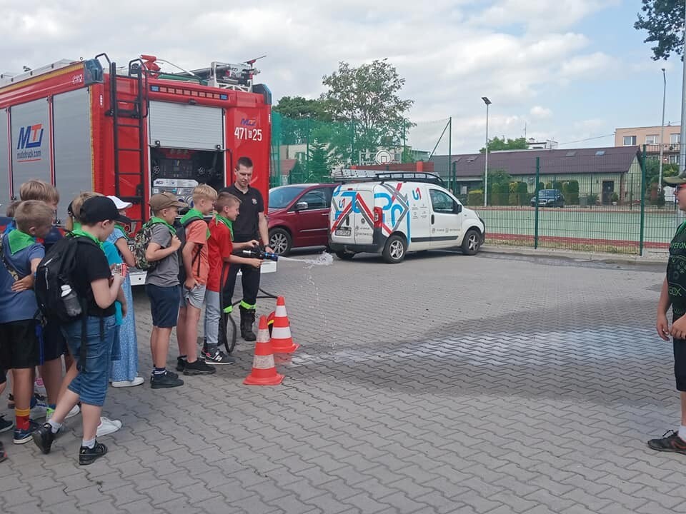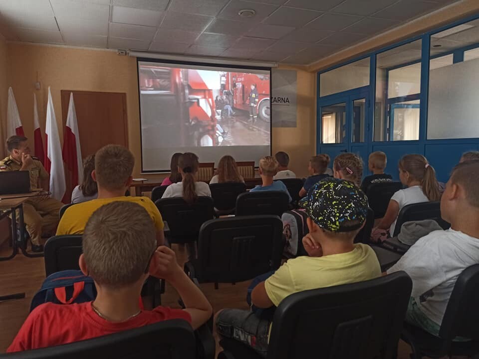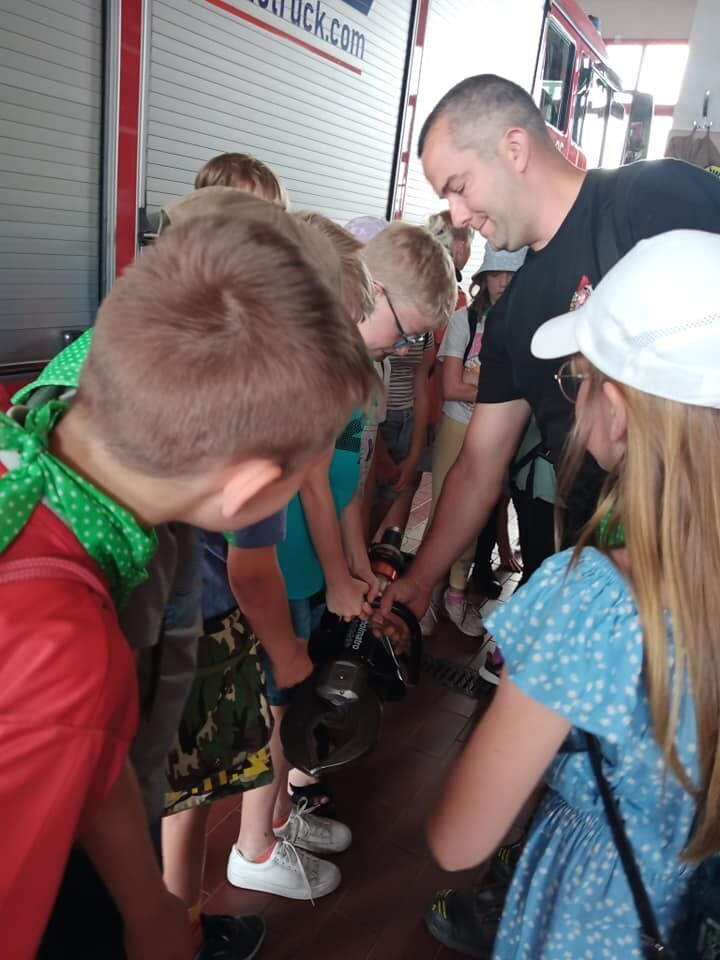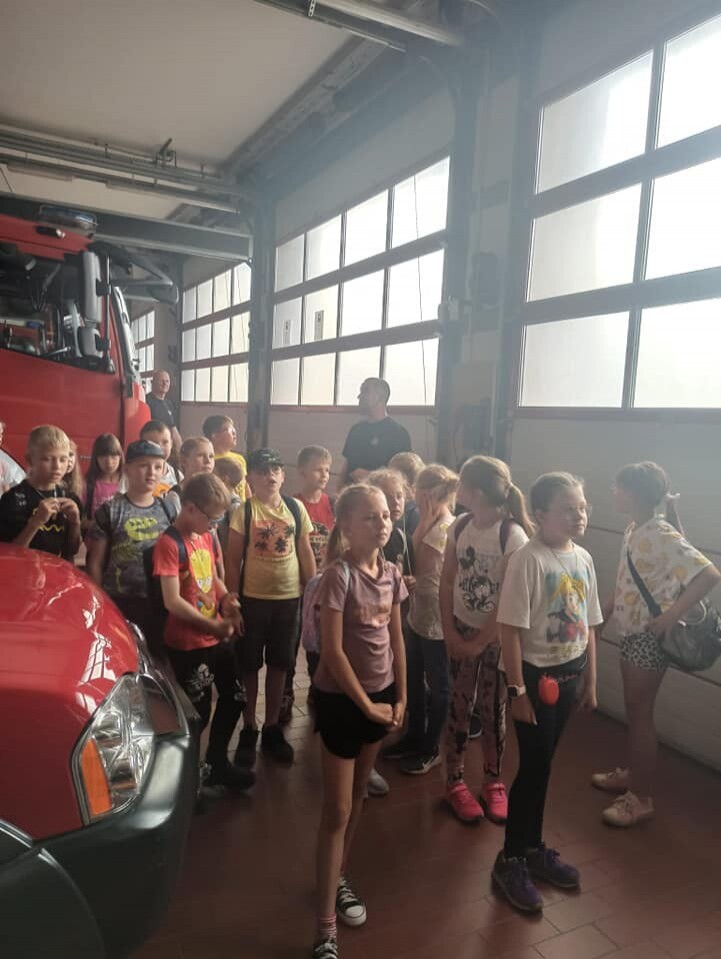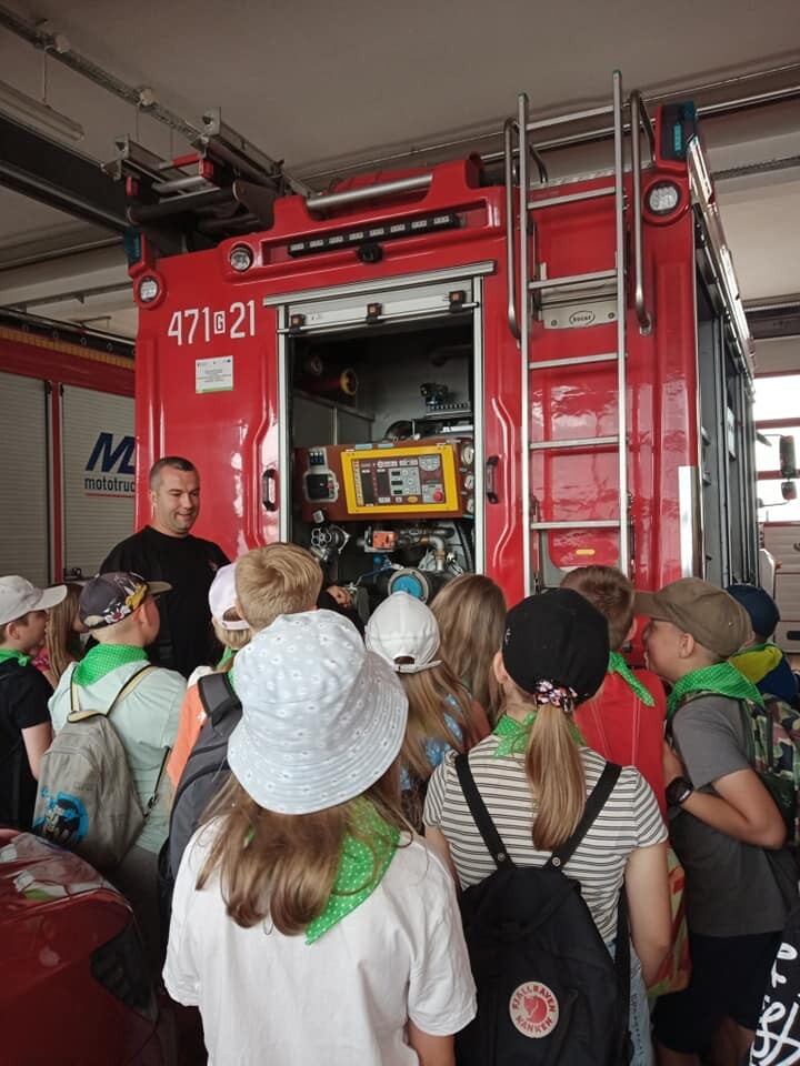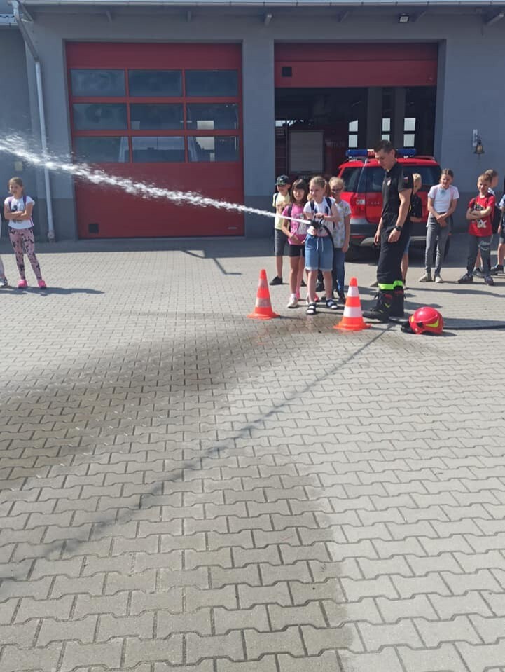 19 czerwca 2023 r. uczniowie klas trzecich pod opieką wychowawców udali się z wizytą do Komendy Powiatowej Państwowej Straży Pożarnej w Lęborku. Celem wycieczki było zapoznanie uczniów ze sprzętem strażackim, udzielaniem pierwszej pomocy poszkodowanym oraz pracą Strażaka. W siedzibie Straży Pożarnej uczniowie zwiedzili wszystkie pomieszczenia. W czasie spotkania mogli zapoznać się ze sprzętem, którego strażacy używają w różnych, trudnych warunkach oraz metodami używanymi w czasie gaszenia pożarów i ratowania ludzi z wypadków. Strażacy zademonstrowali zjazd po ześlizgu, a także sygnał dźwiękowy i świetlny wozów strażackich. Dzieciom przedstawiono również zasady bezpiecznego zachowania podczas zauważenia pożaru, możliwości bezpiecznej ewakuacji z zagrożonego budynku oraz jak prawidłowo wykonać zgłoszenie na numer alarmowy.