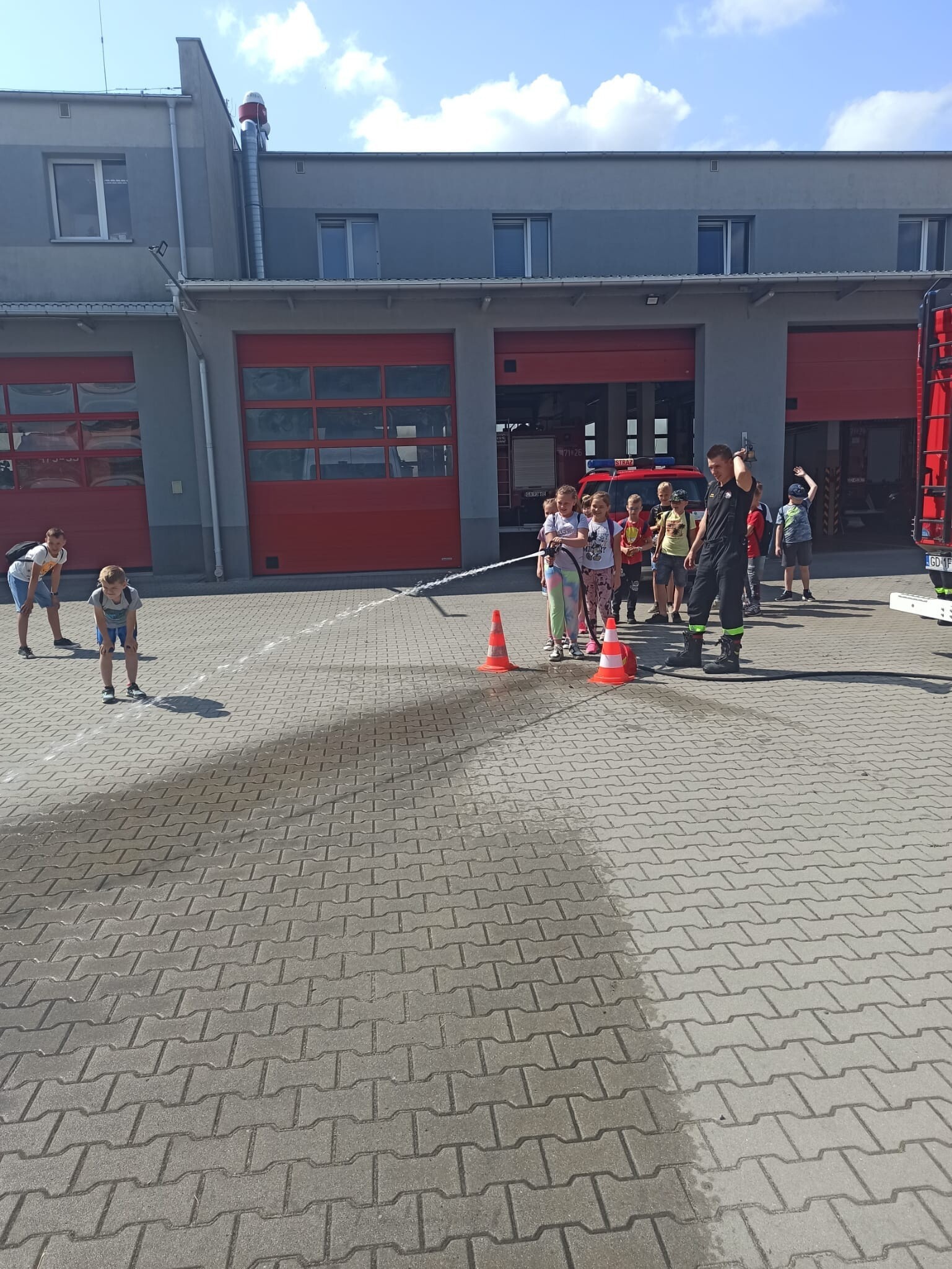Na zakończenie, pod czujnym okiem strażaka, dzieci mogły wypróbować sprzęt gaśniczy. Zadowoleni i pełni wrażeń wróciliśmy do szkoły.