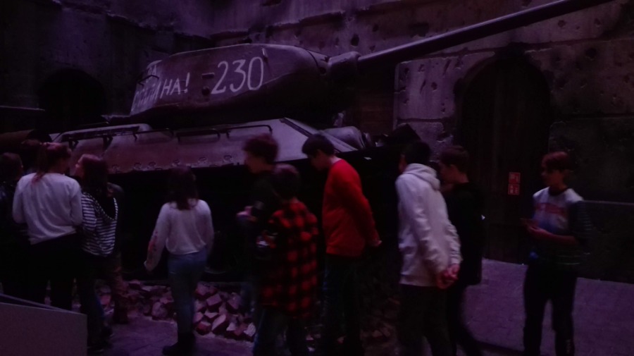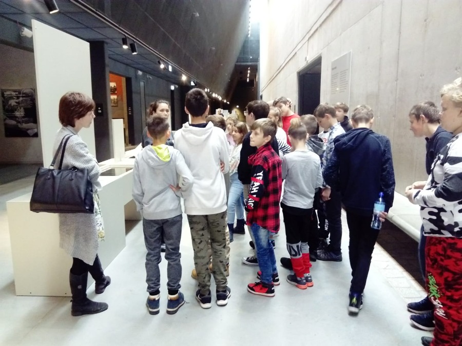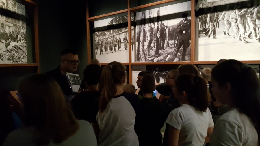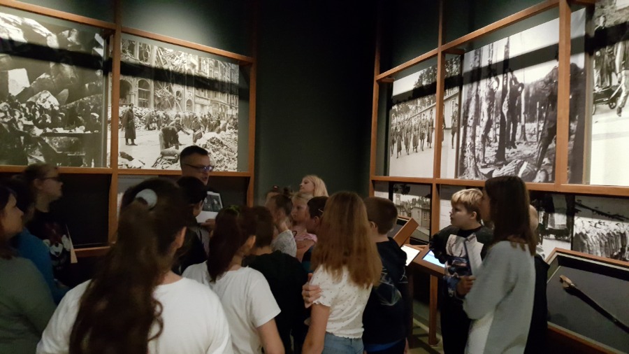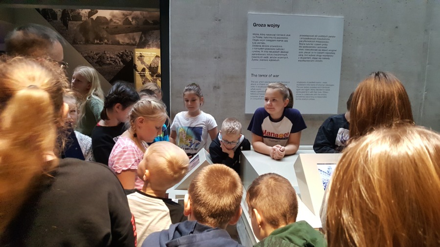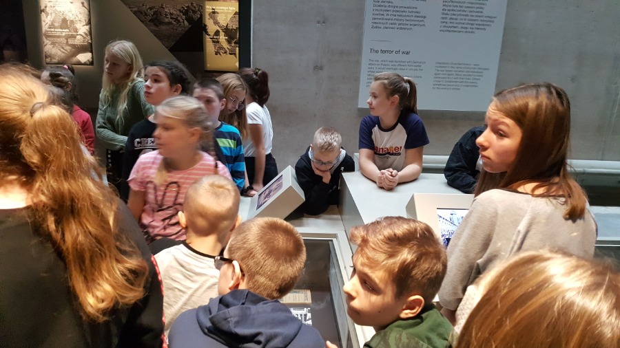 Po zajęciach klasy wraz z opiekunkami zwiedziły wystawę główną w Muzeum, zajmującą powierzchnię niemal 5 tys. m2, umiejscowioną 14 metrów pod ziemią. To opowieść o tragicznym doświadczeniu II wojny światowej, o jej genezie i skutkach, o ofiarach i sprawcach, o bohaterach i zwykłych ludziach. Ma przypominać lekcję historii, której nie wolno nam zapomnieć.