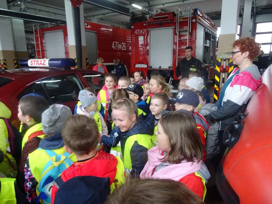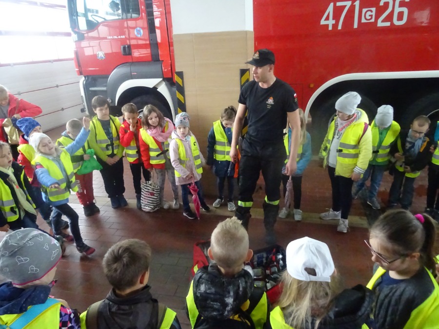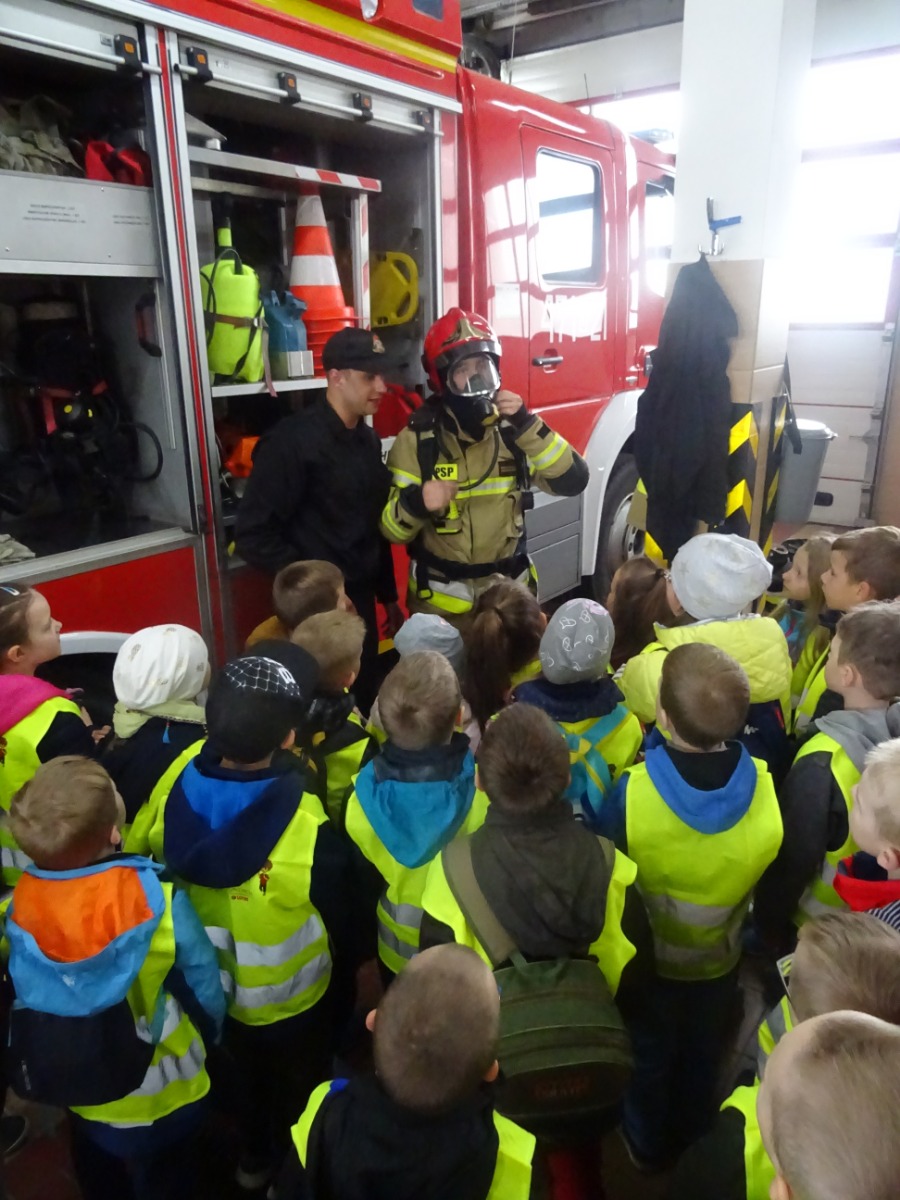 Strażacy zaprezentowali sprzęt pożarniczy stanowiący wyposażenie jednostki. Dzieci oglądały wozy strażackie i sprzęt do gaszenia pożarów. Uczniowie zapoznali się z zadaniami realizowanymi przez straż pożarną, sposobami alarmowania oraz zachowania się w przypadku zagrożenia. Wszyscy z wielkim zaciekawieniem wysłuchali o pracy strażaka w akcjach ratowniczo-gaśniczych.