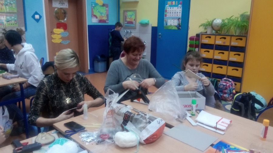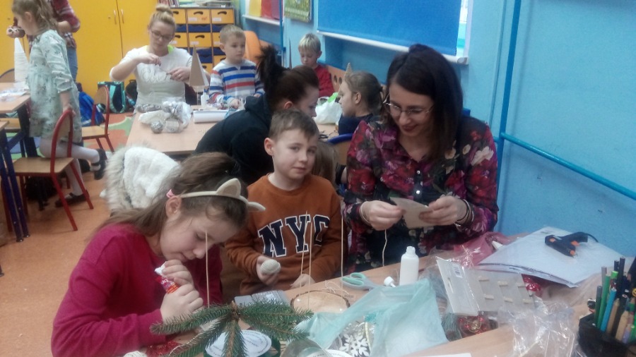 Uczniowie klasy 1 b zaprosili do szkoły swoich najbliższych, aby wspólnie z nimi wykonać świąteczne ozdoby, które następnie zostały przekazane na kiermasz świąteczny. Wspólna praca okazała się bardzo owocna