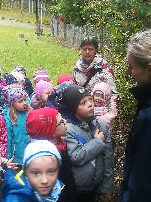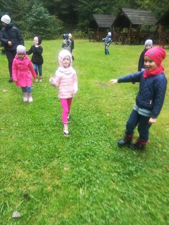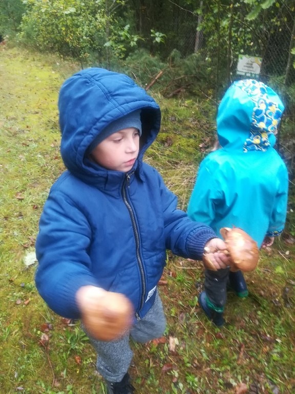 1 października uczniowie grup 0 a i 0 b spędzili czas na ścieżce leśno-przyrodniczej Uroczysko Drętowo Nadleśnictwa Lębork. Zajęcia edukacyjne z dziećmi poprowadziła pani leśniczy. Ciekawie opowiadała o różnorodnymi gatunkach drzew. Wiele emocji wzbudziła gablota, przedstawiająca nazwy leśnych mieszkańców. Niektórzy próbowali nawet wcielić się w różne postacie zwierząt leśnych, poprzez włożenie swojej głowy w odpowiedni otwór sylwetki zwierzęcej. Po pokonaniu całej ścieżki odpoczywaliśmy przy ognisku, przy którym piekliśmy kiełbaski. Nie zabrakło też czasu na swobodne zabawy na powietrzu. Do szkoły wróciliśmy w doskonałych nastrojach oraz z … pokaźnymi zbiorami grzybów.