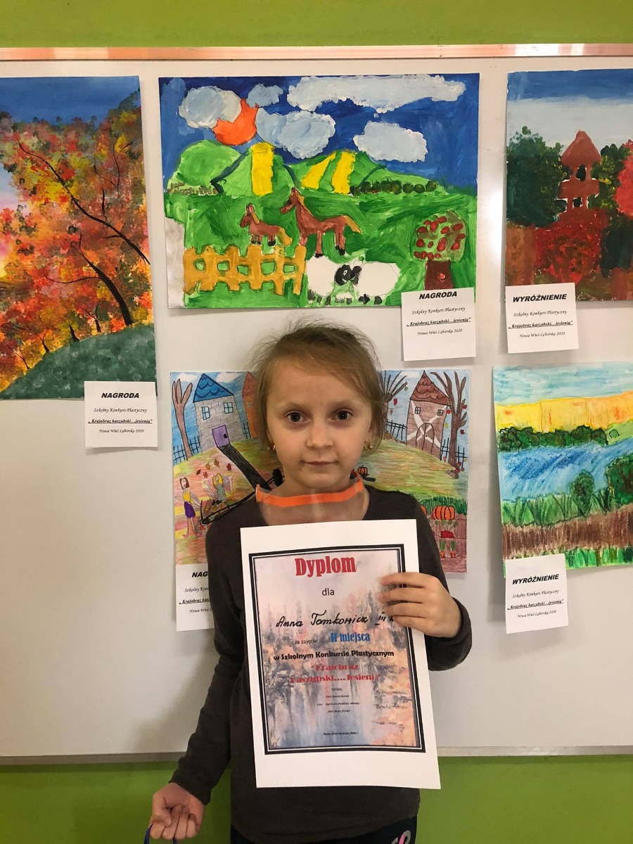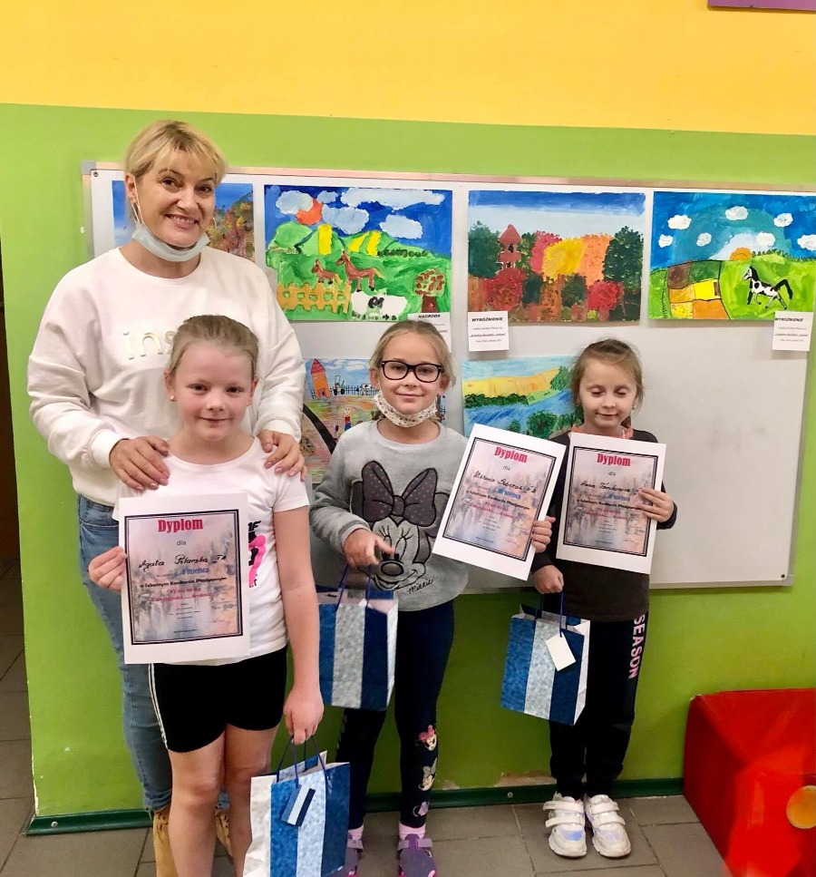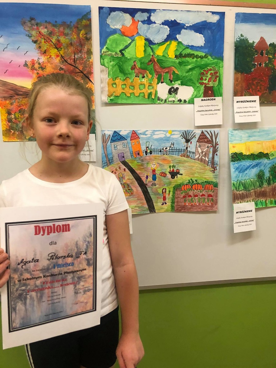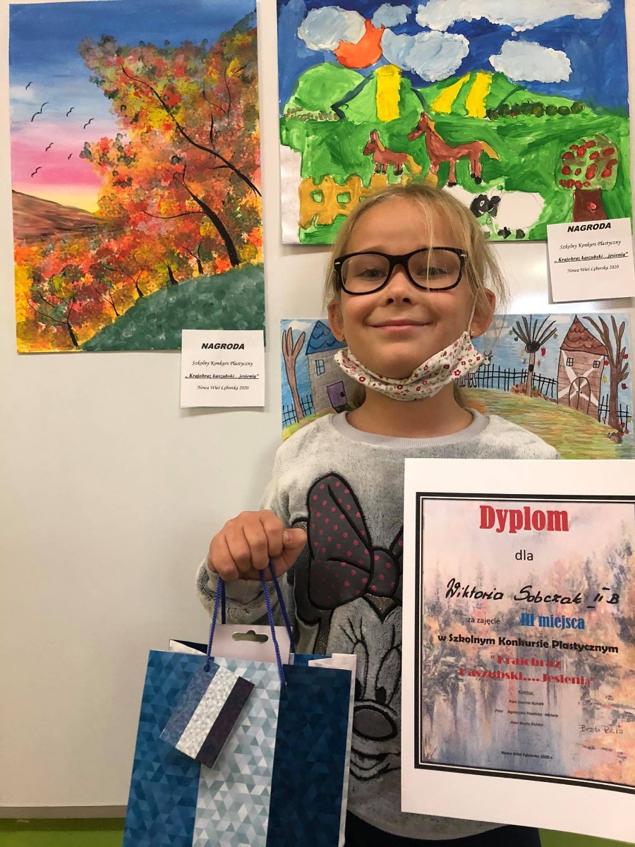 W dniu 6 listopada 2020r Pani Joanna Buniek wręczyła nagrody autorom najładniejszych prac plastycznych. W Szkolnym Konkursie Plastycznym pt.” Krajobraz Kaszubski ....jesienią” pierwsze miejsce zajęła Agatka Pilarska z klasy 1a, drugie miejsce zajęła Ania Tomkowicz z klasy 3a , trzecie miejsce zajęła Wiktoria Sobczak z klasy 2b. Gratulacje dla naszych szkolnych artystek