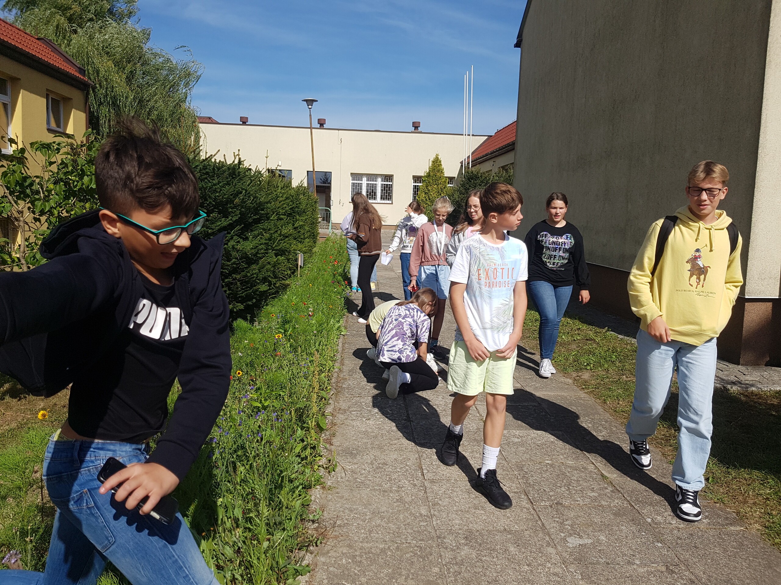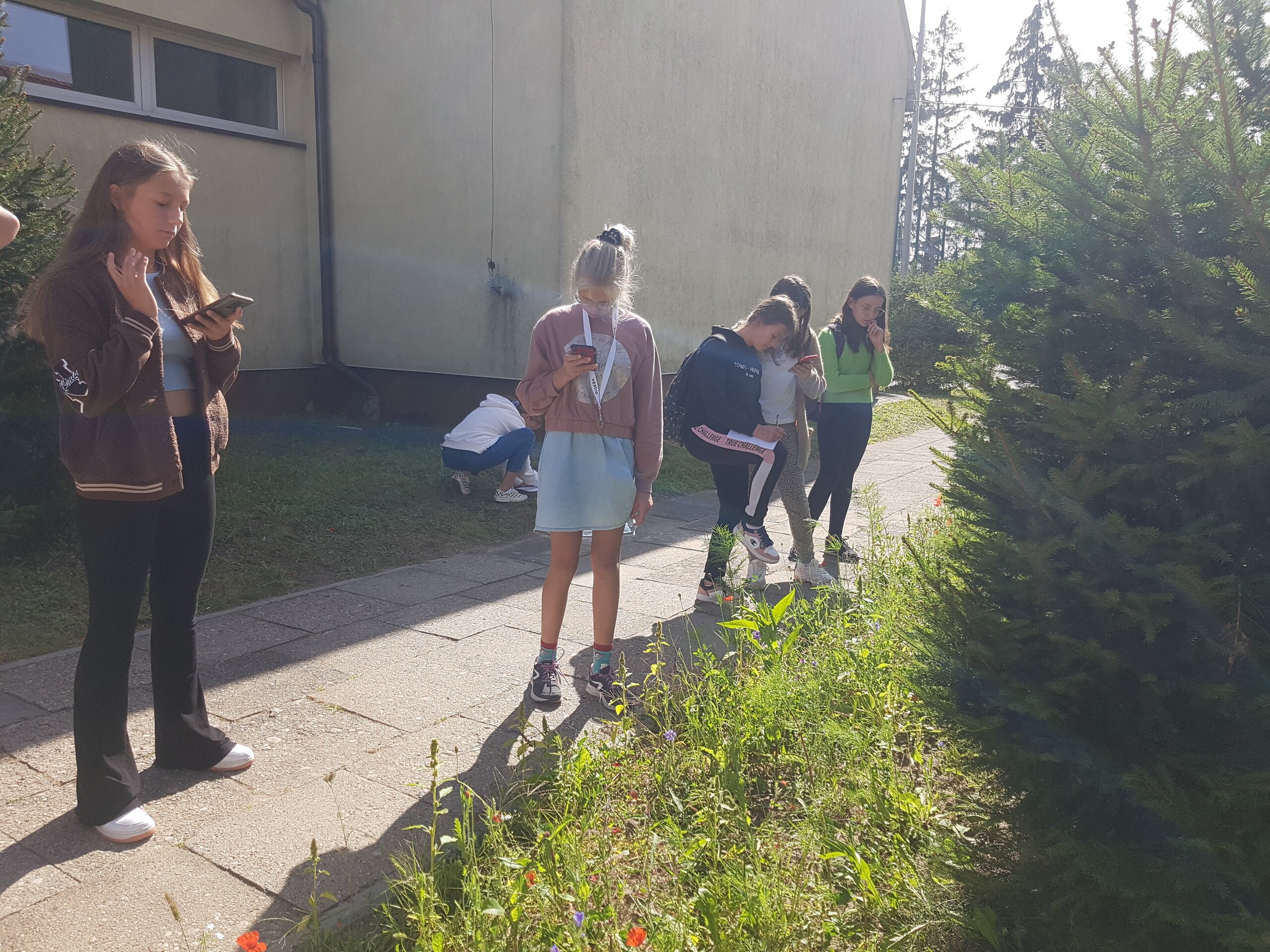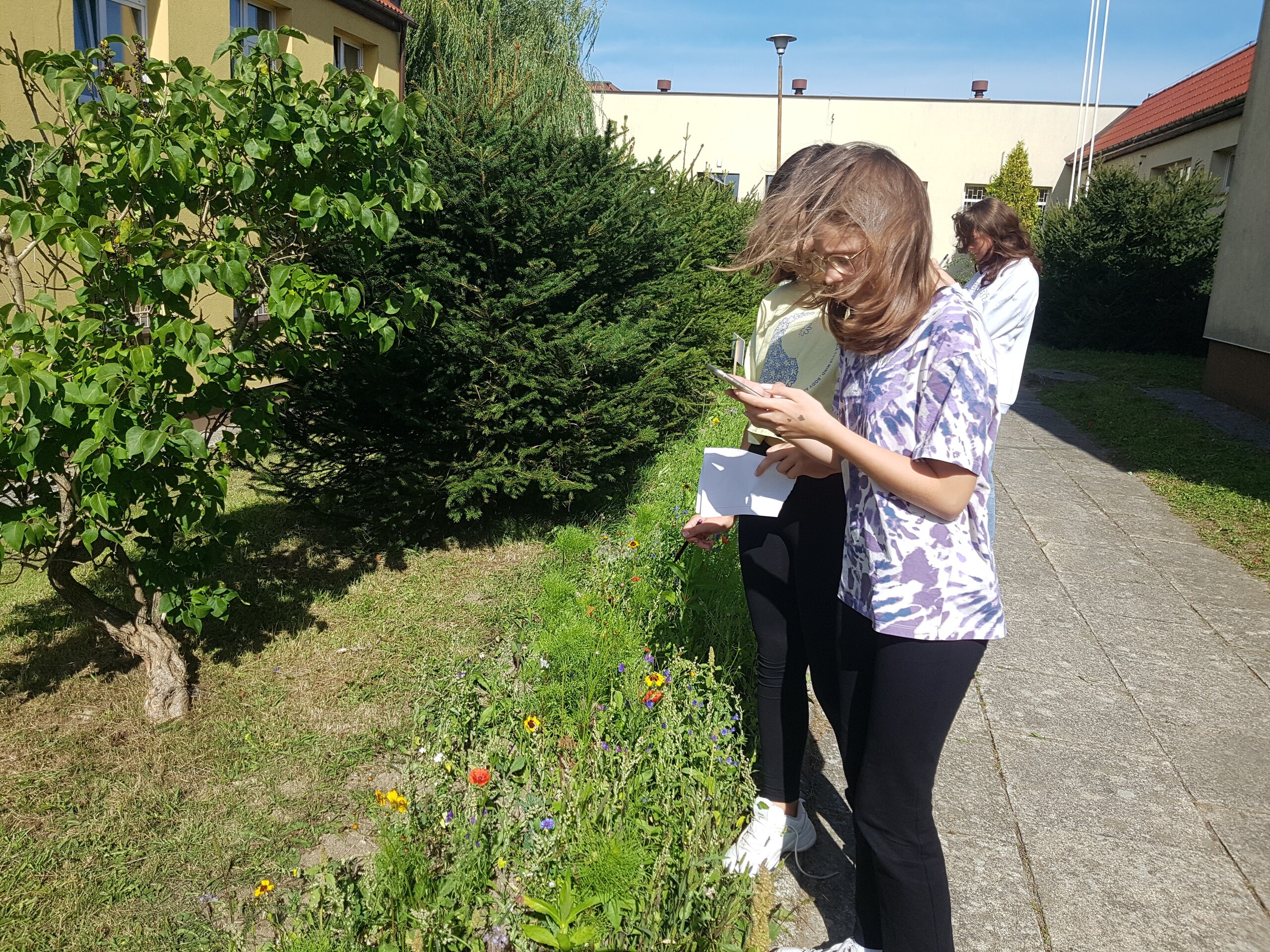 Podczas pierwszych zajęć uczniowie udali się na przyszkolną kwietną łąkę, gdzie rozpoznawali gatunki roślin miododajnych za pomocą różnych aplikacji. Wszyscy pracowali z dużym zaangażowaniem.