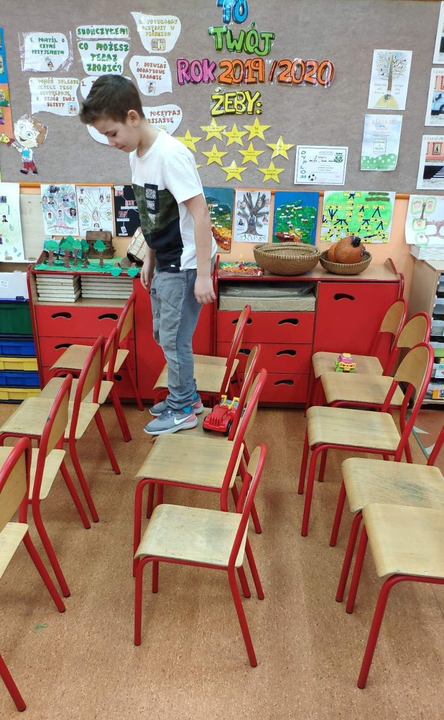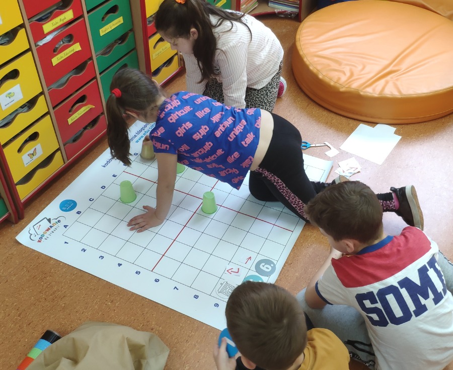 Na zajęciach przeprowadzonych według zaproponowanego scenariusza uczniowie stworzyli trasę dla swoich kolegów na macie do kodowania. Następnie wykonali labirynt z krzeseł i zakodowali trasę w taki sposób, że osoba, która przechodziła po labiryncie musiała robić to zgodnie ze wskazanym warunkiem.