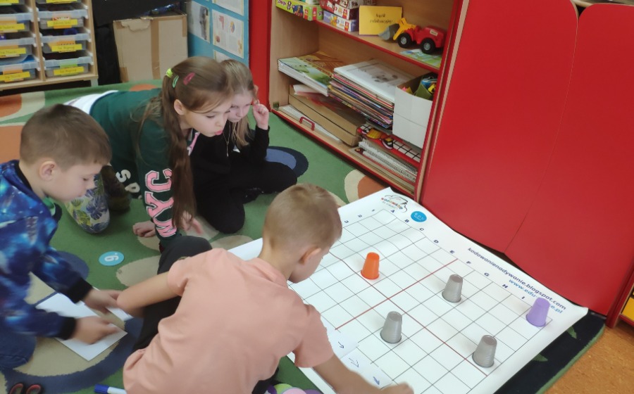 Klasa II b rozpoczęła na początku roku przygodę z kodowaniem. Uczniowie biorą udział w zajęciach dodatkowych z Kodowania na dywanie.