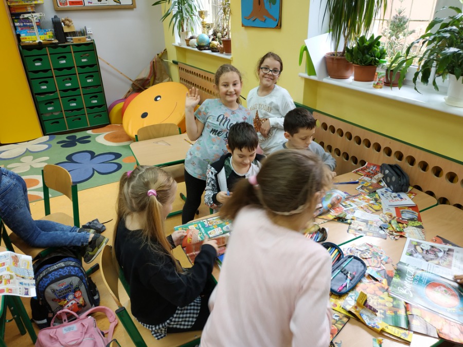 Klasa 3A w ramach projektu ,,Szkoła promująca zdrowie’’ wykonała plakaty na temat zdrowej żywności. Wszystkie dzieci przyniosły gazetki, ulotki z supermarketów z produktami spożywczymi. Każdy samodzielnie wycinał produkty z podziałem na zdrowe i niezdrowe. Następnie uczniowie zostali podzieleni na 3 grupy, każda z nich miała najpierw wybrać przewodniczącego grupy, który kierował pracą zespołu, po czym wspólnie dzielili produkty należące do zdrowej i niezdrowej żywności. Wszelkie niepewności omawiali z p. Alicją i p. Dorotą. Dzieci poszerzały swoją wiedzę na temat zdrowego odżywiania, a przy okazji uczyły się współpracy w grupie i zasady: ,,co dwie głowy to nie jedna”.