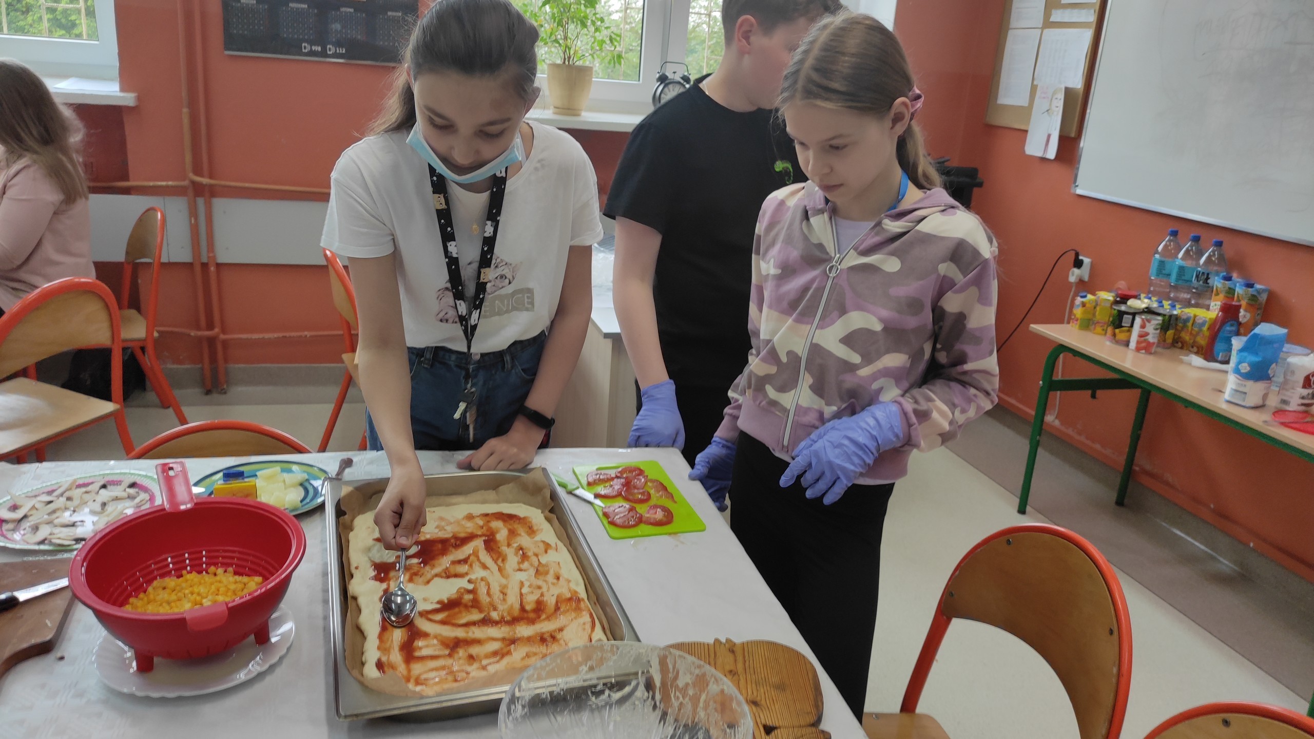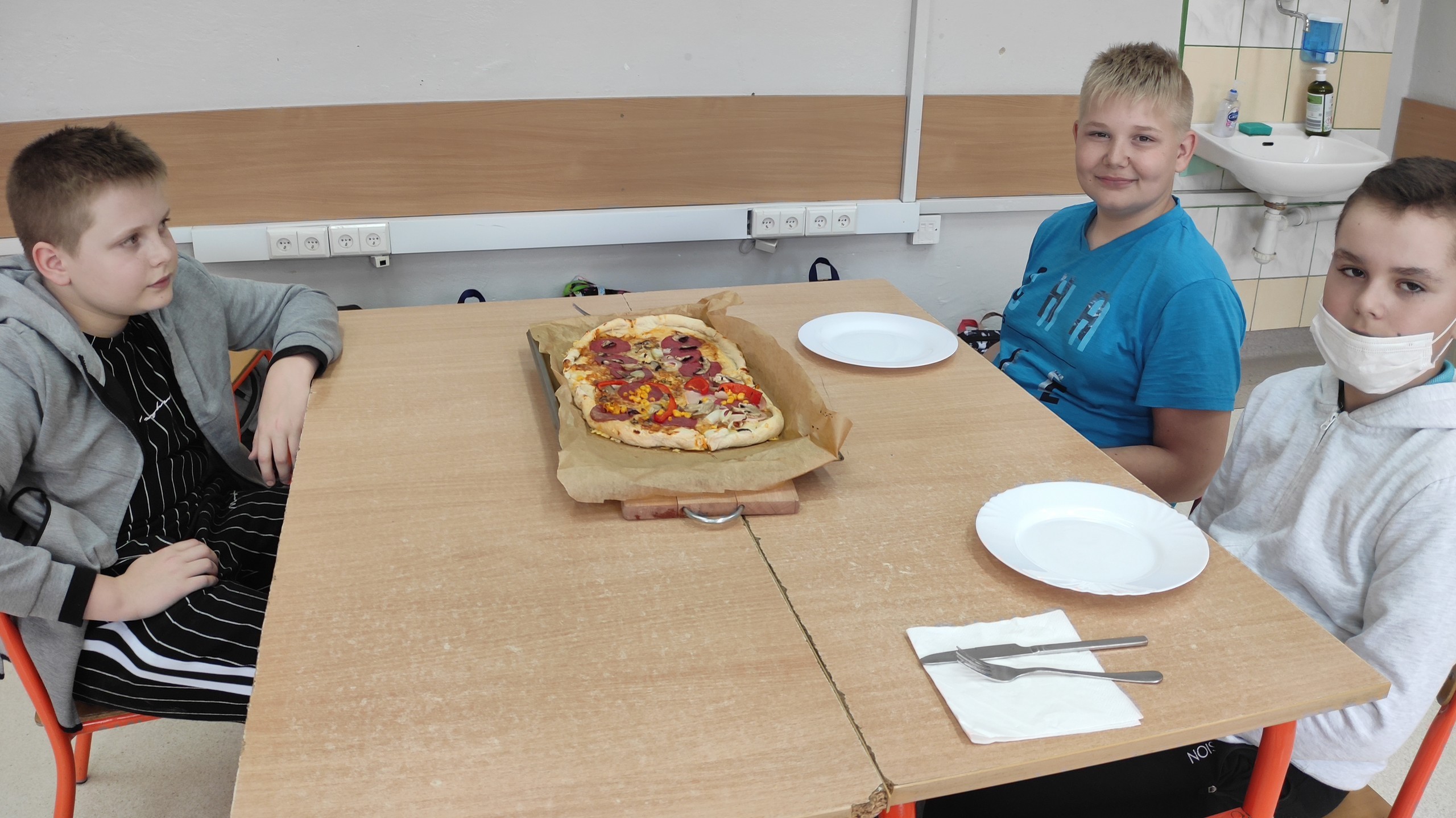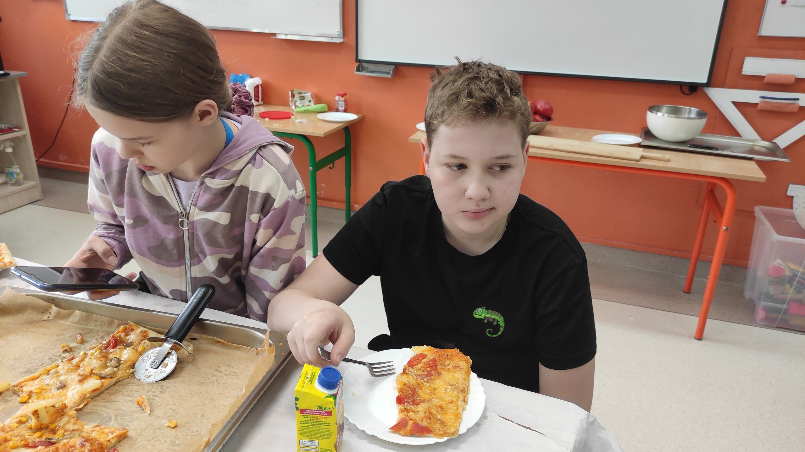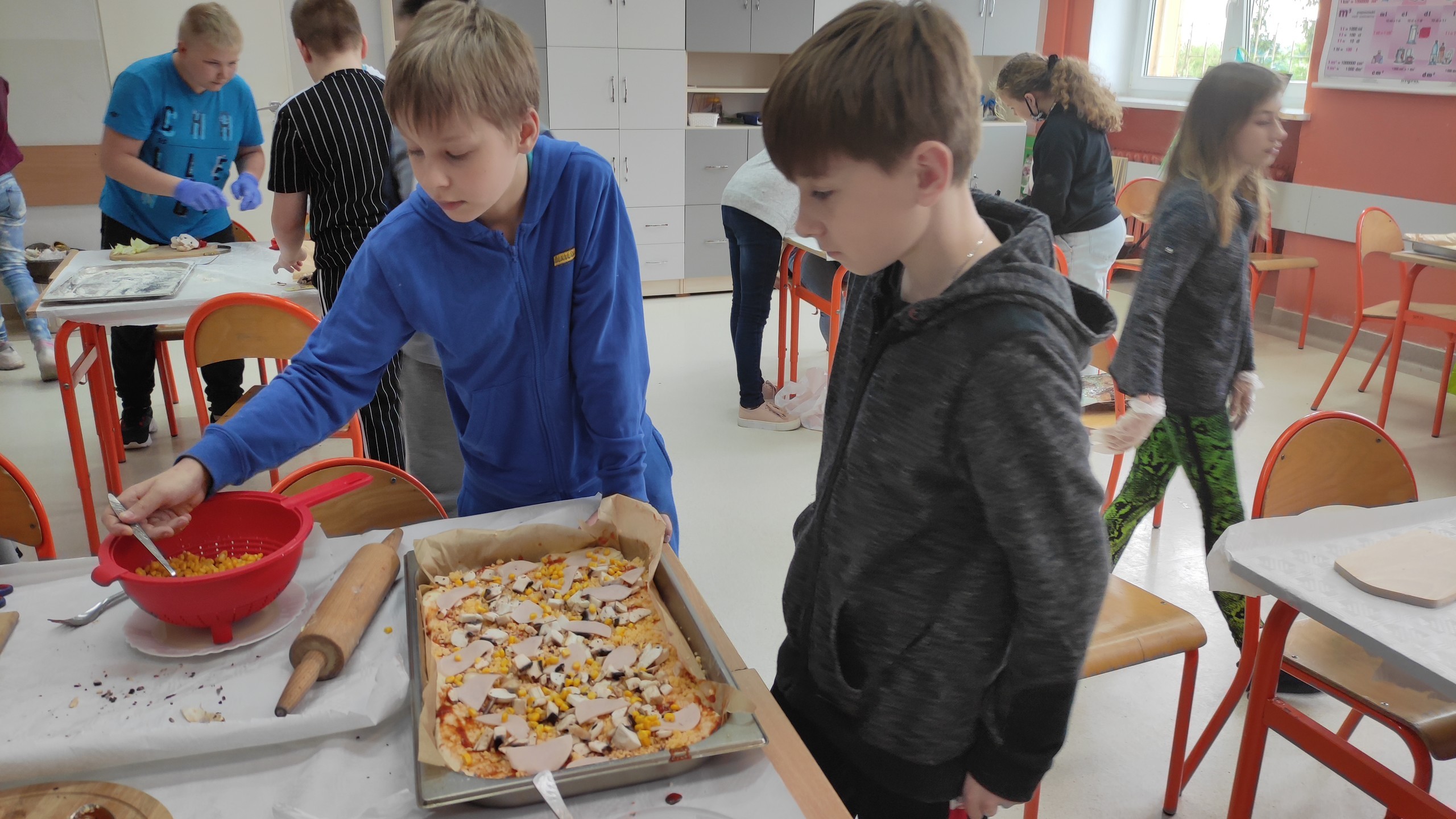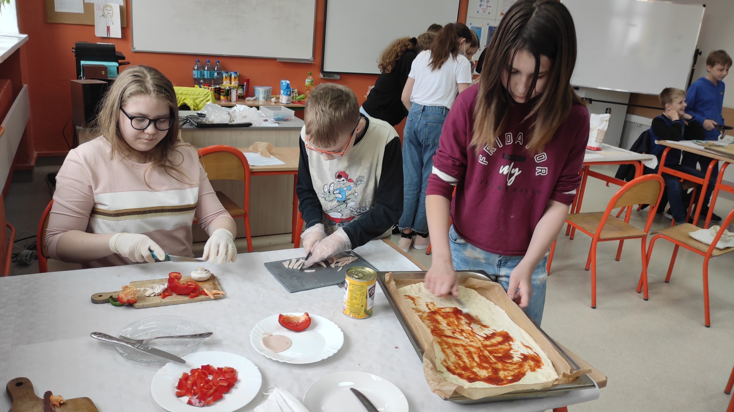 Uczniowie na warsztatach wykonywali praktyczne obliczenia, wykorzystali grę matematyczną z ułamkami oraz zo najważniejsze wykonali i upiekli pizzę według zaszyfrowanego przepisu.