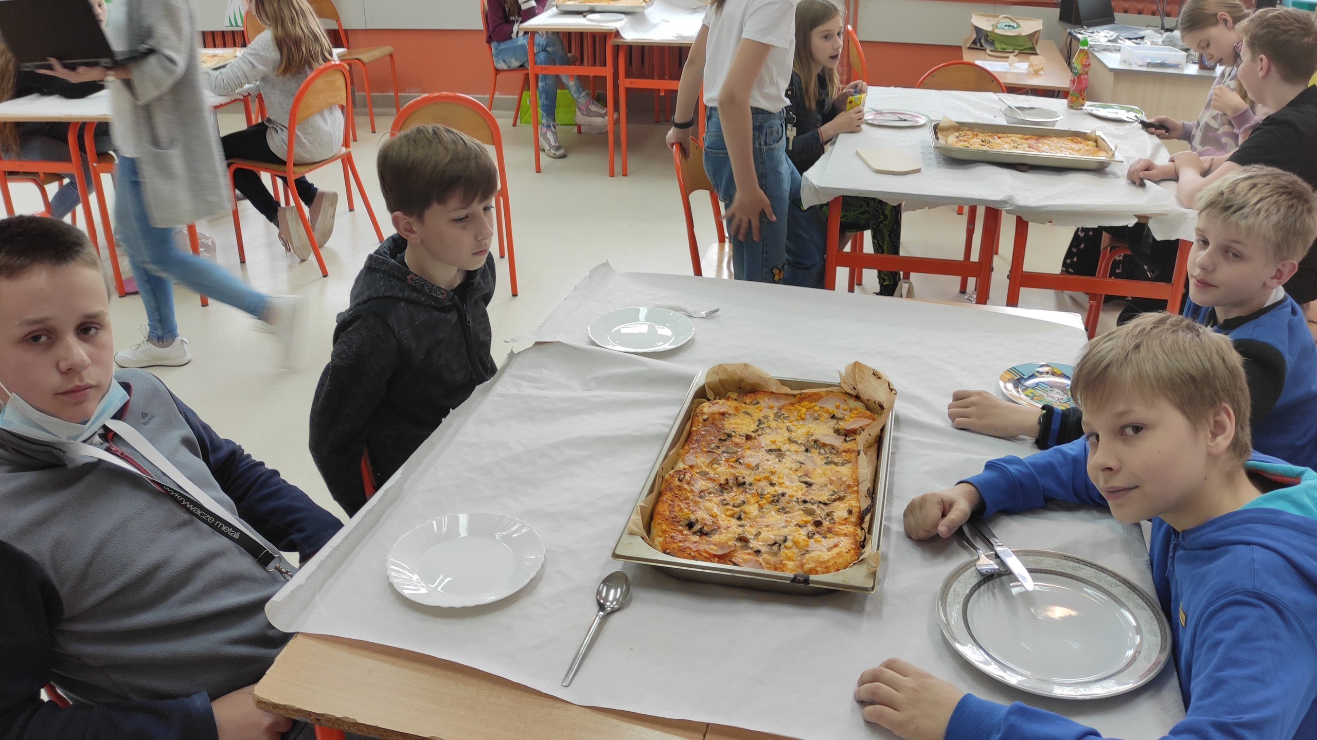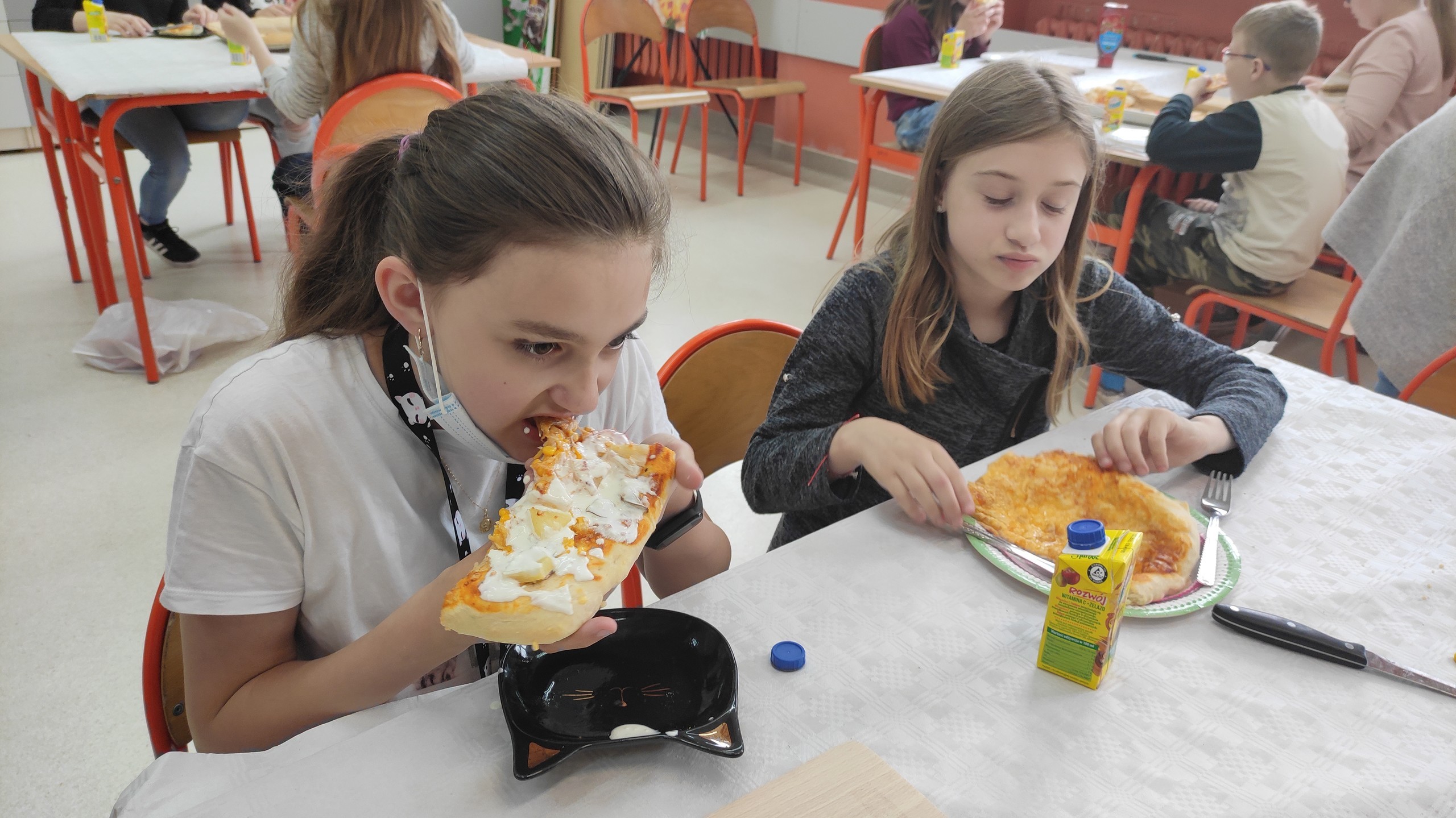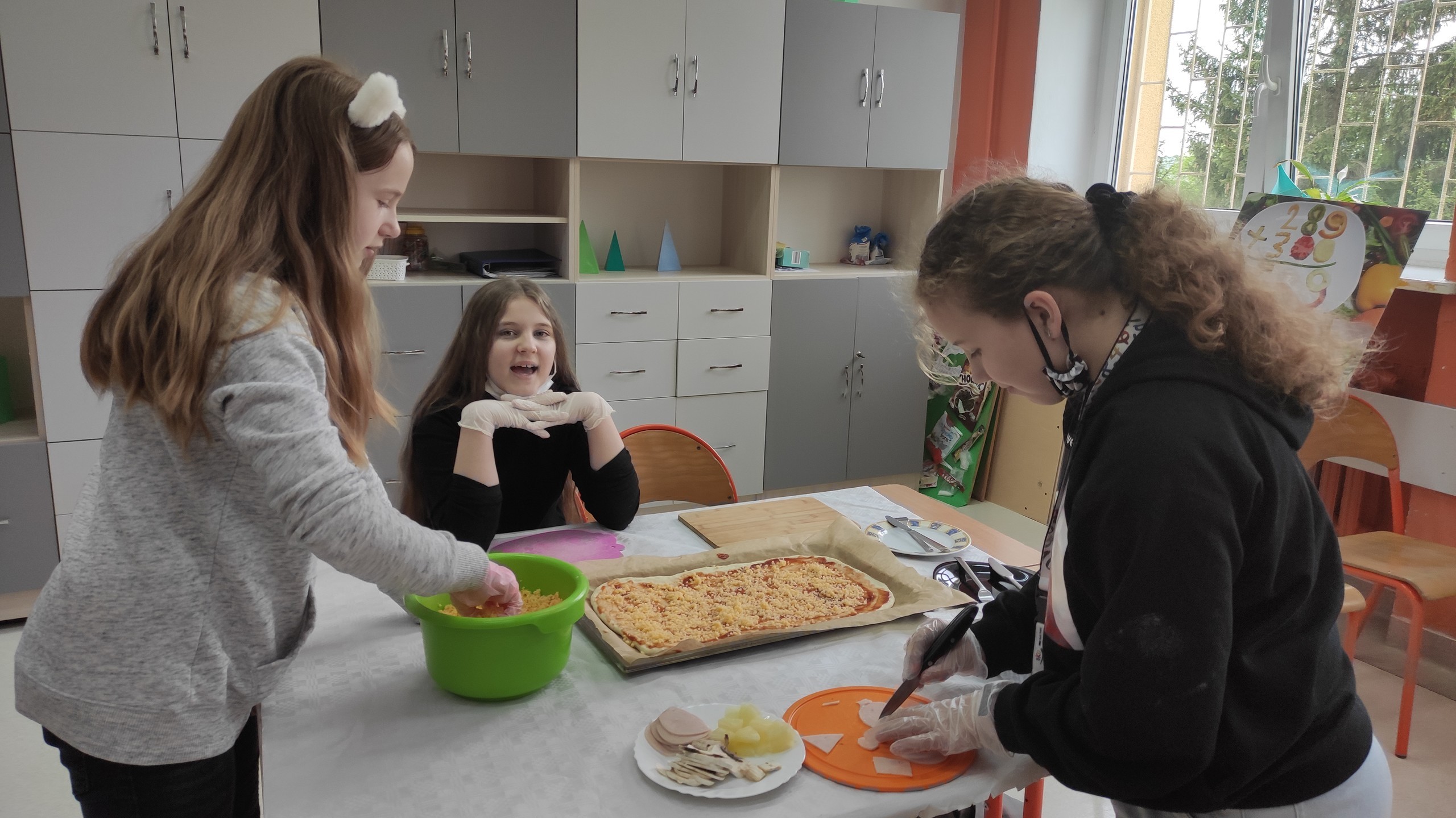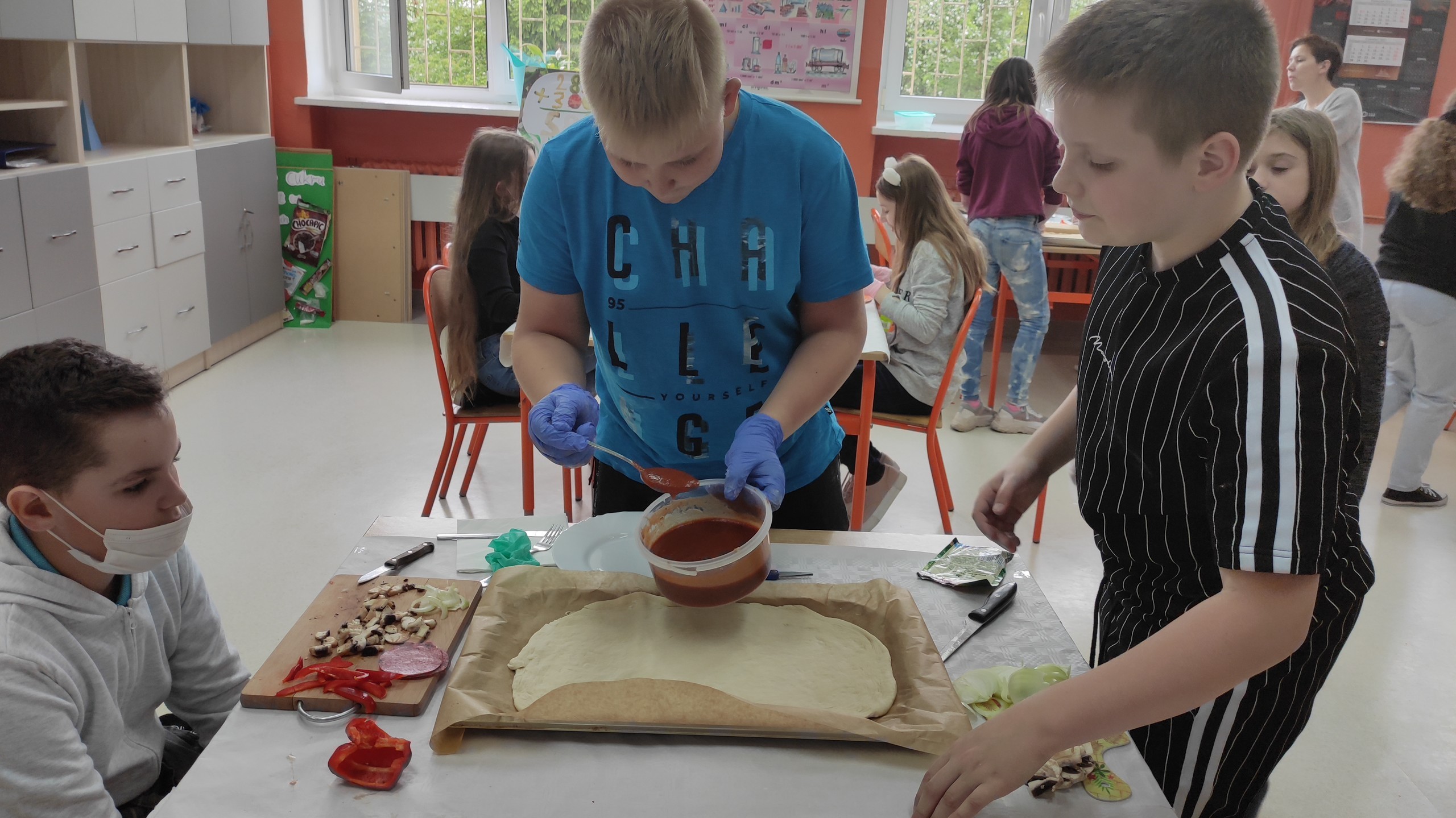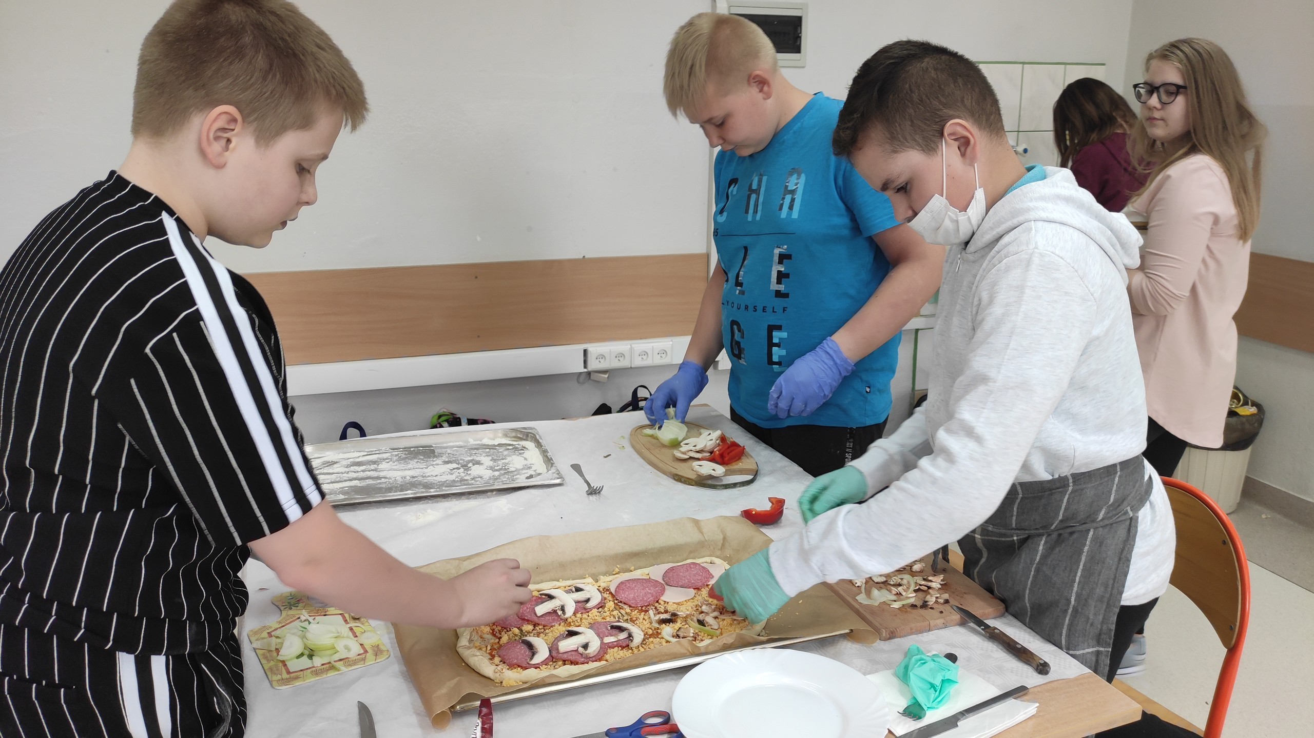 Uczniowie na warsztatach wykonywali praktyczne obliczenia, wykorzystali grę matematyczną z ułamkami oraz zo najważniejsze wykonali i upiekli pizzę według zaszyfrowanego przepisu.