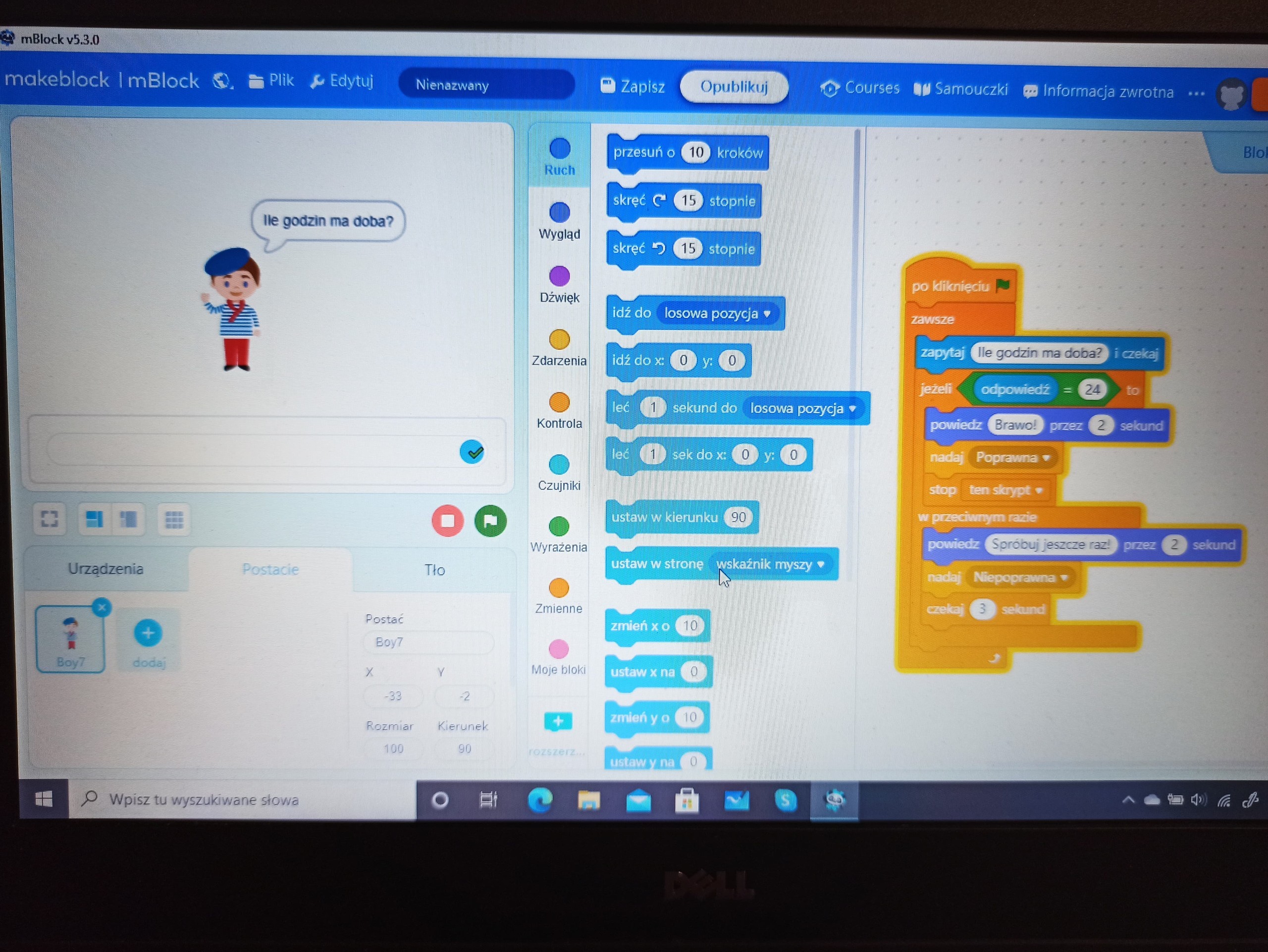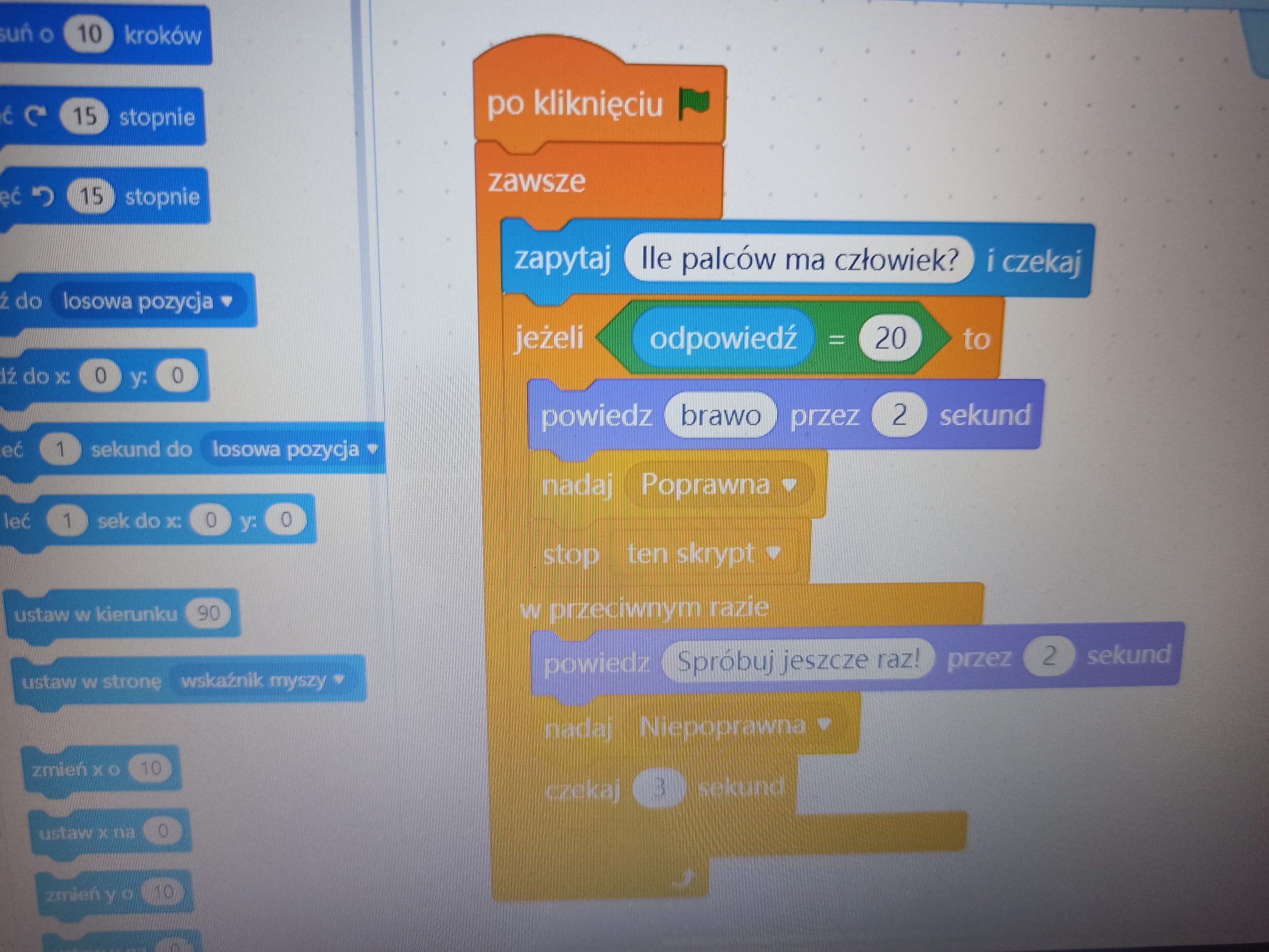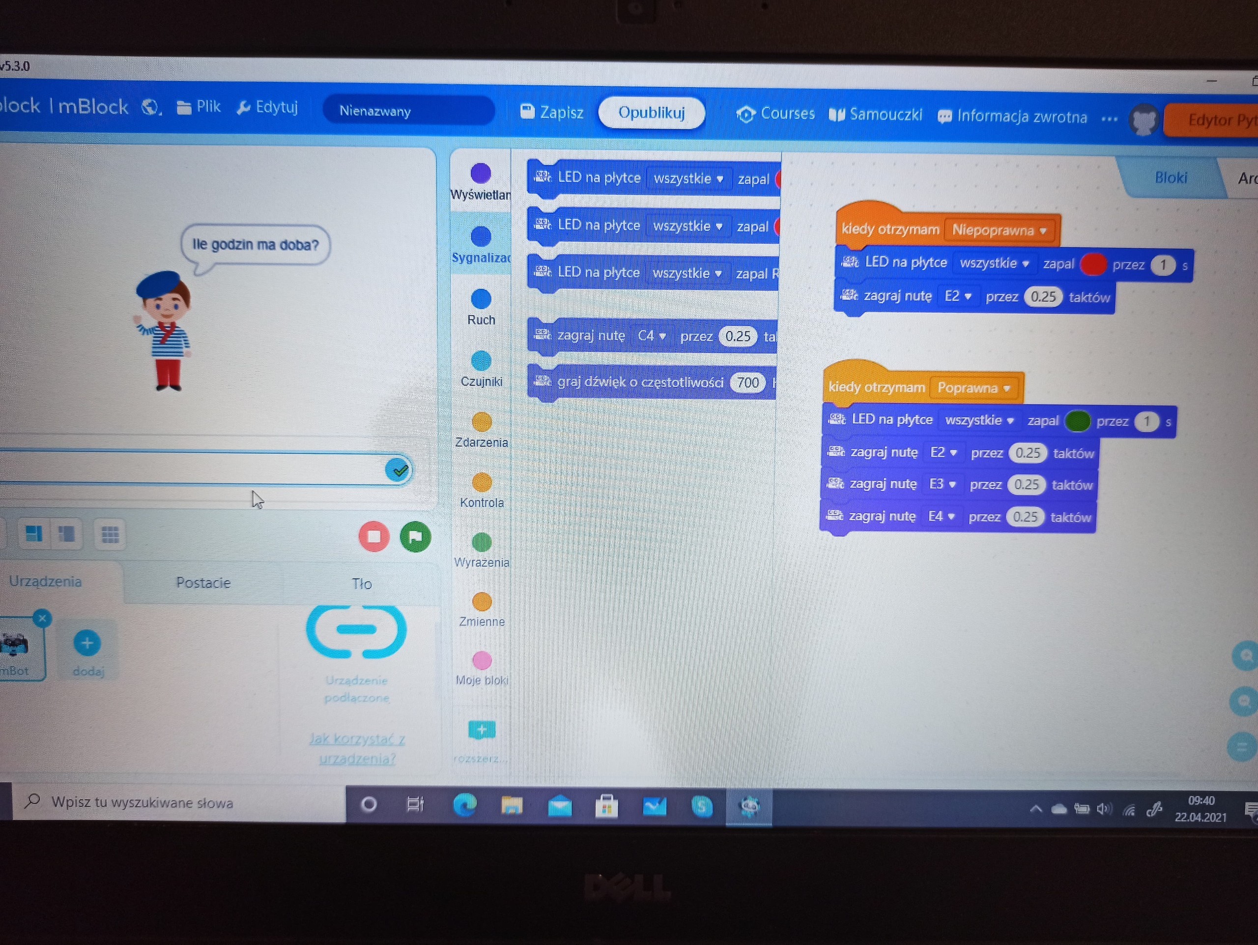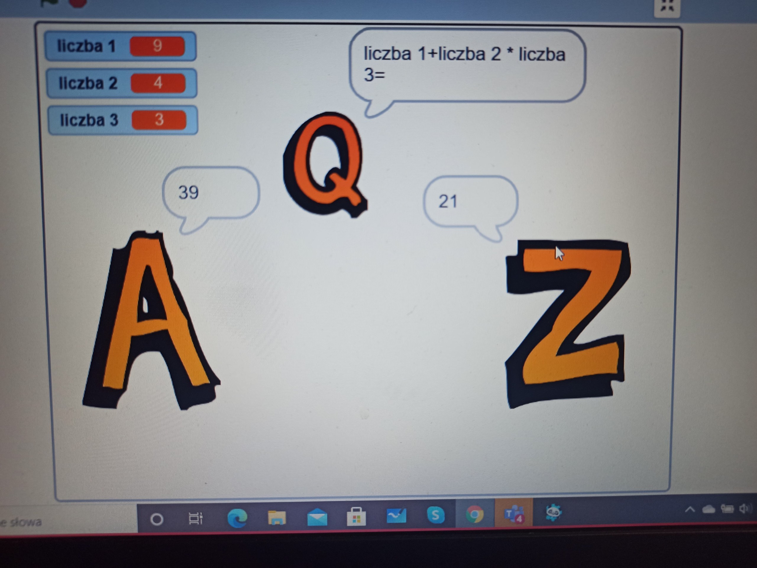 Uczniowie klas 6 podczas lekcji informatyki wspólnie z mBotem odkrywali w jaki sposób stosować bloczki w mBlocku i Scratchu, żeby zapisywać liczby i działania matematyczne. Zapisywali zadania matematyczne. Grali w grę "Kto ma rację? A czy Z? Zastanawiali się, dlaczego literki udzielają innych odpowiedzi. Zagnieżdżali bloczki w taki sposób, aby zachować poprawną kolejność wykonywania działań. Łączyli zadania matematyczne ze skryptem robota.