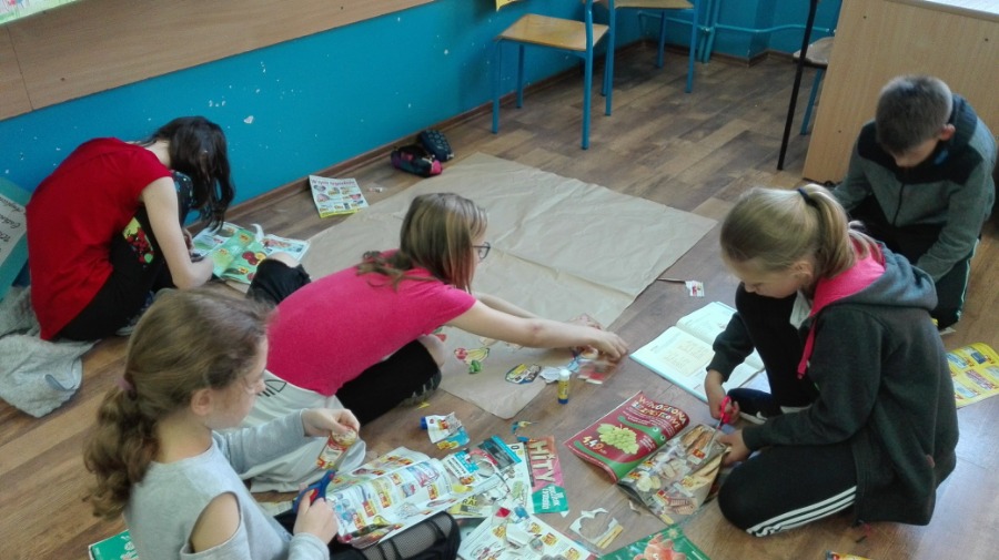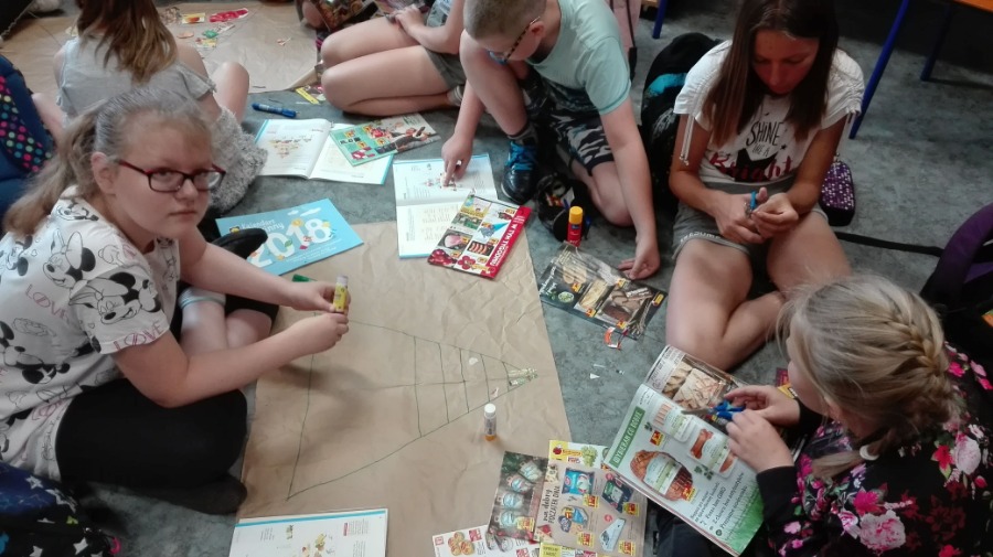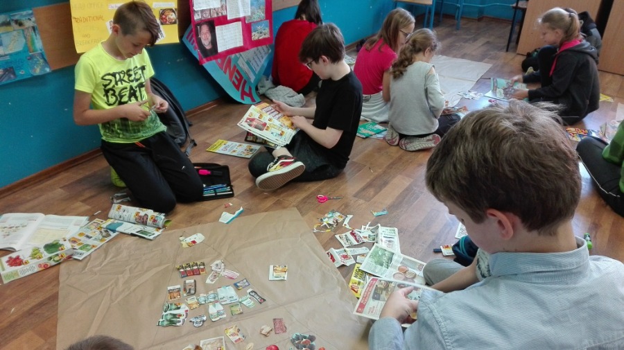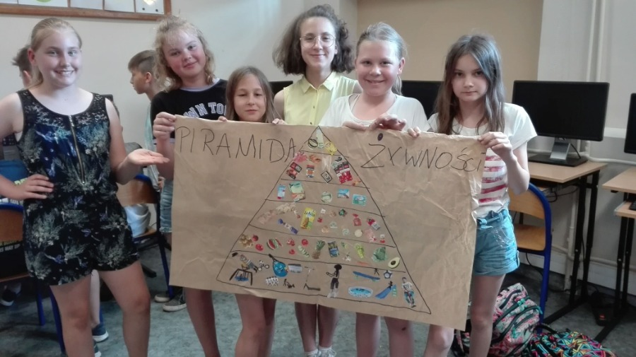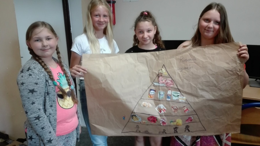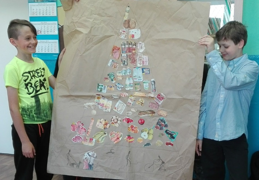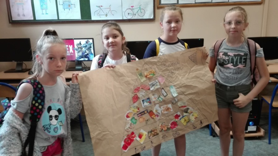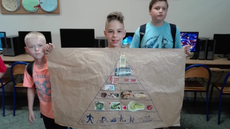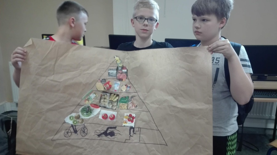 Uczniowie klas 5 podczas zajęć technicznych uczyli się pracować w grupach poznając zasady zdrowego żywienia.