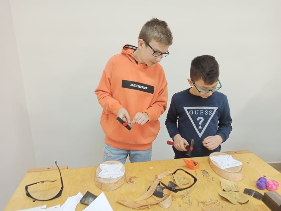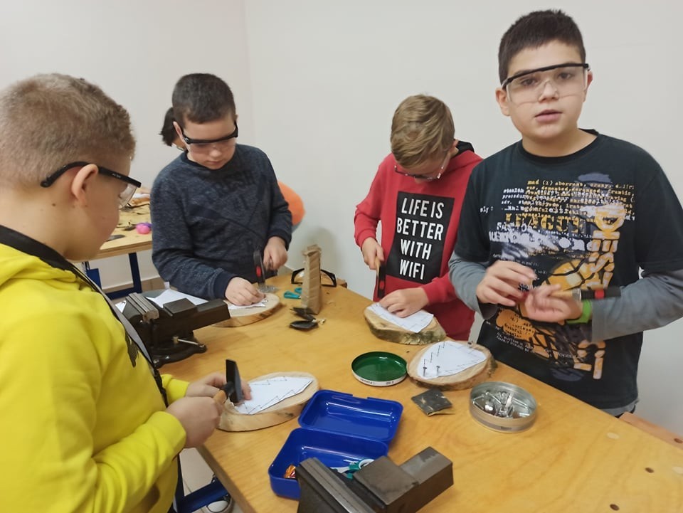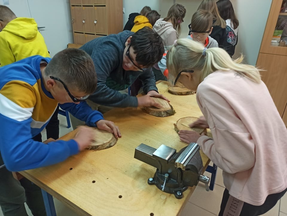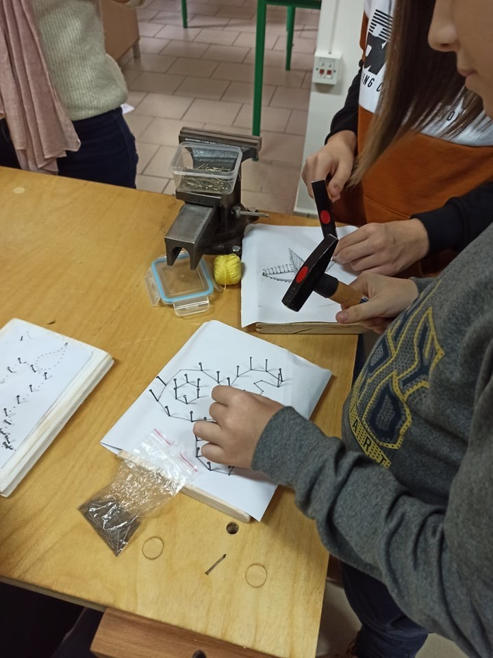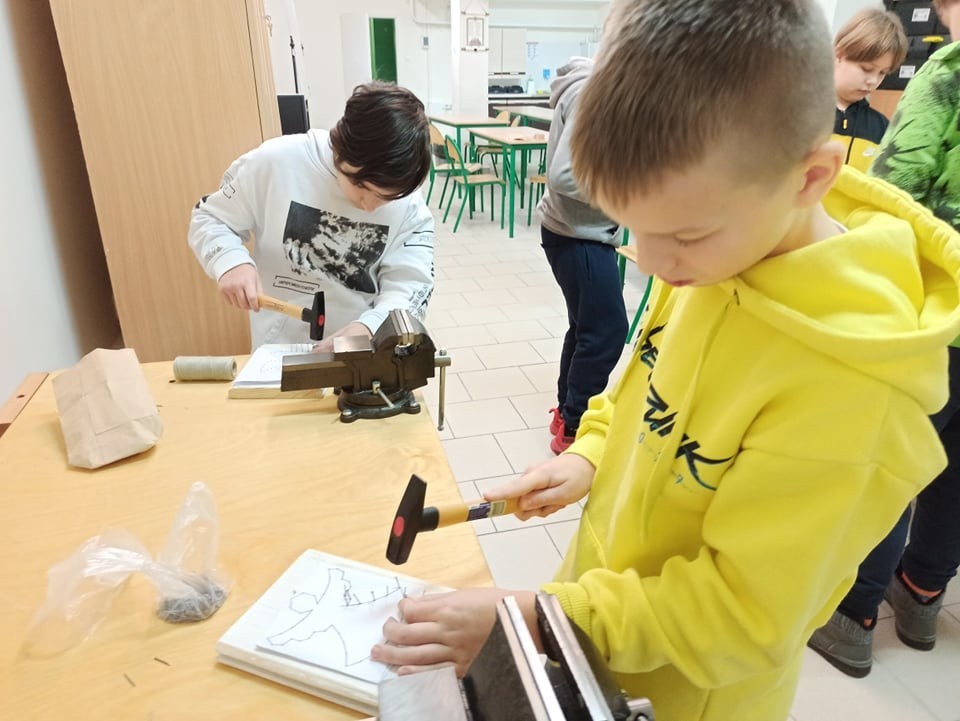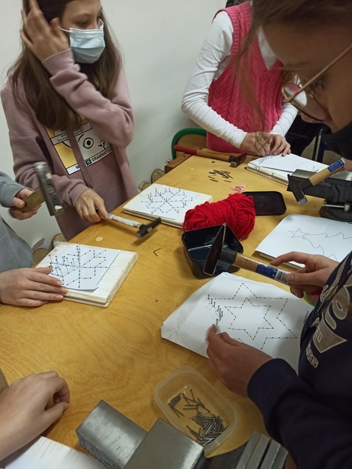 Uczniowie klas 5a i 5b podczas zajęć technicznych pracują w nowej pracowni technicznej. Robimy piękne obrazki z drewna techniką string art.