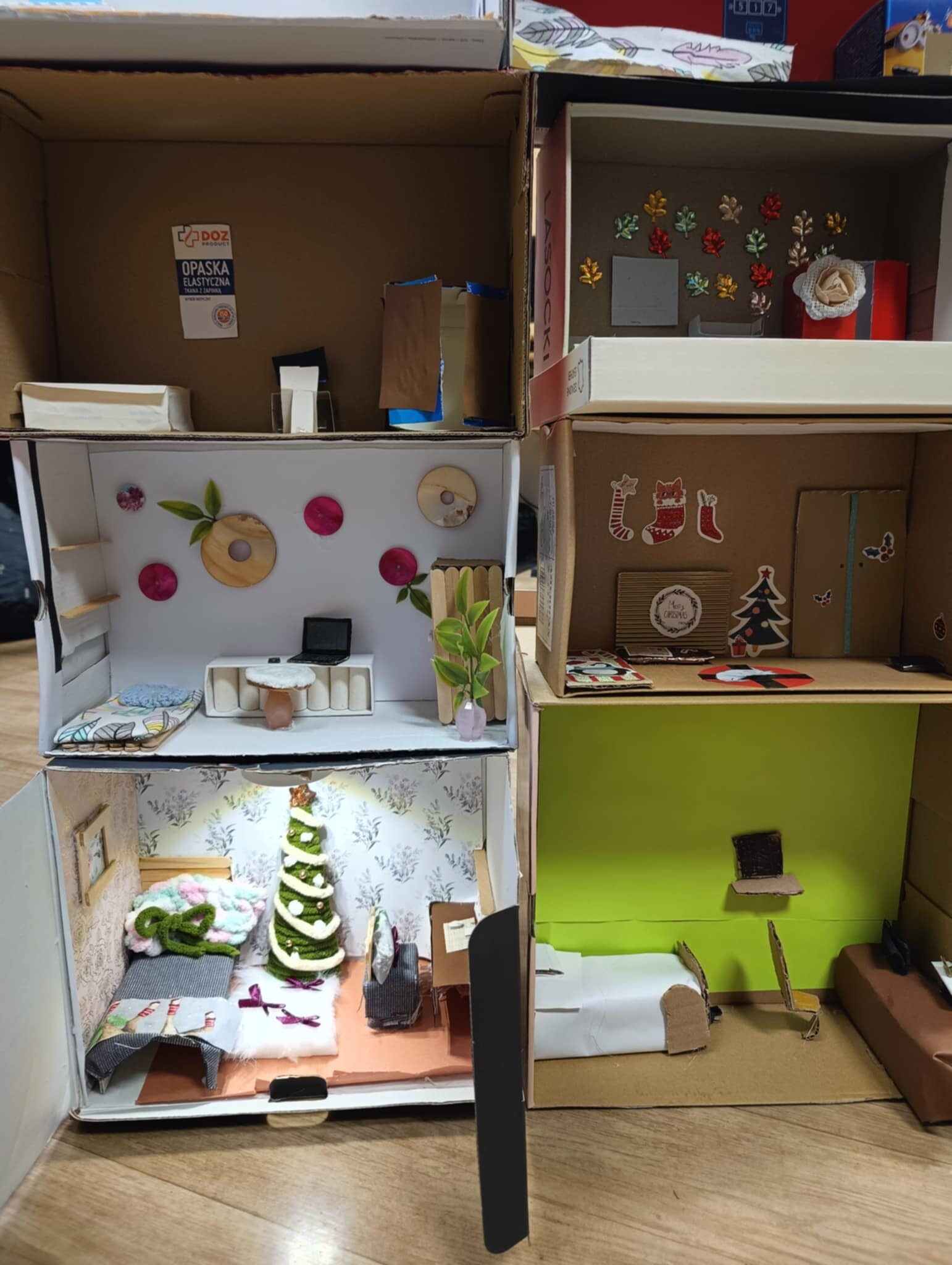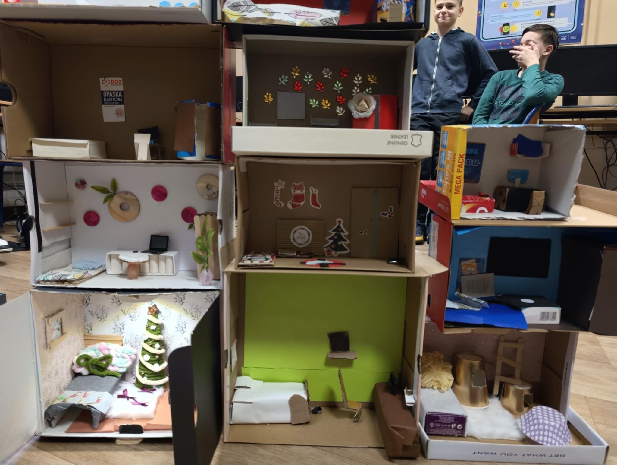 Podczas lekcji techniki uczniowie klas 6 mieli okazję rozwinąć swoje umiejętności projektowe i manualne, tworząc modele pokoi nastolatków z kartonu. Zadanie to wymagało nie tylko precyzji i zaangażowania, ale także kreatywności w aranżacji przestrzeni. Efektem pracy uczniów były oryginalne projekty, które odzwierciedlały różnorodne pomysły i indywidualne inspiracje. Lekcje te była doskonałym połączeniem nauki, zabawy i rozwijania wyobraźni przestrzennej.